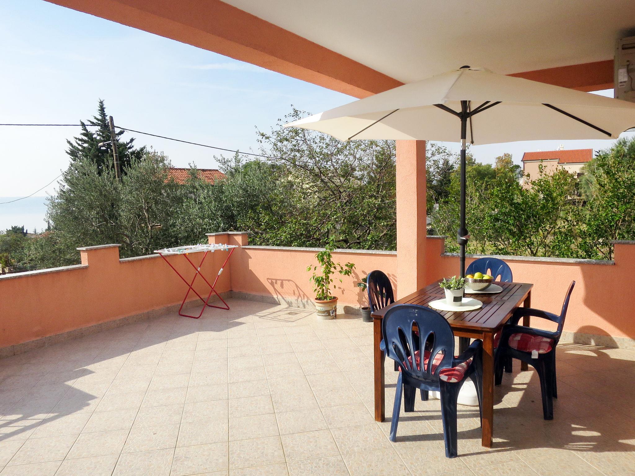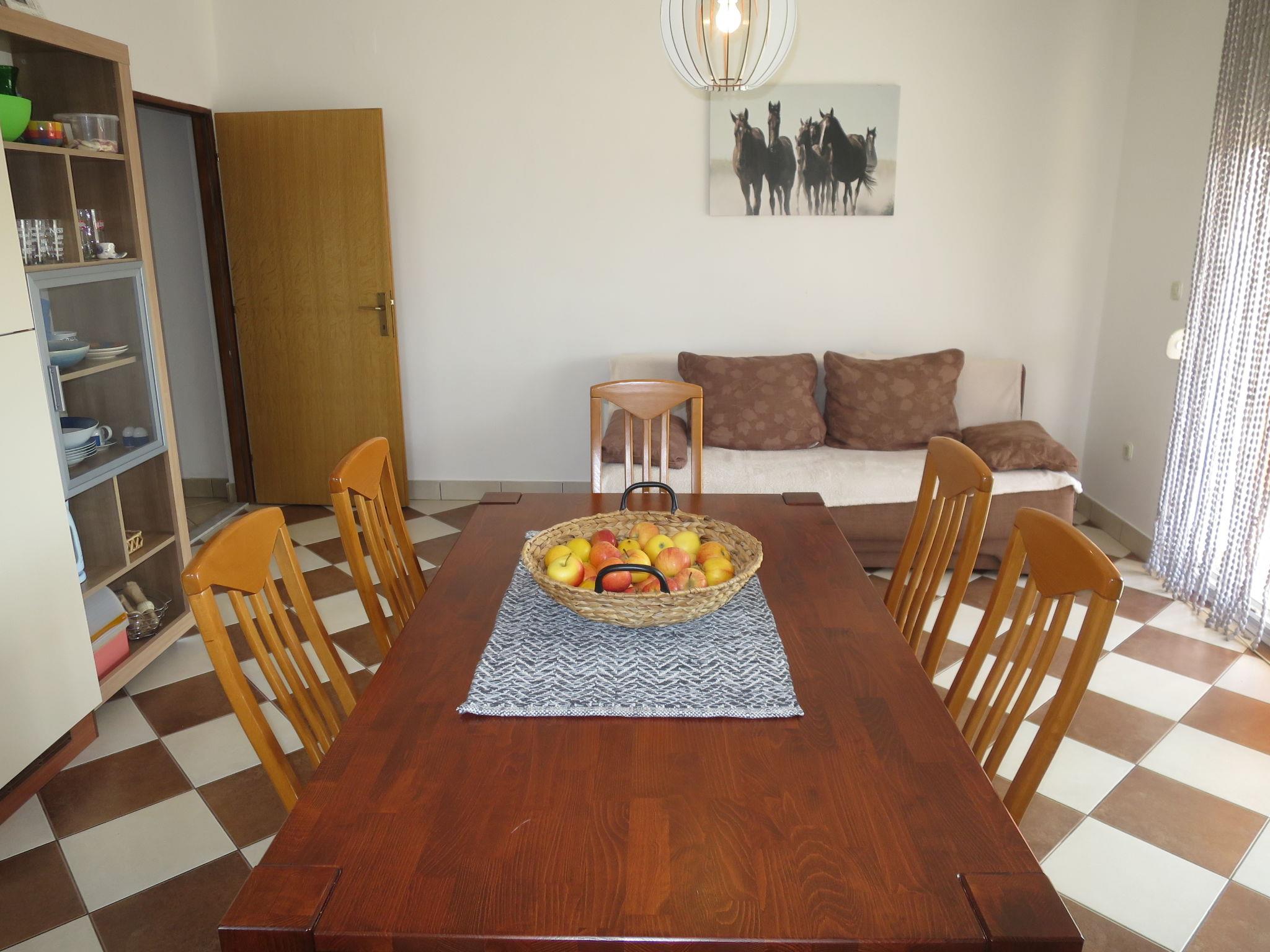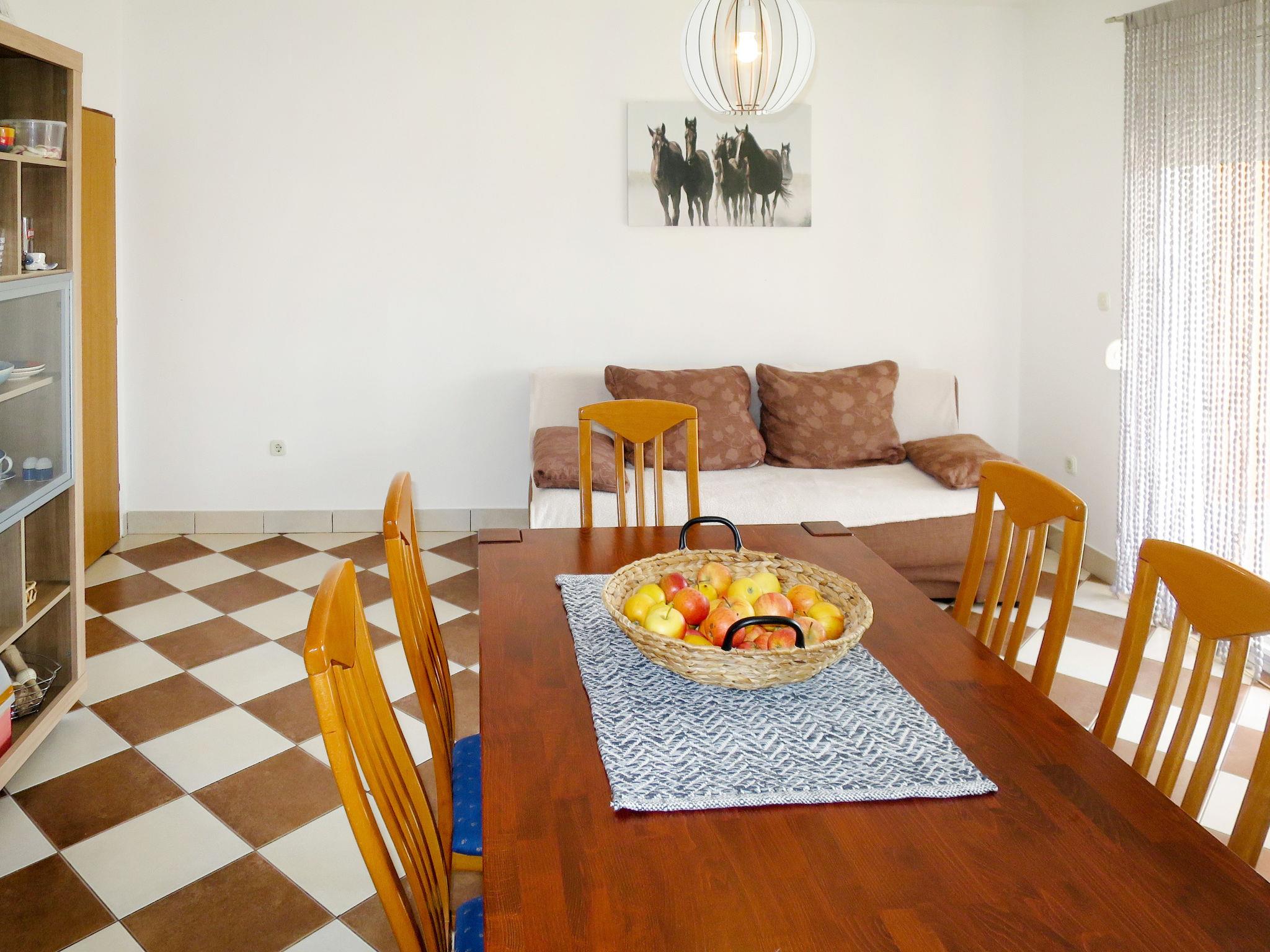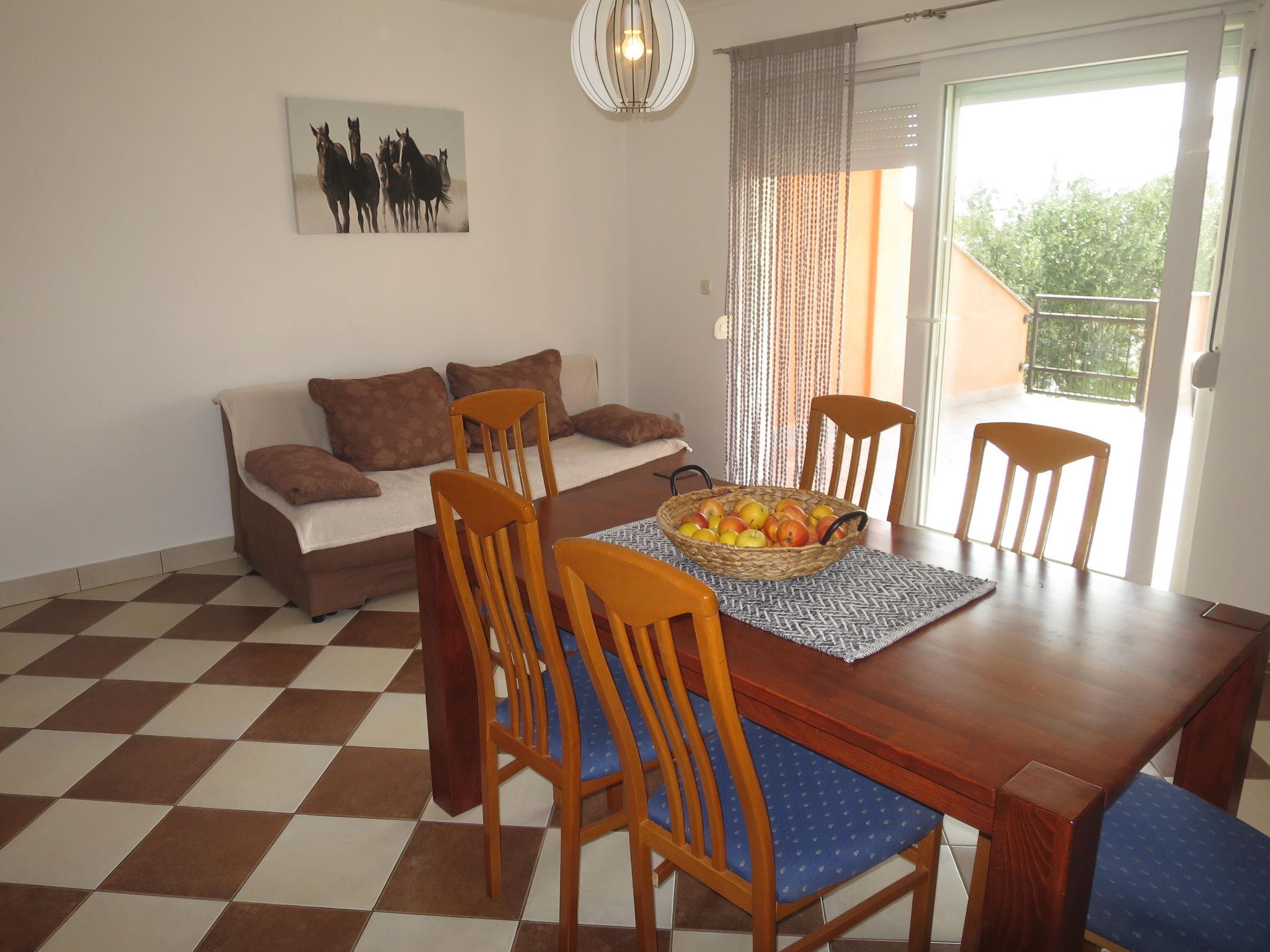 "Tomislav", 3-room apartment 60 m2, on the upper ground floor. Living/dining room with 1 double sofabed (160 cm, length 200 cm), satellite TV and air conditioning. Exit to the terrace. 1 room with 2 beds (90 cm, length 200 cm). 1 room with 1 french bed (160 cm, length 200 cm). Open kitchen (1 hot plate, oven, 3 gas rings, toaster, kettle, microwave, freezer, electric coffee machine). Shower/WC. No heating option. Terrace 30 m2. Terrace furniture. Facilities: washing machine. Internet (WiFi, free). KLASA: UP/I-335-03/20-01/2658; URBROJ: 2198/1-19-0