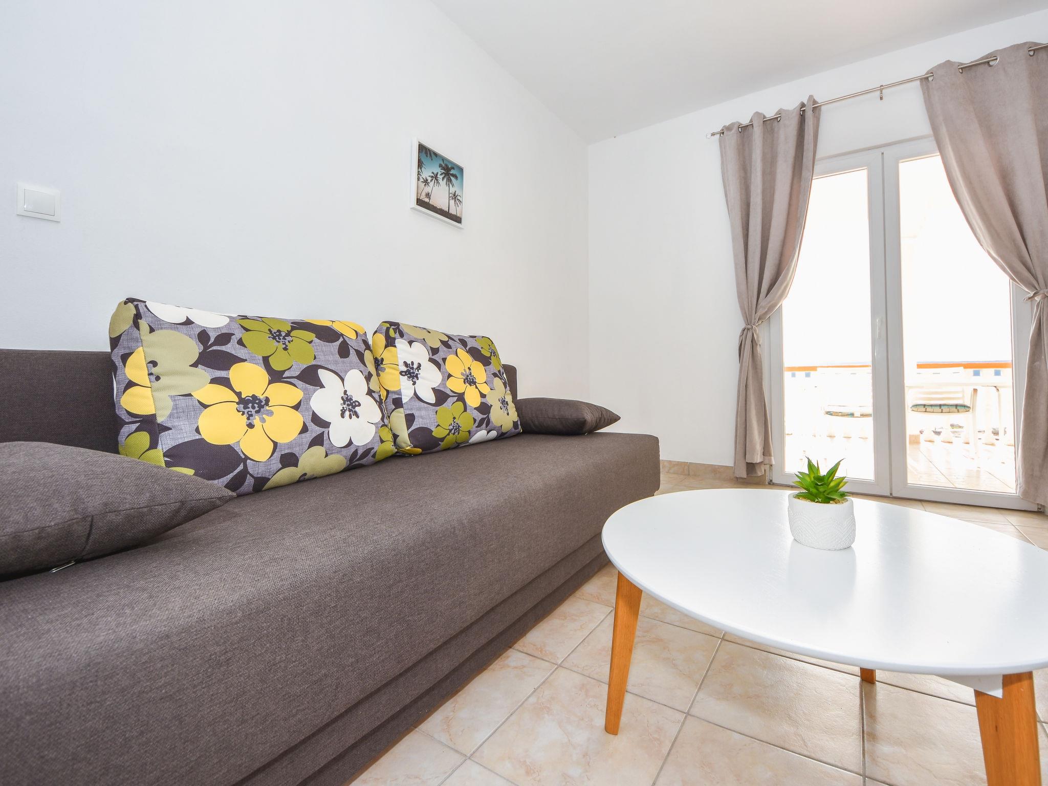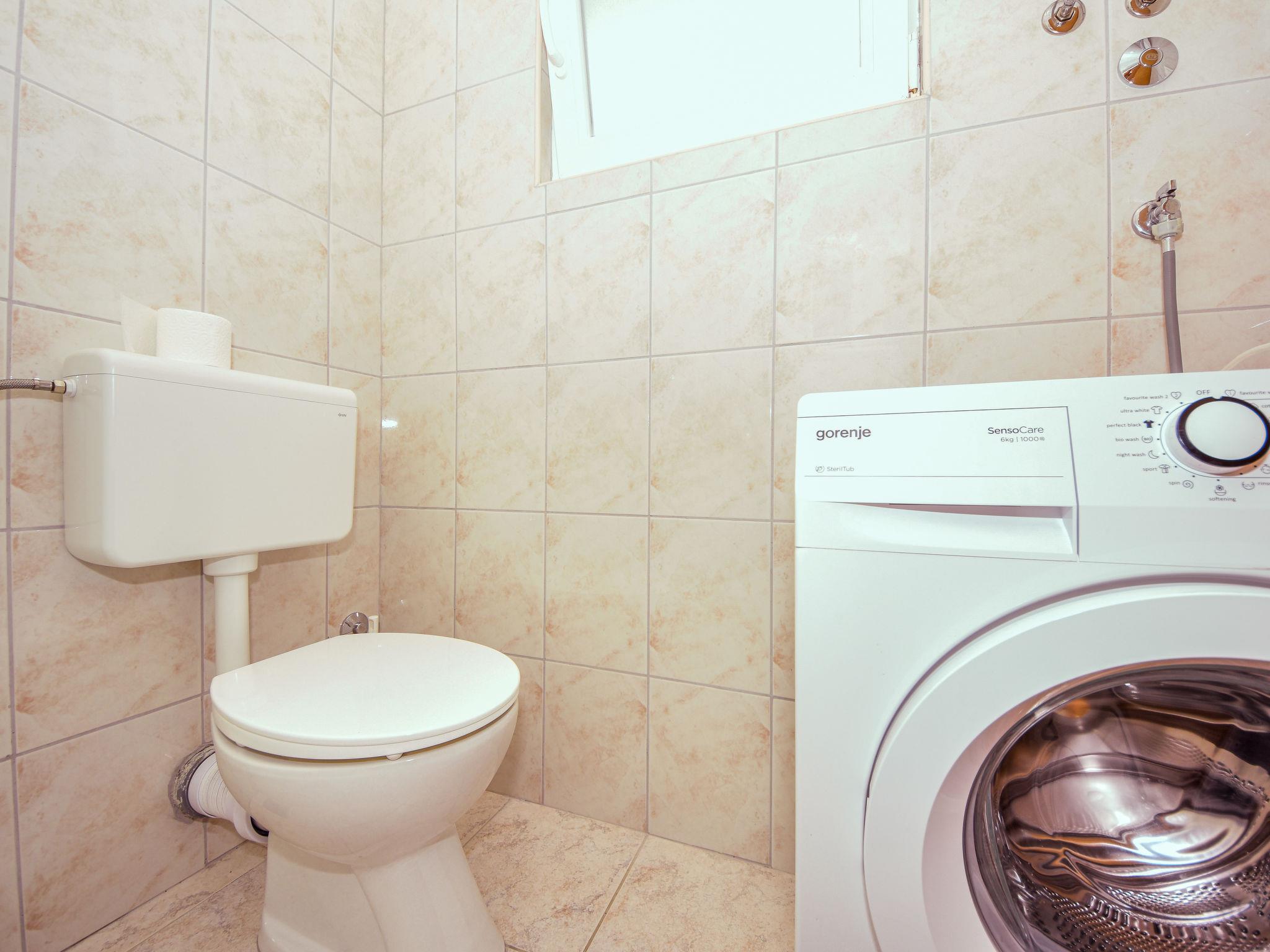 4-room apartment 100 m2 on 1st floor, south-west facing position. Living/dining room 30 m2 with 1 sofabed (120 cm, length 200 cm), kitchen corner and satellite TV (flat screen), air conditioning. Exit to the terrace. 1 room with 1 french bed (140 cm, length 200 cm). Living/dining room 30 m2 with 1 sofabed (120 cm, length 200 cm). Exit to the terrace. 1 room with 1 french bed (140 cm, length 200 cm). Open kitchen (oven, 4 ceramic glass hob hotplates, microwave, freezer). 2 showers/WC. No heating option. Terrace 40 m2, roofed, terrace 30 m2, roofed. Terrace furniture. View of the sea. Facilities: washing machine. Internet (WiFi, free). The apartment consists of 2 apartments on the first floor, rented as one unit. Each apartment with living/dining area, open kitchen and 1 bedroom.