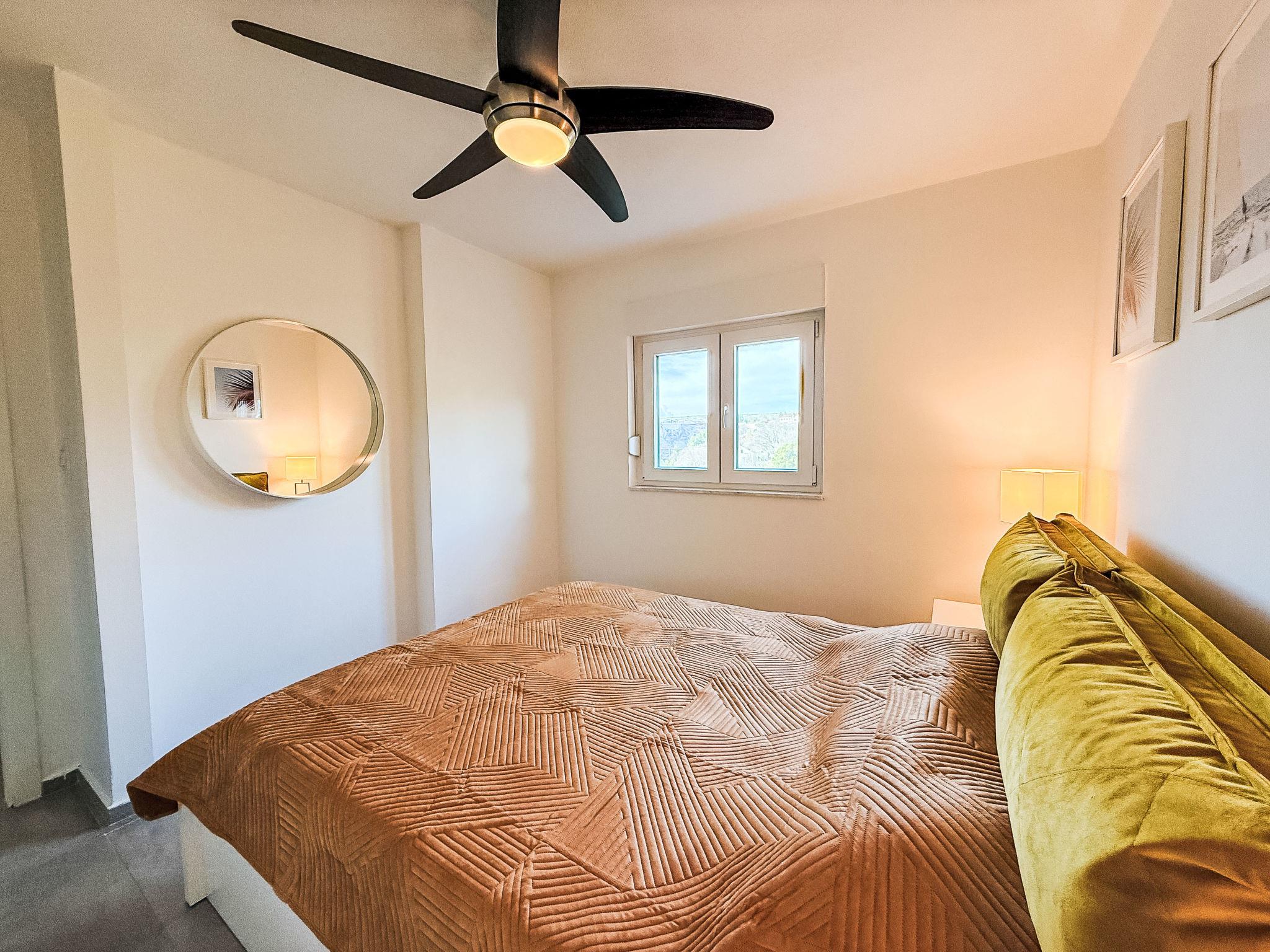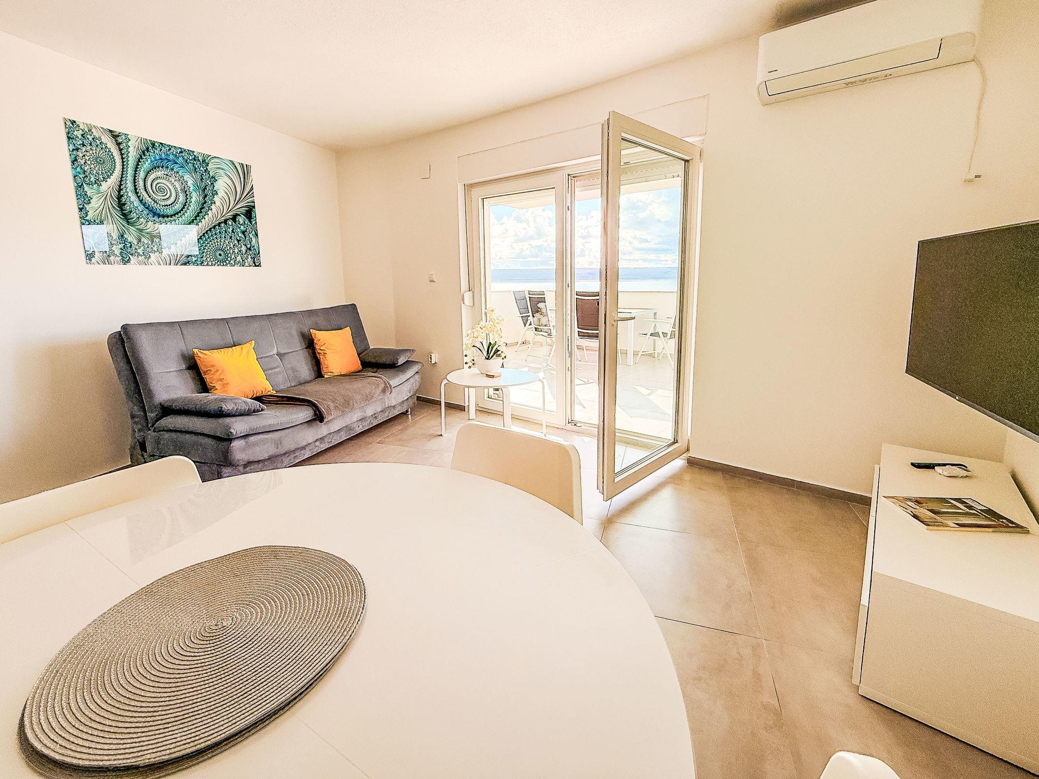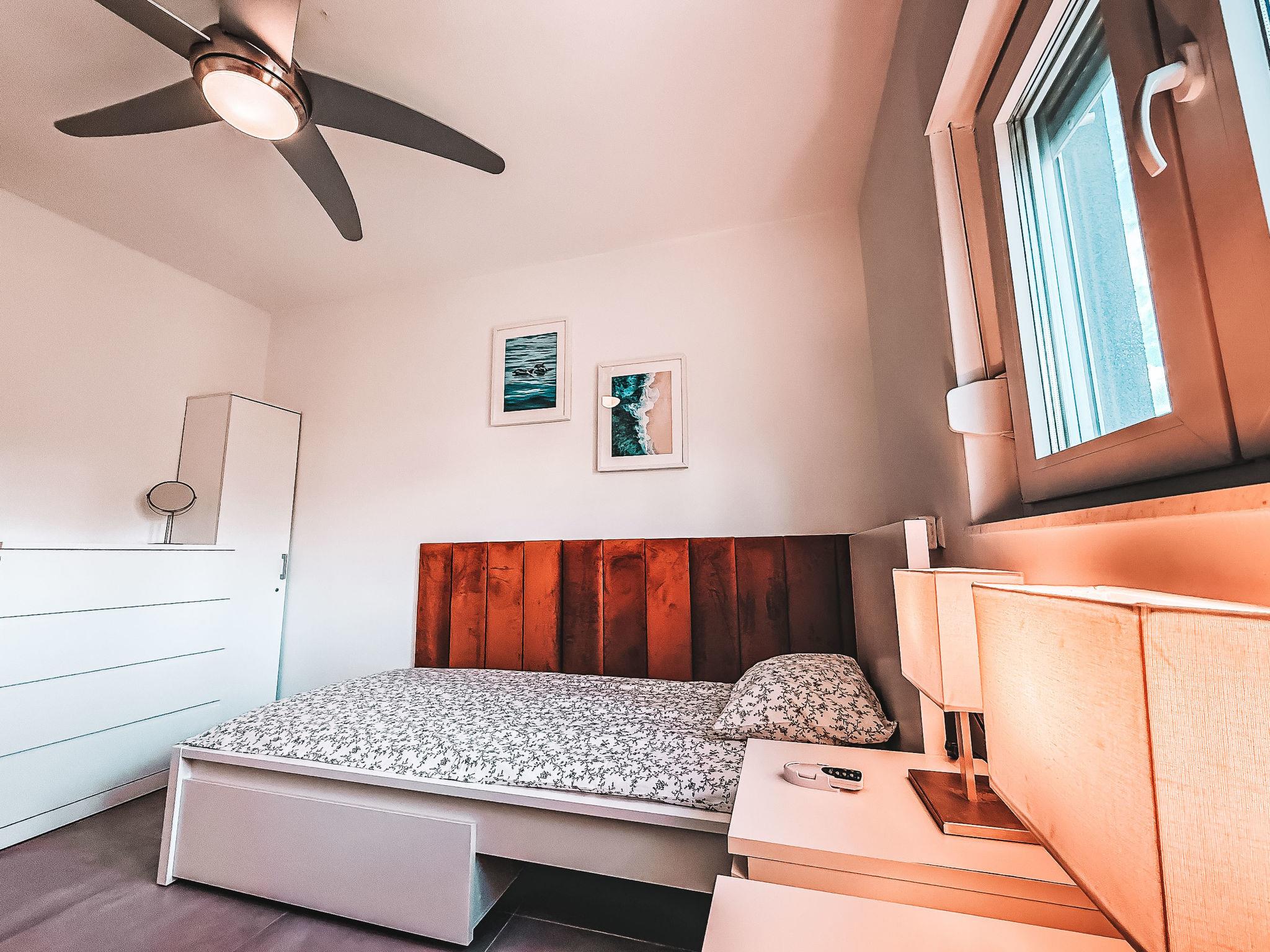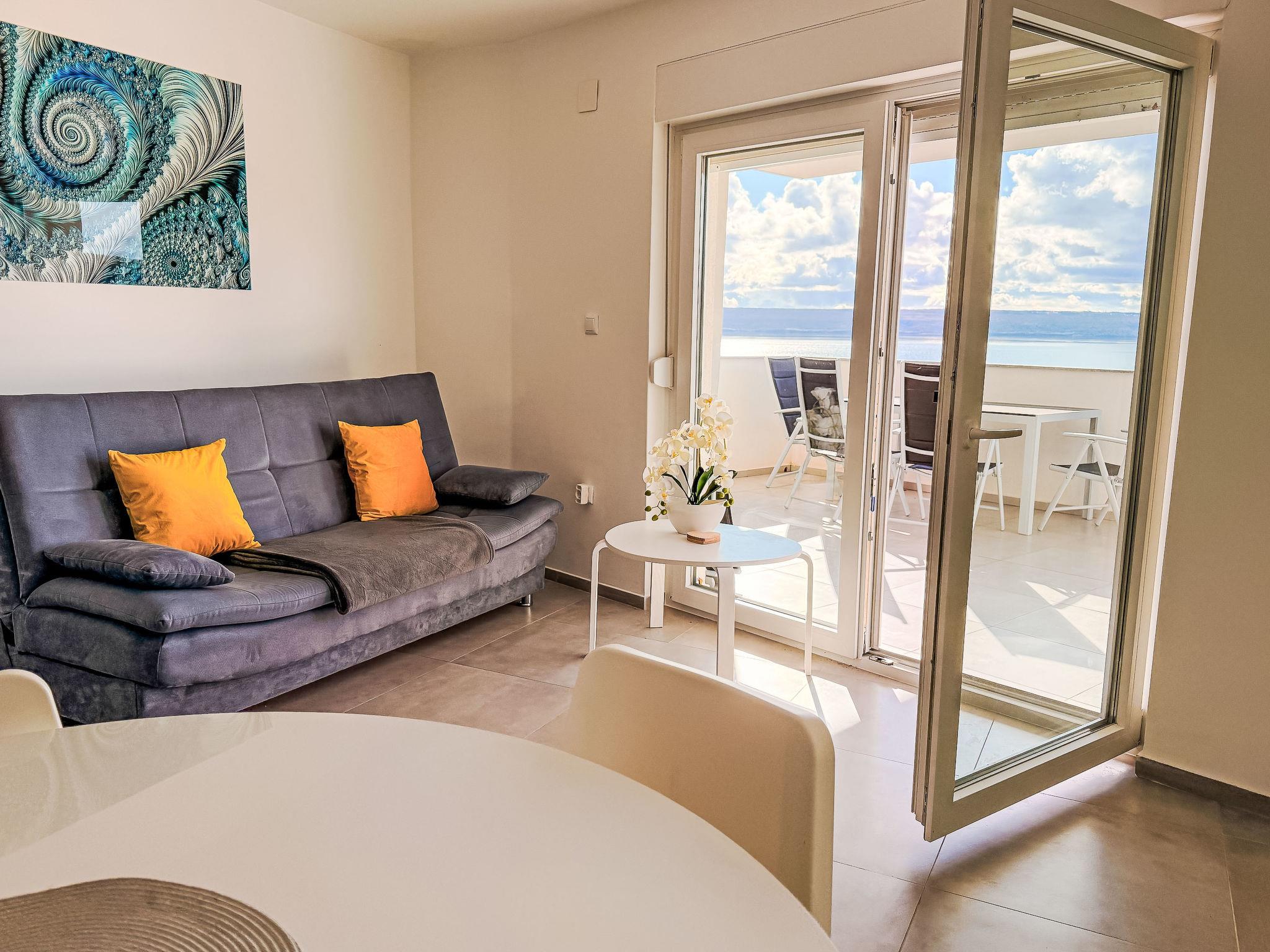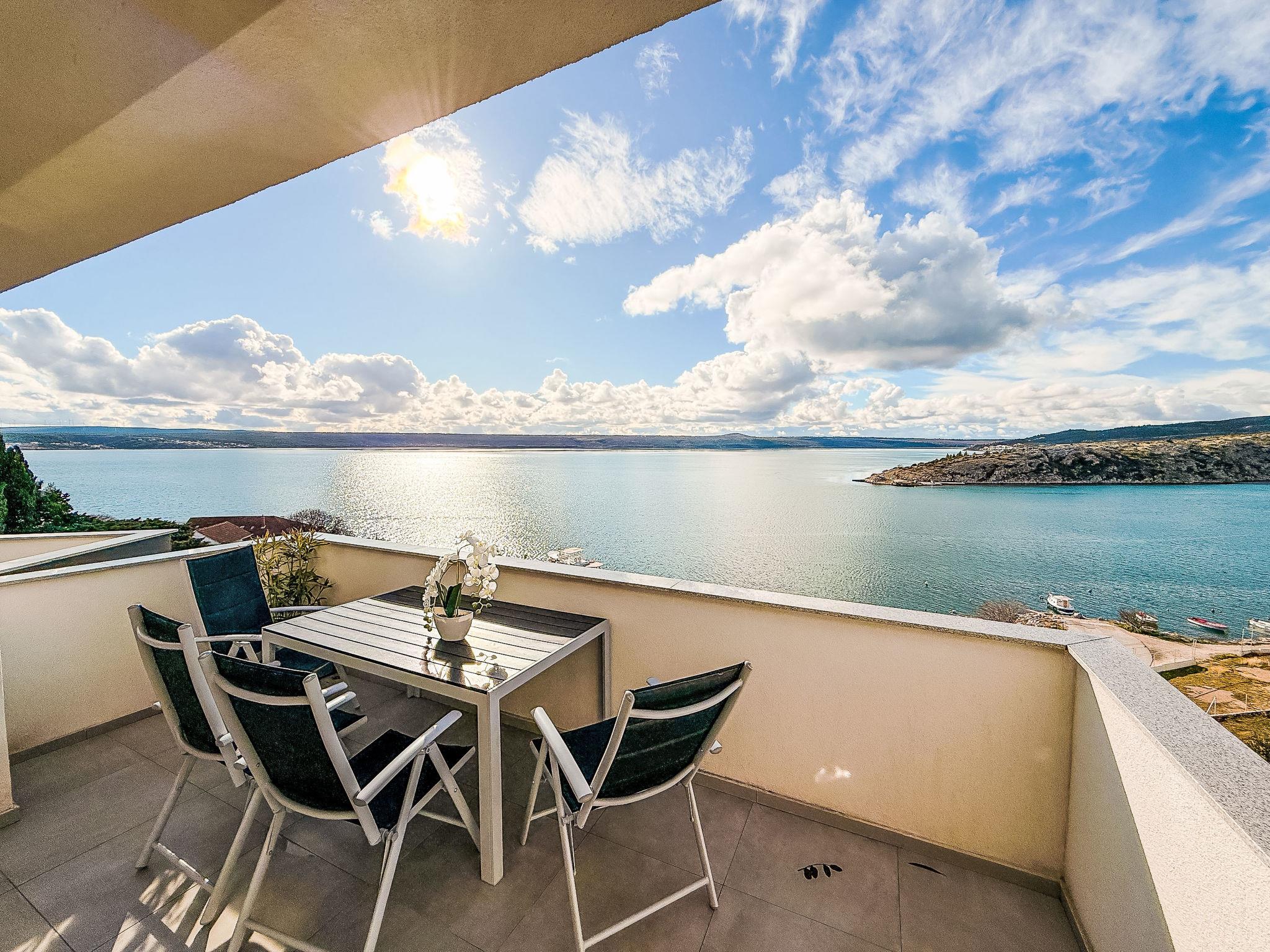 3-room apartment 50 m2 on 1st floor, south-west facing position. Living/dining room 30 m2 with satellite TV (flat screen), air conditioning. Exit to the terrace. 1 room with 2 beds (90 cm, length 200 cm), fan. 1 room with 1 french bed (160 cm, length 200 cm), fan. Open kitchen (oven, dishwasher, 4 ceramic glass hob hotplates, microwave, freezer). Shower/WC. No heating option. Terrace 12 m2, roofed. Terrace furniture. Panoramic view of the sea. Facilities: washing machine. Internet (WiFi, free).