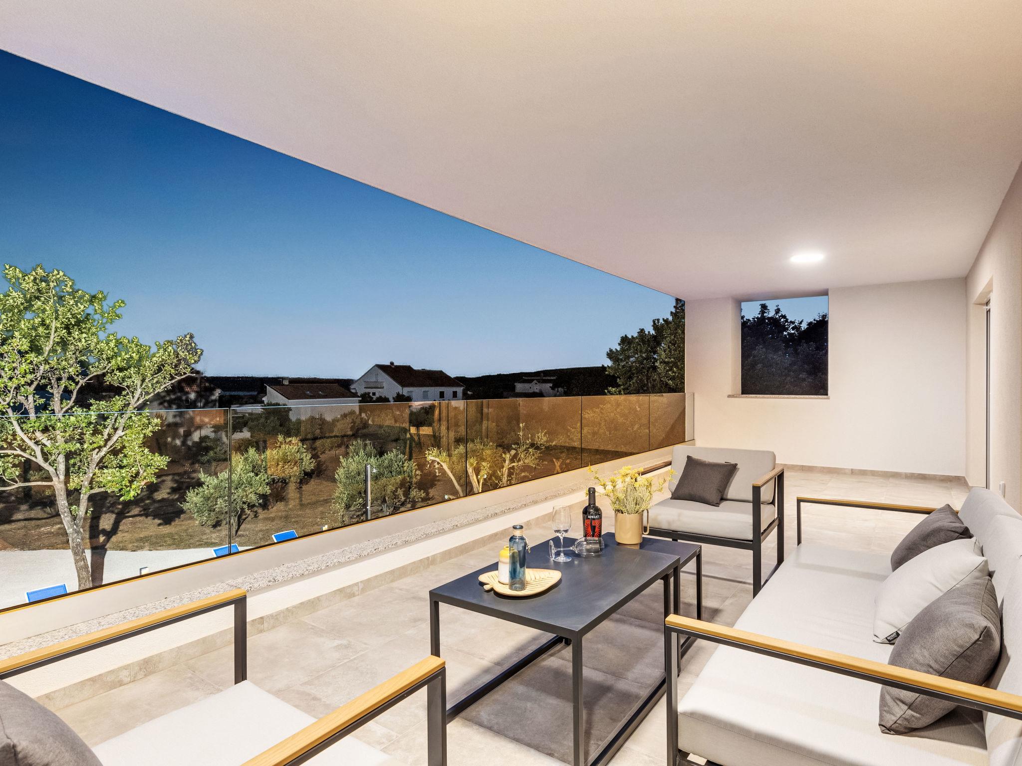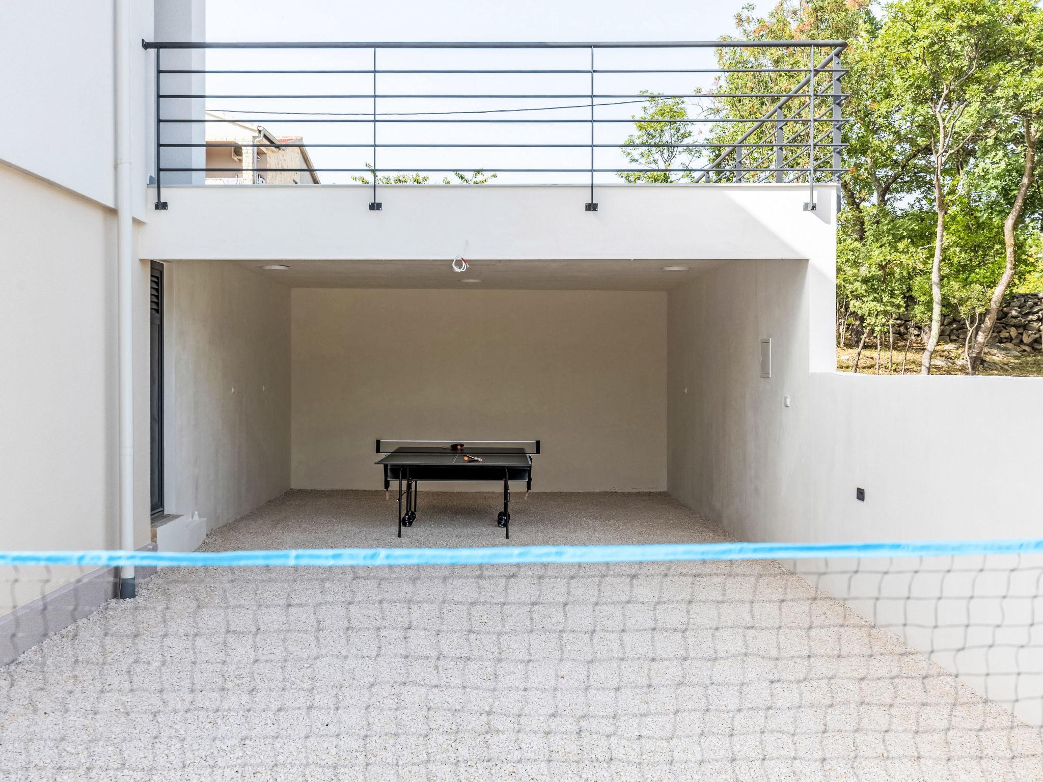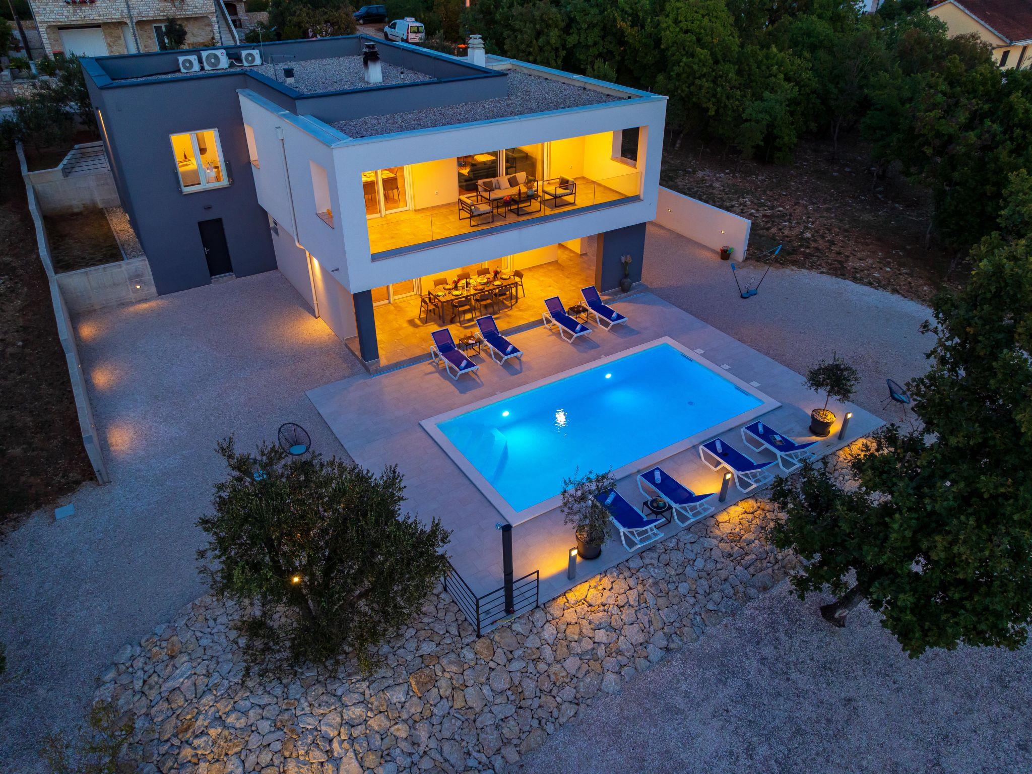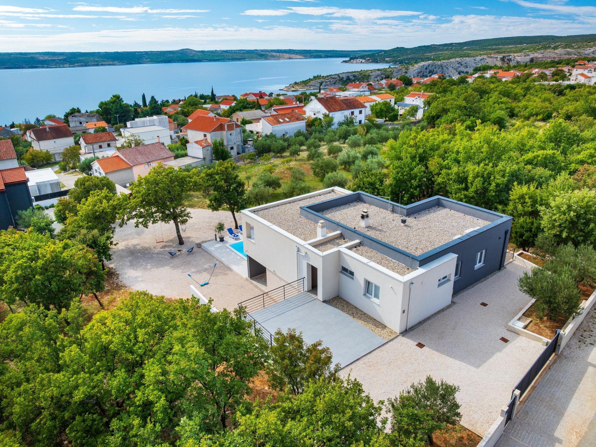 Modern villa "Green & Blue", 2 storeys, built in 2022. 28 km from the centre of Zadar, in a sunny, elevated position, 600 m from the sea, 600 m from the beach, located by a road. Private: property 9'000 m2 (fenced), swimming pool angular (8 x 4 m, depth 150 cm, seasonal availability: 15.May. - 15.Oct.). Outdoor shower, table tennis, garden furniture, barbecue, children's playground (slide, swing). In the house: internet access, billiard table, washing machine. Parking (for 3 cars) at the house on the premises. Shop 1 km, restaurant 1.5 km, bus stop 1.5 km, pebble beach, shingle beach 600 m. Nearby attractions: NP Paklenica 17 km, Rafting Zrmanja 35 km. The owner does not accept any youth groups.