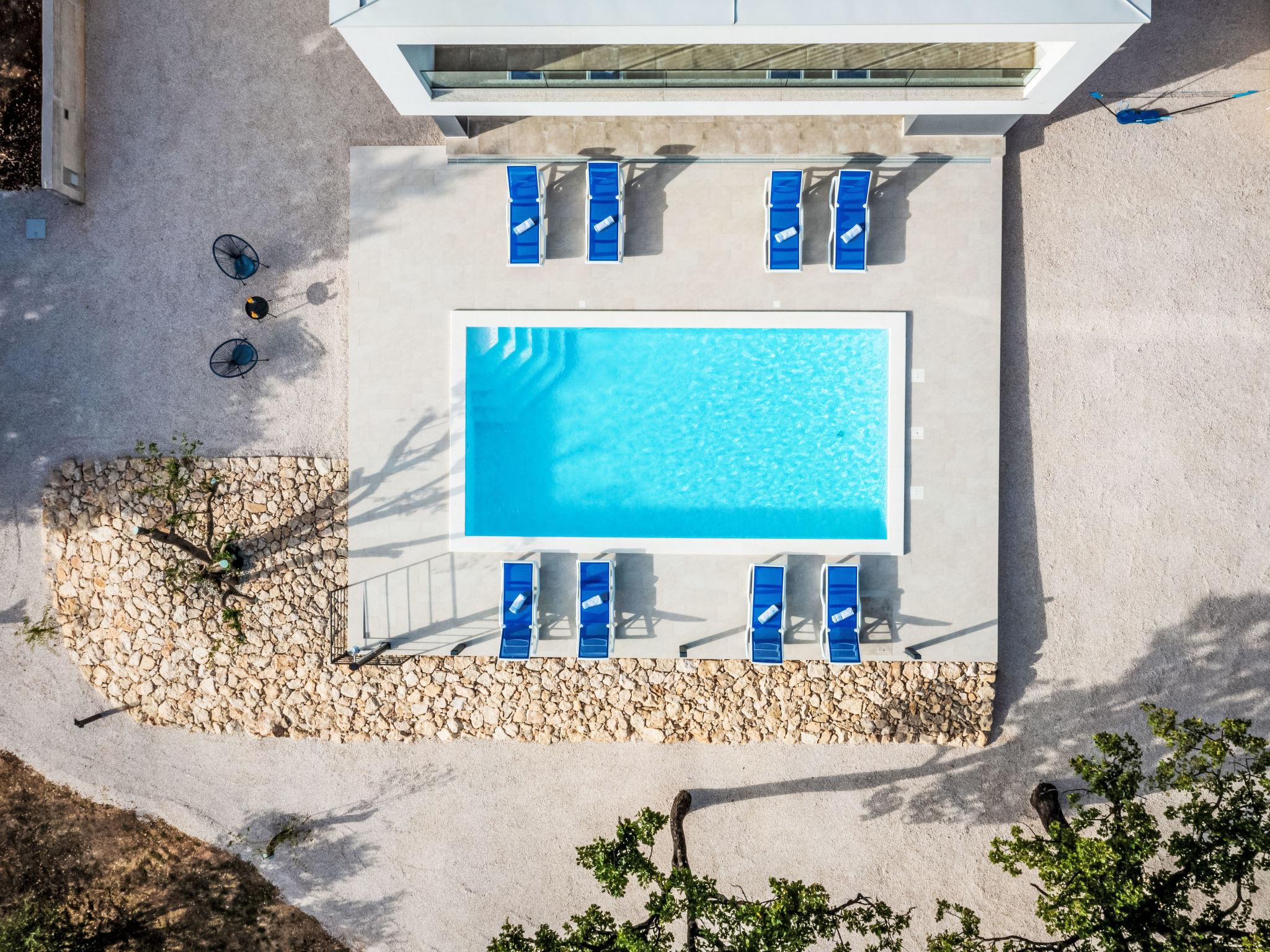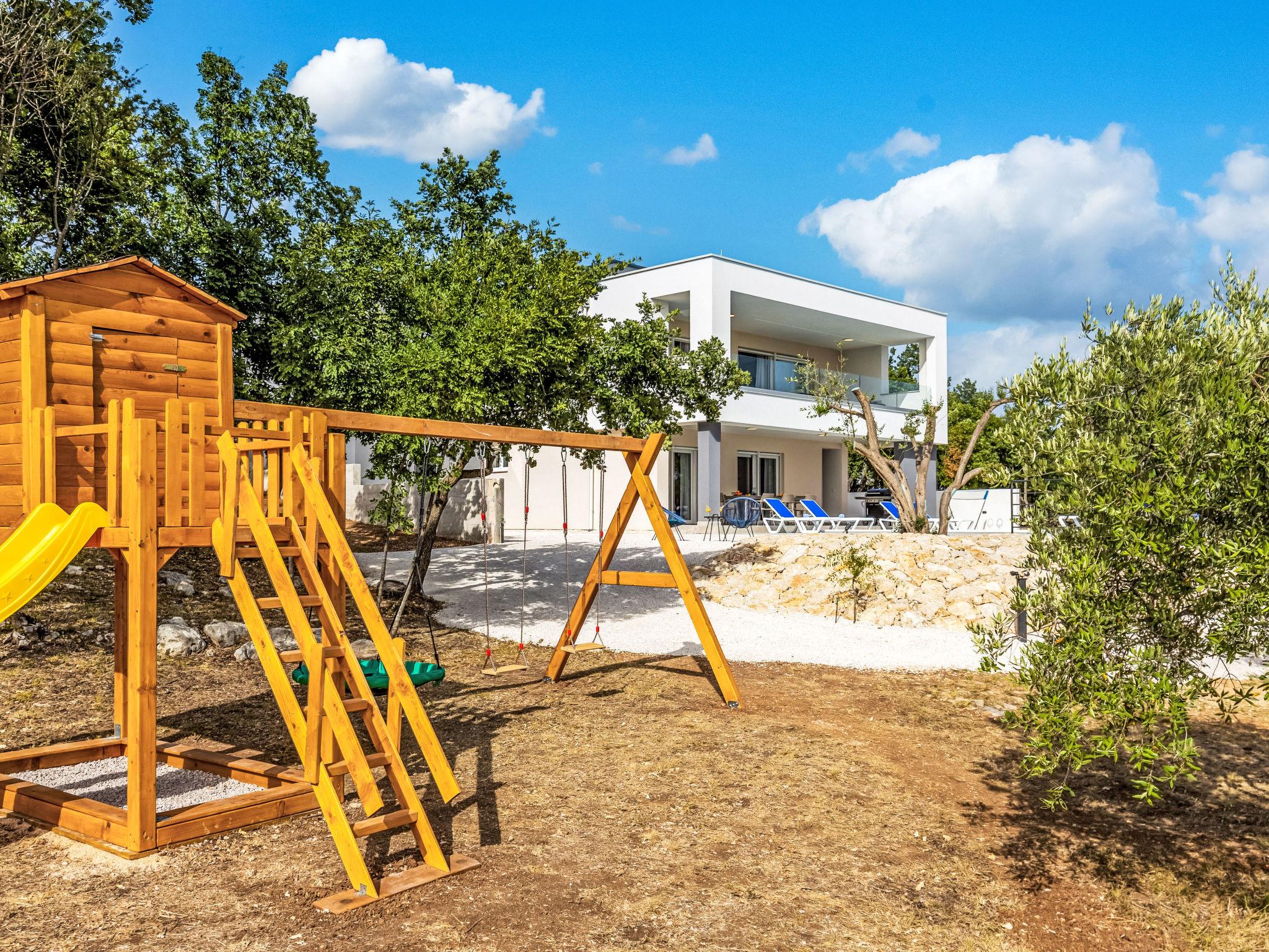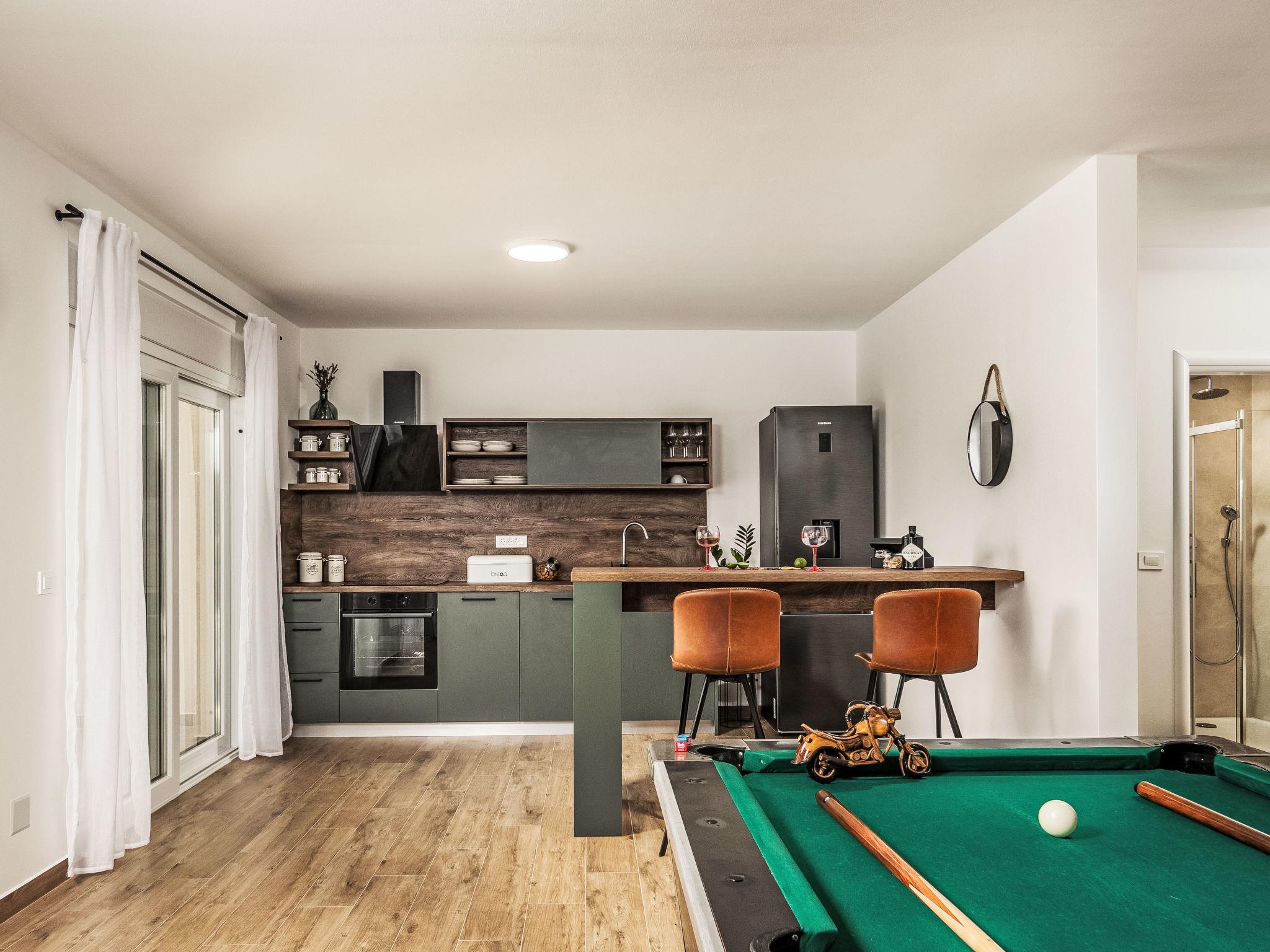 Modern villa "Green & Blue", 2 storeys, built in 2022. 28 km from the centre of Zadar, in a sunny, elevated position, 600 m from the sea, 600 m from the beach, located by a road. Private: property 9'000 m2 (fenced), swimming pool angular (8 x 4 m, depth 150 cm, seasonal availability: 15.May. - 15.Oct.). Outdoor shower, table tennis, garden furniture, barbecue, children's playground (slide, swing). In the house: internet access, billiard table, washing machine. Parking (for 3 cars) at the house on the premises. Shop 1 km, restaurant 1.5 km, bus stop 1.5 km, pebble beach, shingle beach 600 m. Nearby attractions: NP Paklenica 17 km, Rafting Zrmanja 35 km. The owner does not accept any youth groups.