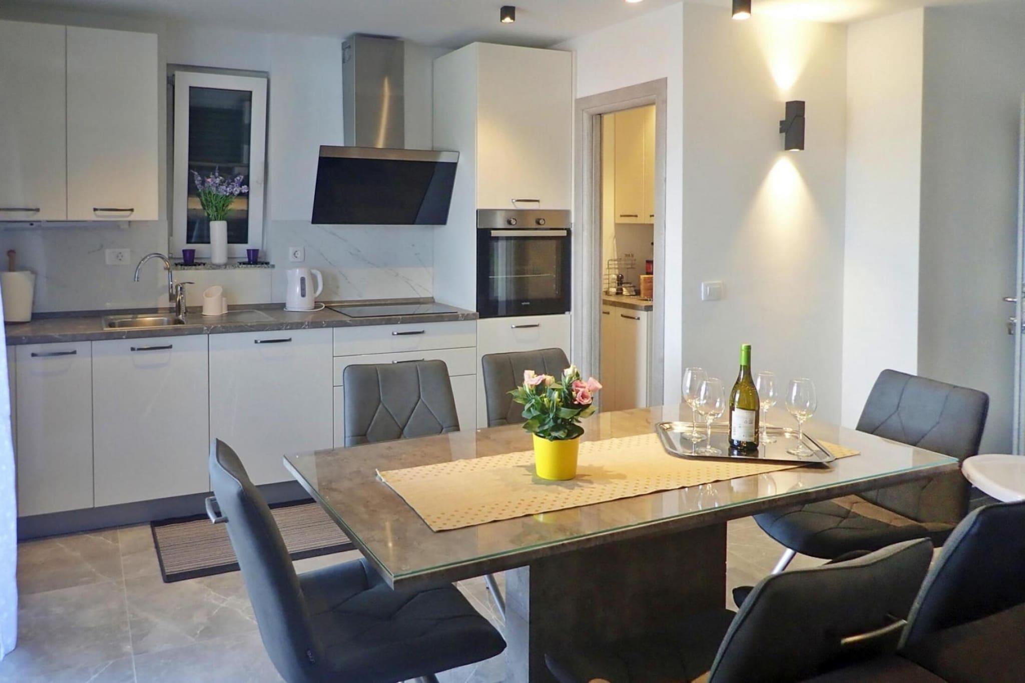I den lille by Maslenica ved Novigrad-bugten (nær Zadar) finder I det smukke og meget komfortable feriehus med en smuk havudsigt fra tagterrassen på anden sal. Indrettet på en moderne og venlig måde, er den ideel til afslapning i en rolig atmosfære, hvor dine børn kan lege ubekymret på den indhegnede grund. Ideel til familier op til 6 personer, huset er også på tilbud til 7 eller 8 personer. En privat swimmingpool giver forfriskning og badeglæde lige ved huset. I Maslencia kan du nå stranden på få minutter, hvor børnene kan hoppe, klatre og plaske i vandlandet. En tur til nærliggende Zadar med dens livlige gamle bydel kan også anbefales. Med rester af romerske bygninger til moderne seværdigheder, "Hilsen til solen"-pladsen og Havorgelet byder Zadar på en masse variation foruden fremragende strande og fortryllende badebugter. Højdepunkter inkluderet: Forbrugsbaserede energiomkostninger, sengelinned, håndklæder, slutrengøring, WiFi, besøgsskat. Aktiviteter i nærheden: For dem, der ønsker at nyde bjergene ud over havet, er Paklenica Gorges nær Starigrad, omkring 15 km væk, tilbyde vandring og klatring på. Du kan også opleve livet her på en mountainbike eller på en fotosafari i fodsporene af Winnetou by Landrover. Du kan opleve et vidunderligt flodlandskab med vandfald og krystalklart vand under en kanotur på Zrmanja nær Obrovac. Bådture til den nedre Zrmanja-kløft med svømmestop tilbydes også i Novigrad-bugten Mobilitet: Ikke egnet til personer med nedsat mobilitet.