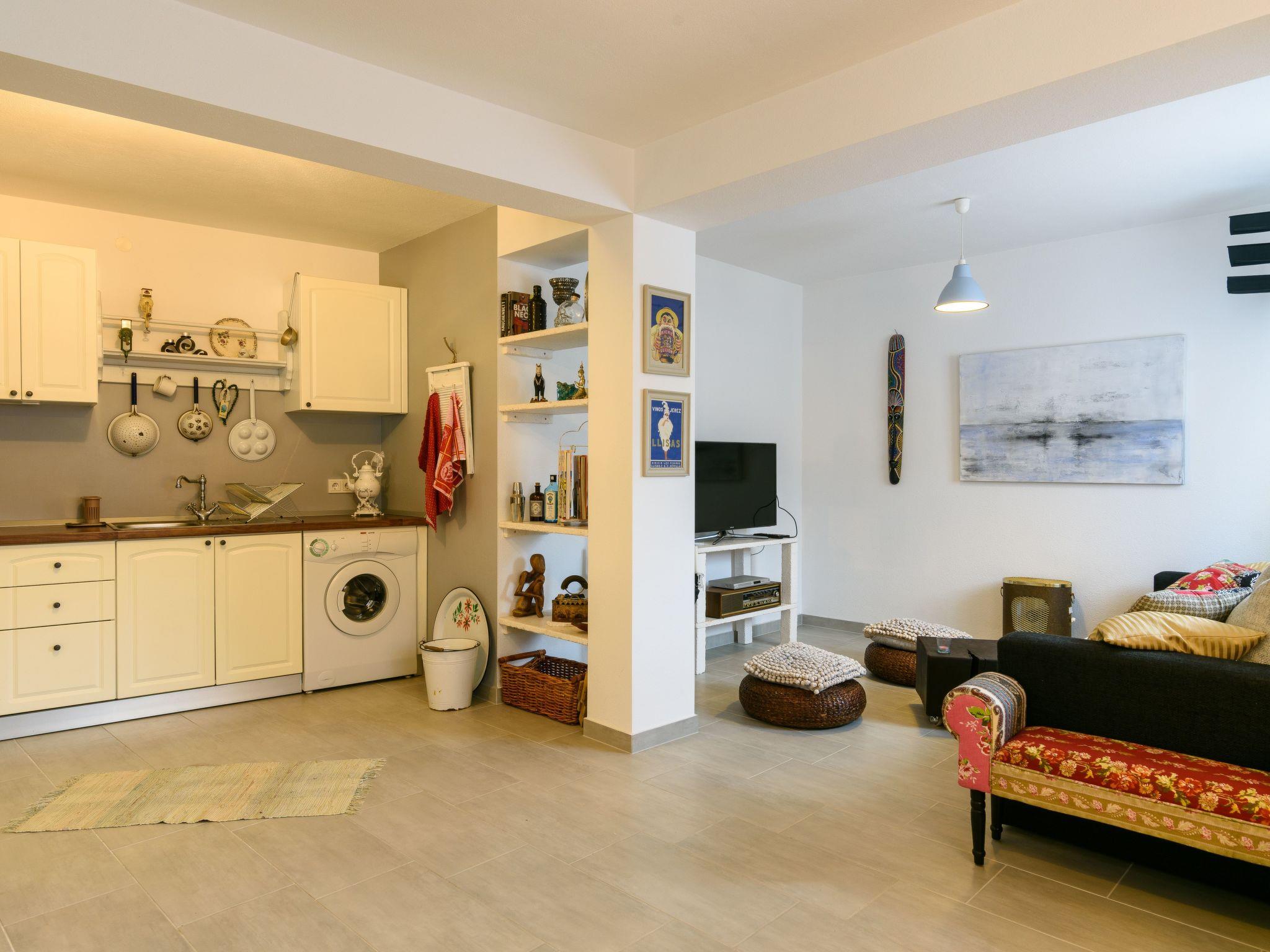 On the ground floor there is a spacious living area with a sofa bed (for two people), a fully equipped kitchen and a covered dining area for up to 8 people on the outdoor terrace.