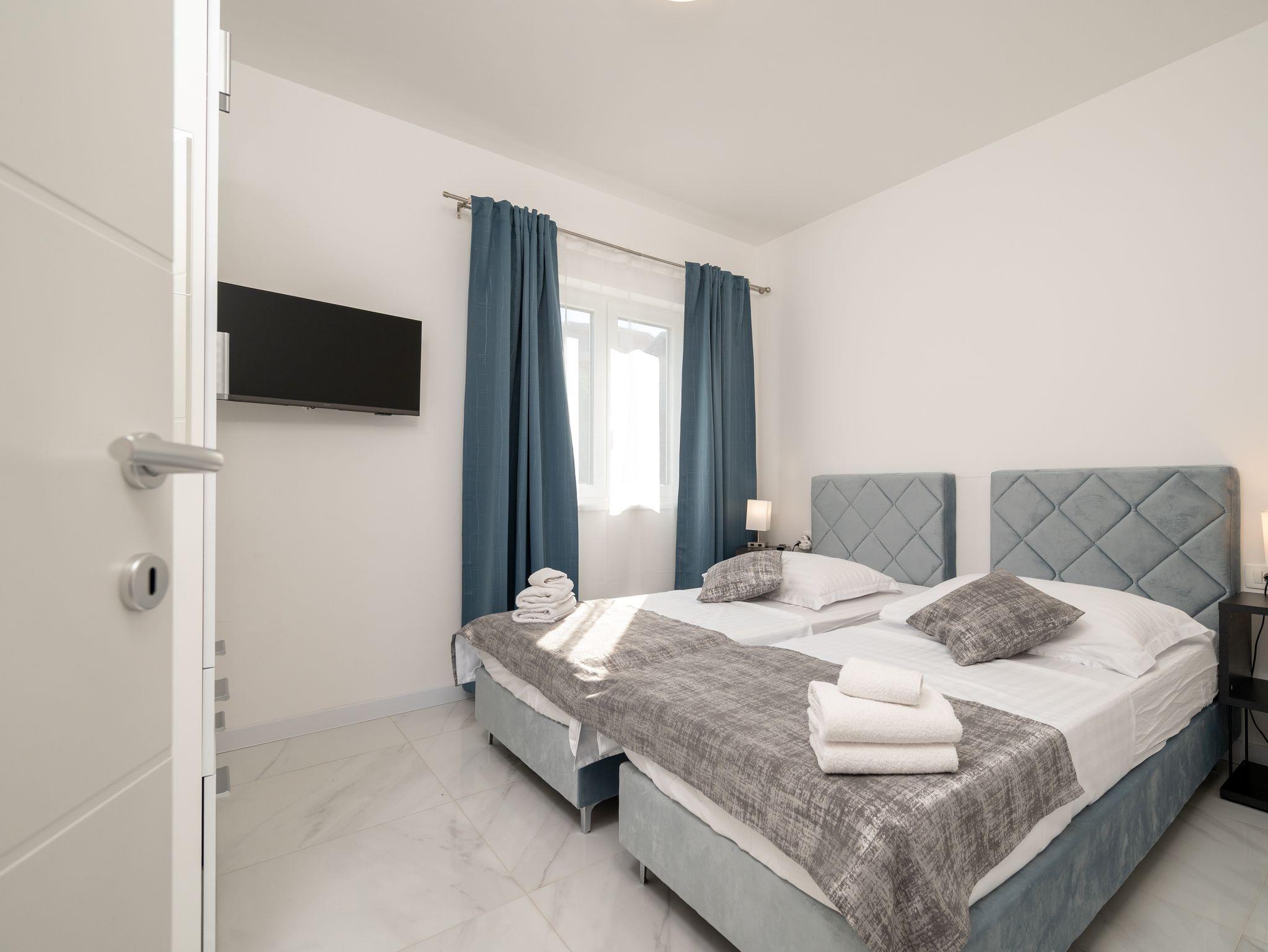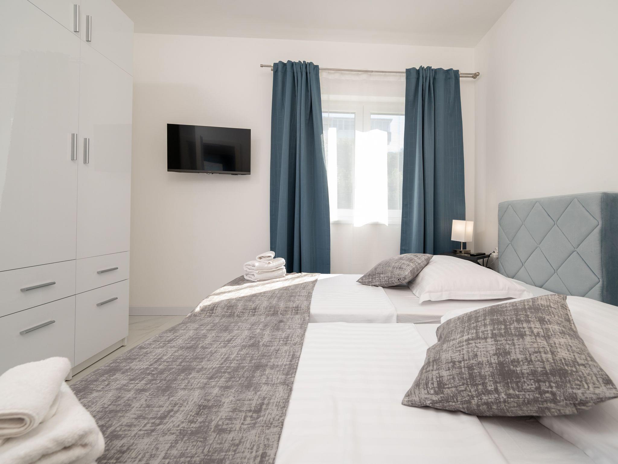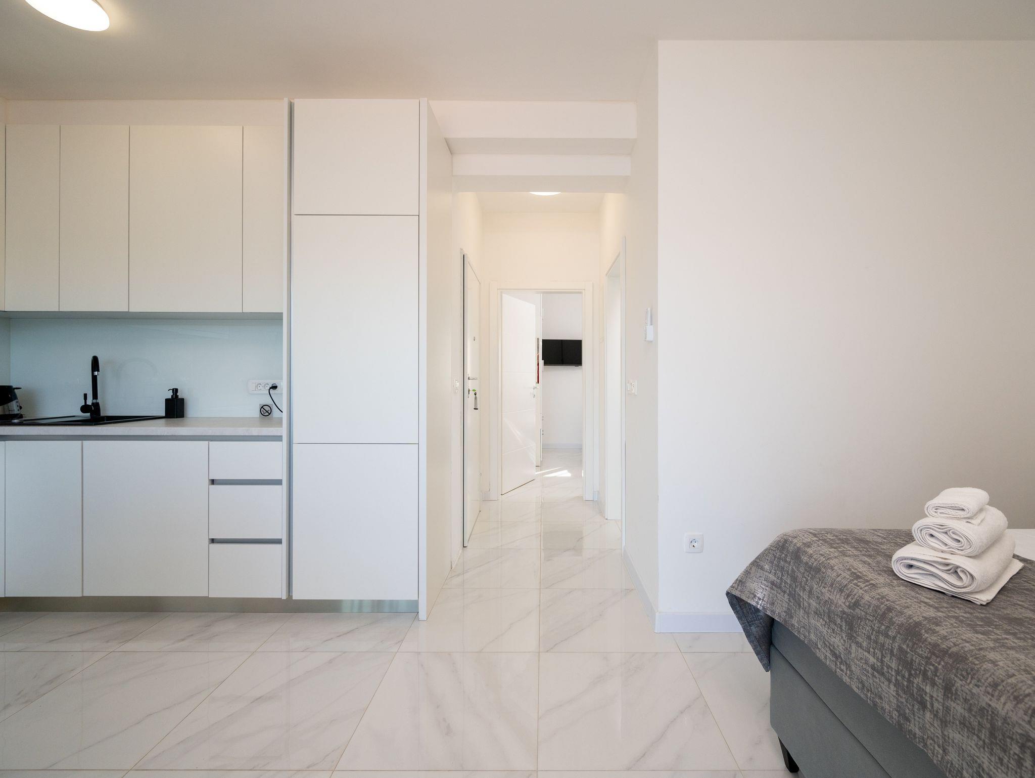 Ferienwohnung bietet Platz für 4 Gäste. Die Betten sind in Schlafzimmern, die es 1 gibt, und in Wohnzimmer, innerhalb einer Gesamtfläche von 38m2, angeordnet. Die Gäste haben einen eigenen Balkon zur Verfügung, auf der sie in warmen Sommernächten genießen können. Das Apartment bietet Meerblick. IM PREIS INBEGRIFFEN: Kurtaxe, Endreinigung, Klimatisierung, Parkplatz, Internet, Kinderbett, Bügeleisen, Bügelbrett, Föhn. Die Verfügbarkeit zusätzlicher Dienstleistungen in Ihrem reservierten Termin und die Preise derselben (falls nicht aufgeführt) müssen im Voraus überprüft werden. Zusätzliche Dienstleistungen die in der Zahlungsaufforderung nicht aufgeführt sind werden direkt beim Vermieter bezahlt, angenommen der Gast nutzt auch diese. Ermäßigung auf den Grundpreis: Gratistag 21=19 (bei einem Aufenthalt von 21 Tagen oder mehr erhalten Sie 2 Gratistage für den Aufenthalt bis 31.12.26).