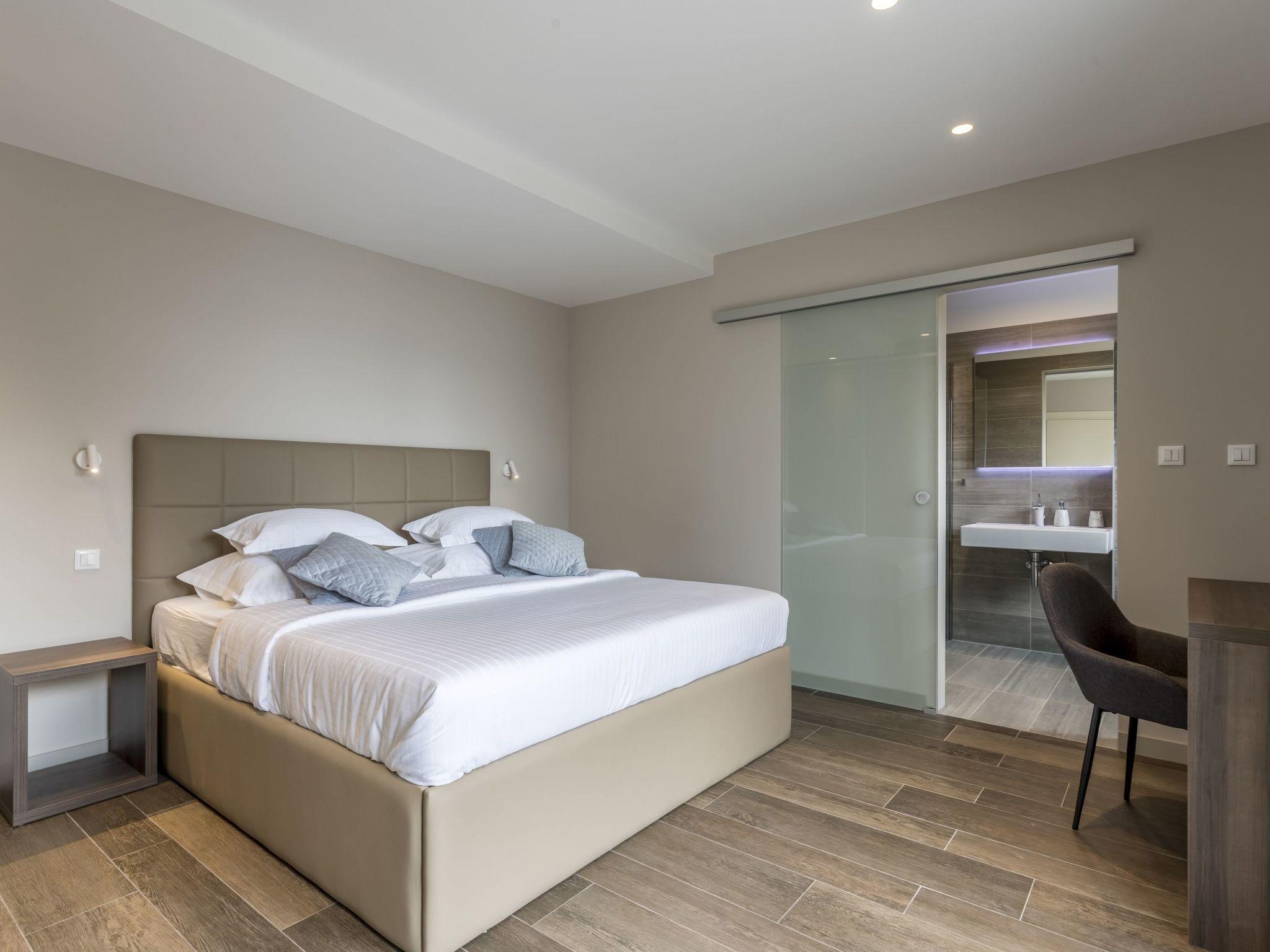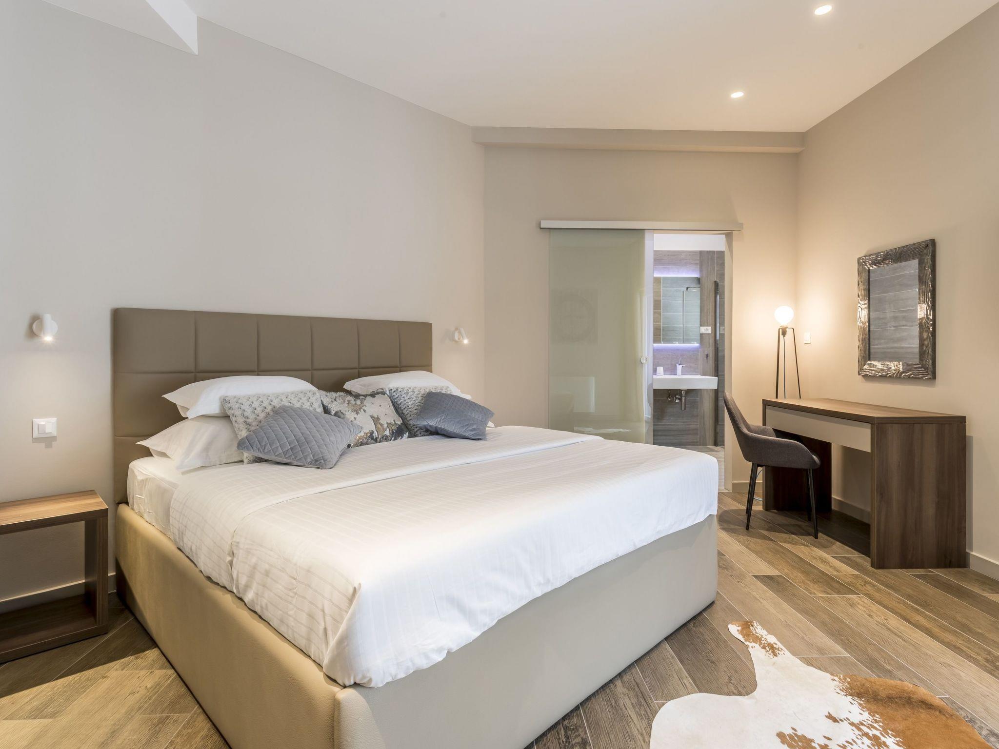 *The internal staircase takes you to an upper ground floor (mezzanine) with a Master bedroom No2 with a king-size bed 180x200cm with sea views, TV, A/C, en-suite bathroom with a shower and a bathtub with sea views, walk-in closet, and a TV. A few steps up from this level takes you to the first-floor level offering Bedroom No3 with king-size bed 180x200cm with sea views, TV, A/C, en-suite bathroom with shower and a bathtub; Bedroom No4 with double bed 160x200cm, TV, A/C, en-suite bathroom with shower. Bedrooms are far from each other offering privacy.