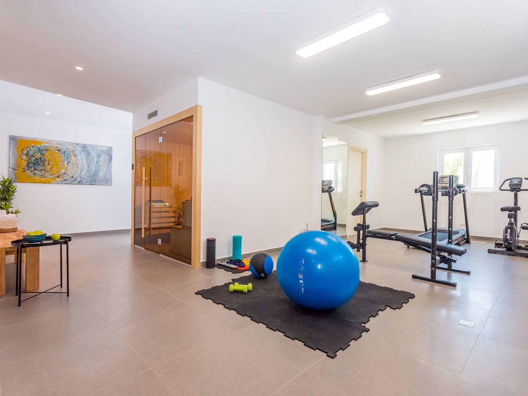 *The lower ground floor offers a spacious and very nicely decorated luxury living room equipped with TV, stereo, Bluetooth speakers, PS4, and an exit to a covered lounge corner with amazing sea views and direct access to the pool area. A few steps down take you to Bedroom No1 with a king-size bed 180x200cm, an en-suite bathroom with shower, TV, A/C sea views, and an exit toward the garden. At this level, there is a sauna, a gym with a treadmill, an exercise bike, and a bench.