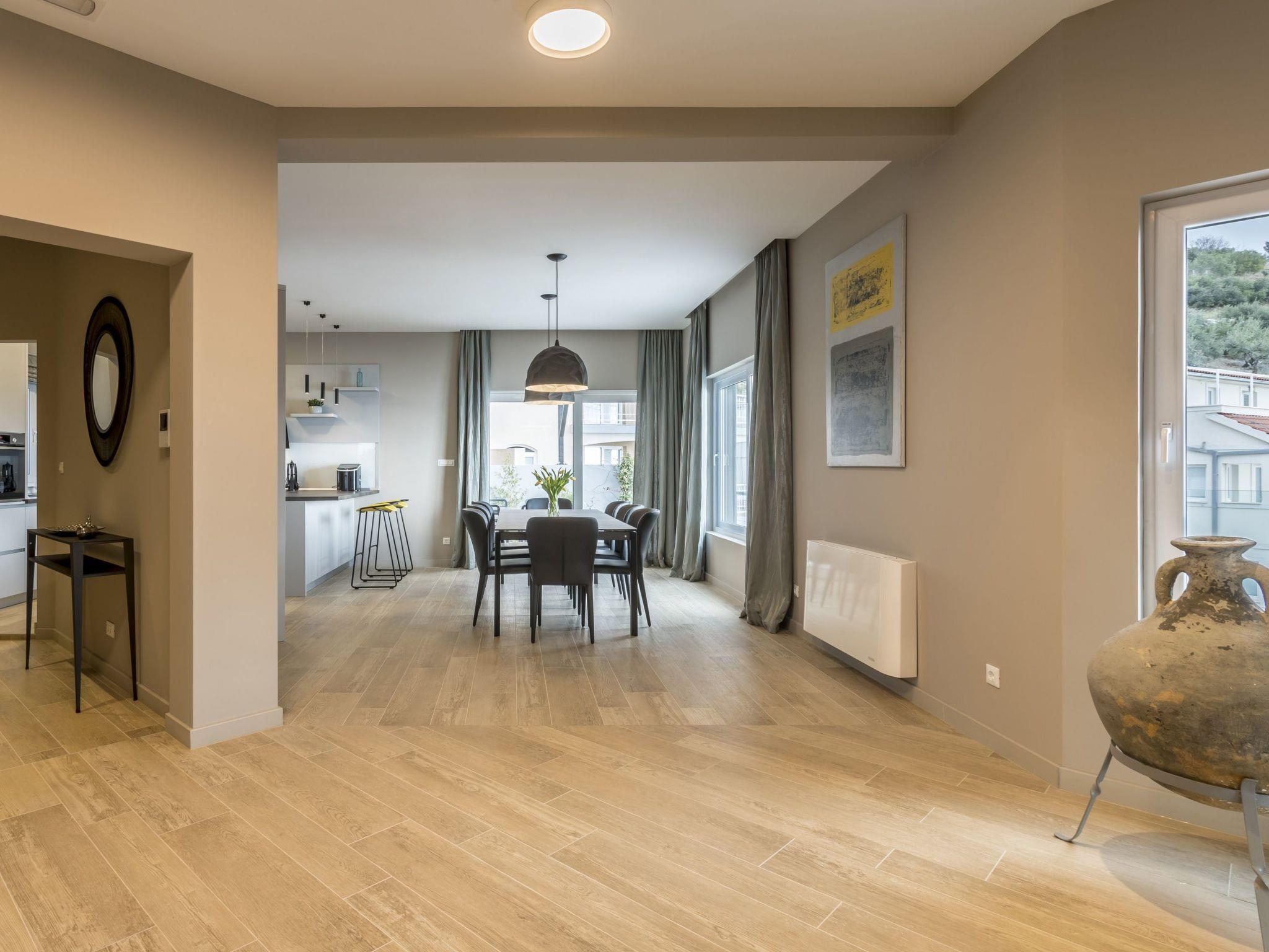 *Interior is very well organized and well-designed giving a deeper dimension with half floors and glass fences. The ground floor offers a fully equipped kitchen with a wine cooler, ice maker, coffee machine Dolce Gusto and more, a dining table with sea and pool views, direct exit to the outdoor dining area. There is also a toilet and a laundry with all amenities. From this level few steps down takes you to the living room full of light and sun.
