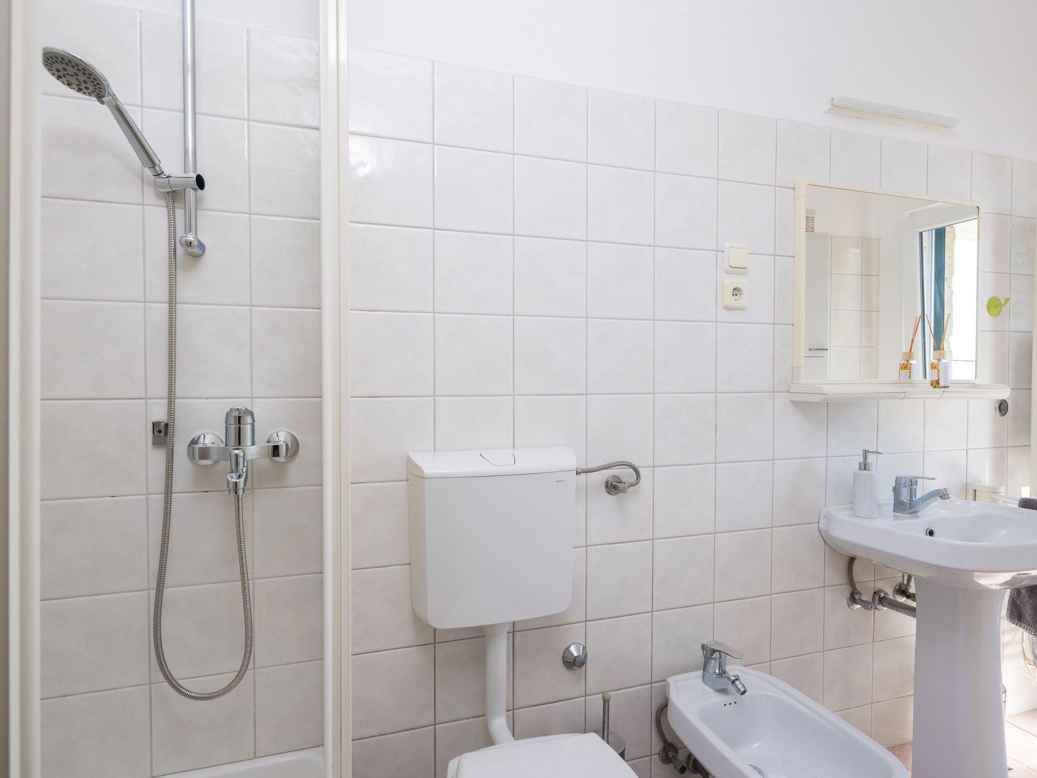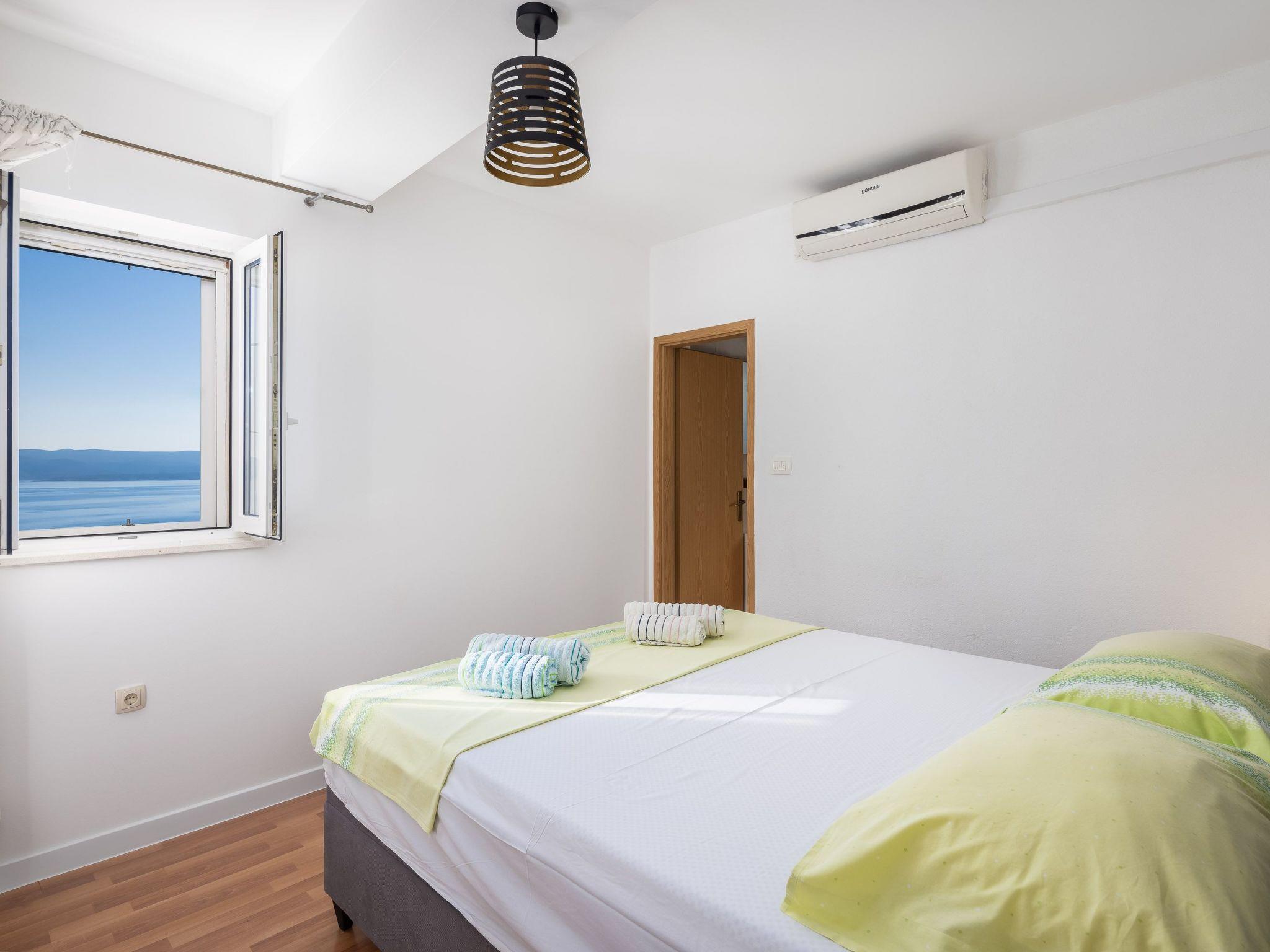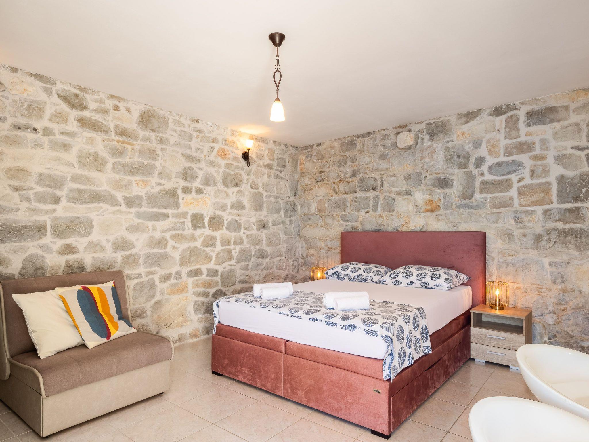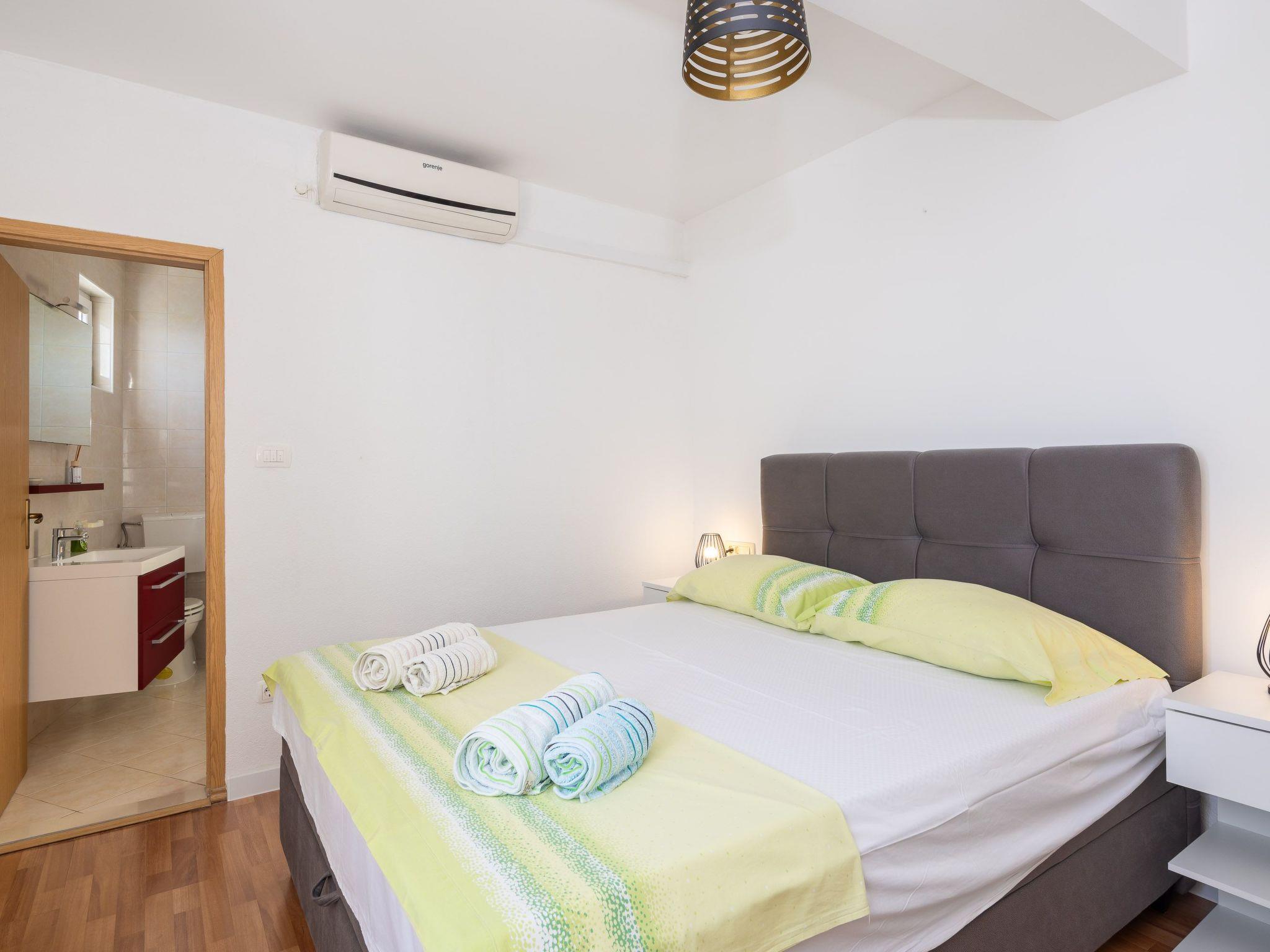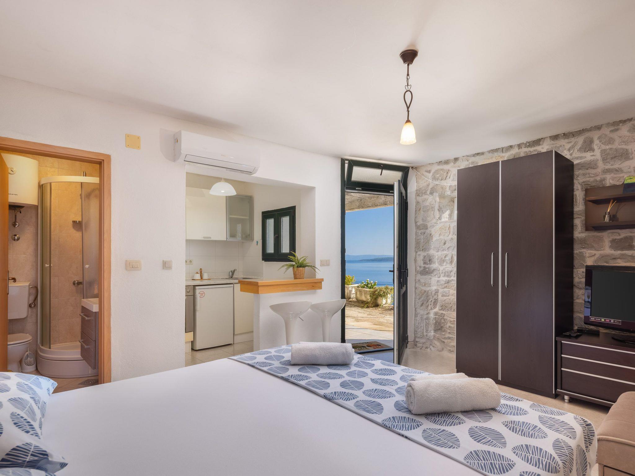 Moving to the first floor of the villa, there is an apartment with double bed, a kitchen, refrigerator, air conditioning, bathroom with shower and TV.