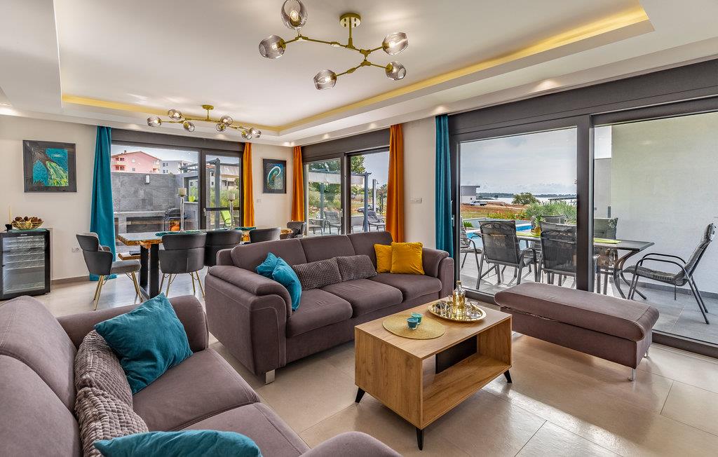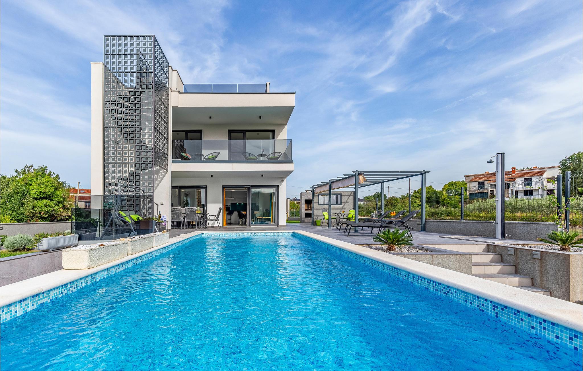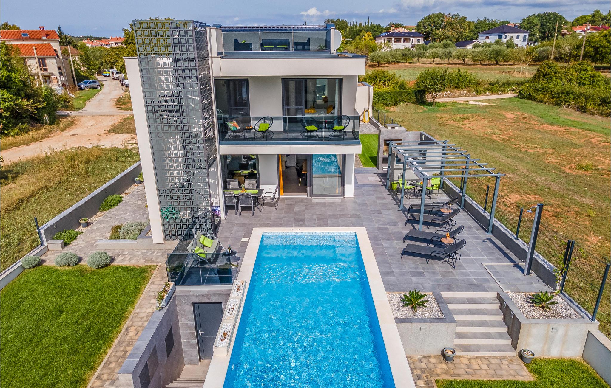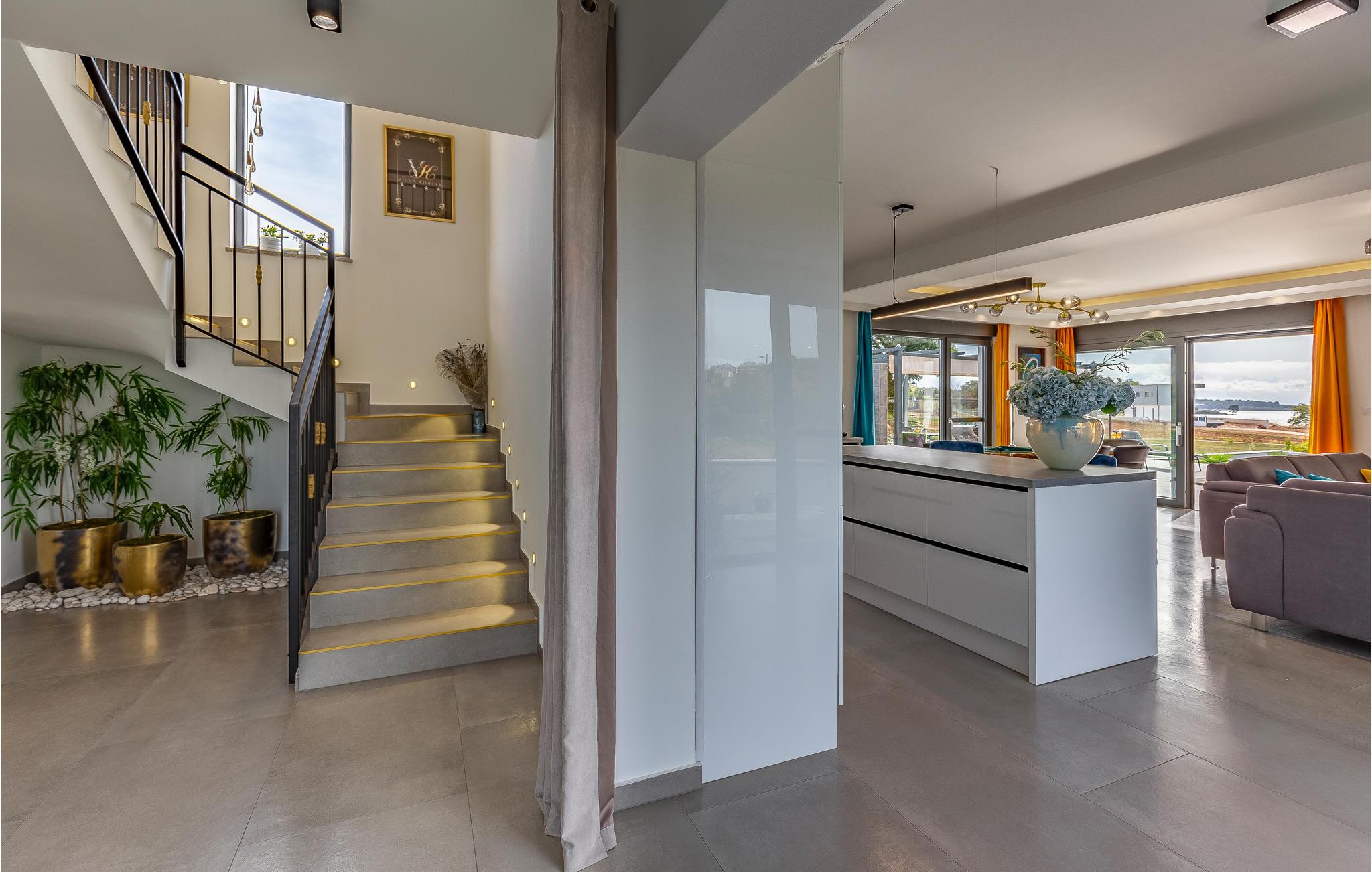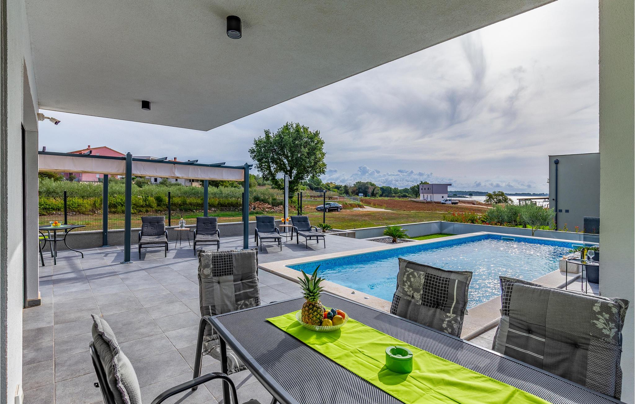 Udearealet omfatter en meget flot overdækket terrasse med solterrasse. Derudover fører en udvendig trappe langs den rummelige altan på 1. sal op til tagterrassen. Herfra kan I nyde en fantastisk udsigt til bugten Pomer og Medulin. jeres børn vil finde en græsplæne at lege i haven, men I vil helt sikkert tilbringe mange timer i vandet i den store pool. Et andet højdepunkt er udekøkkenet, hvor I kan lave mad og grille efter hjertens lyst og spise jeres måltider under åben himmel.