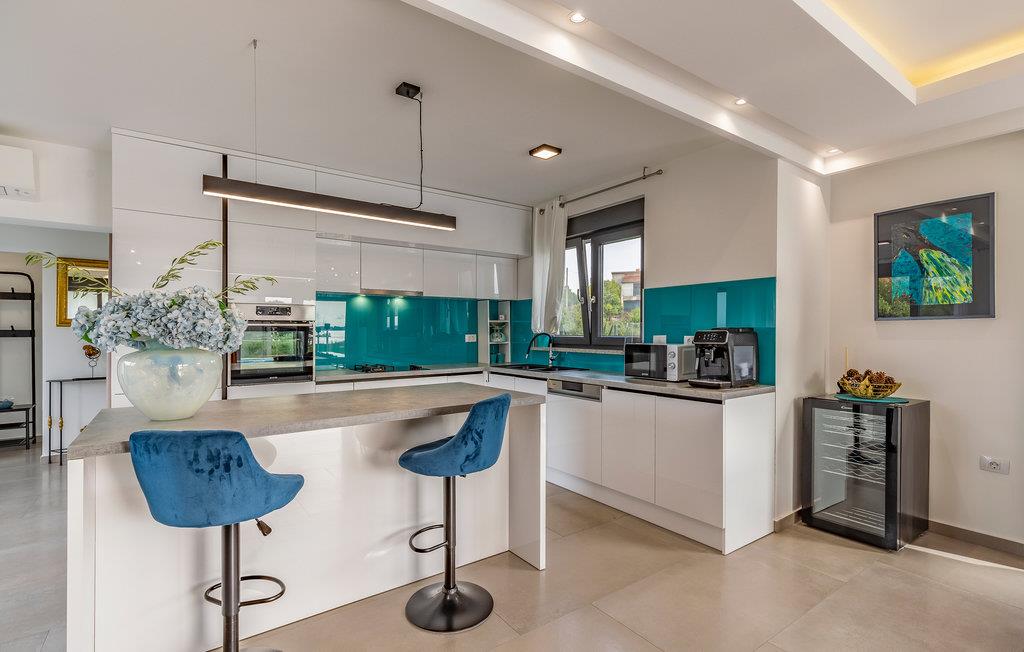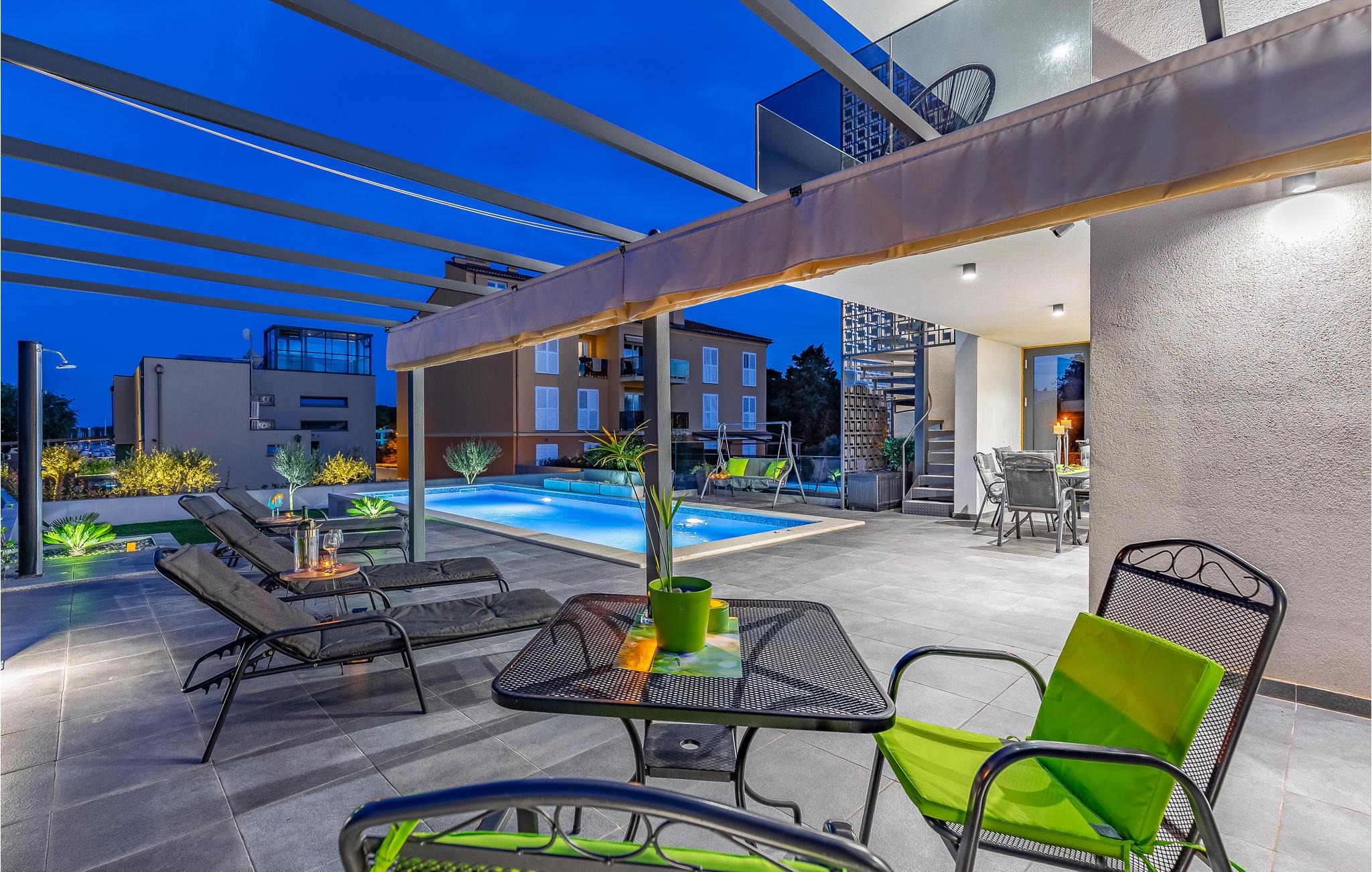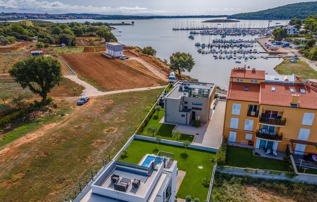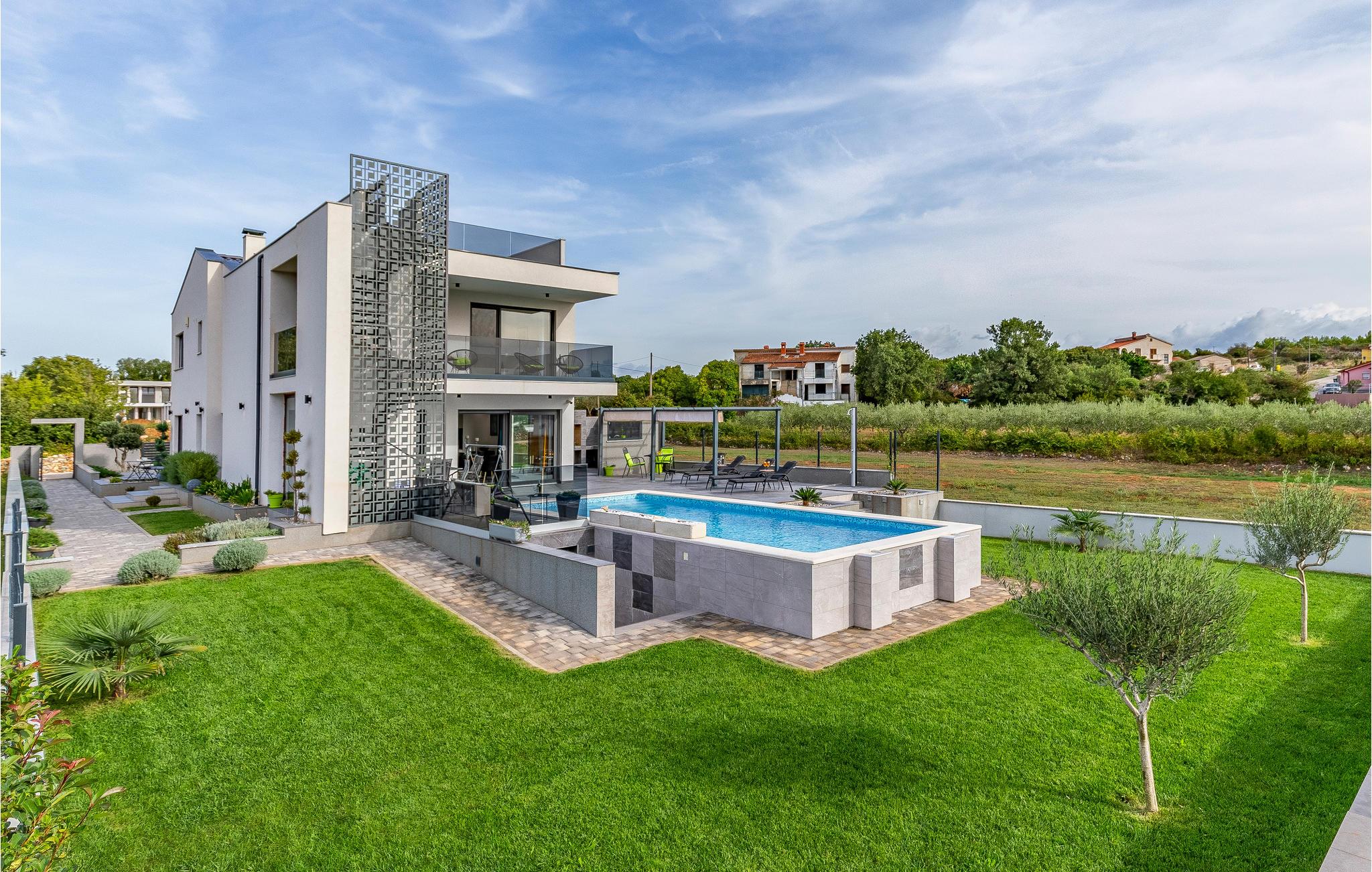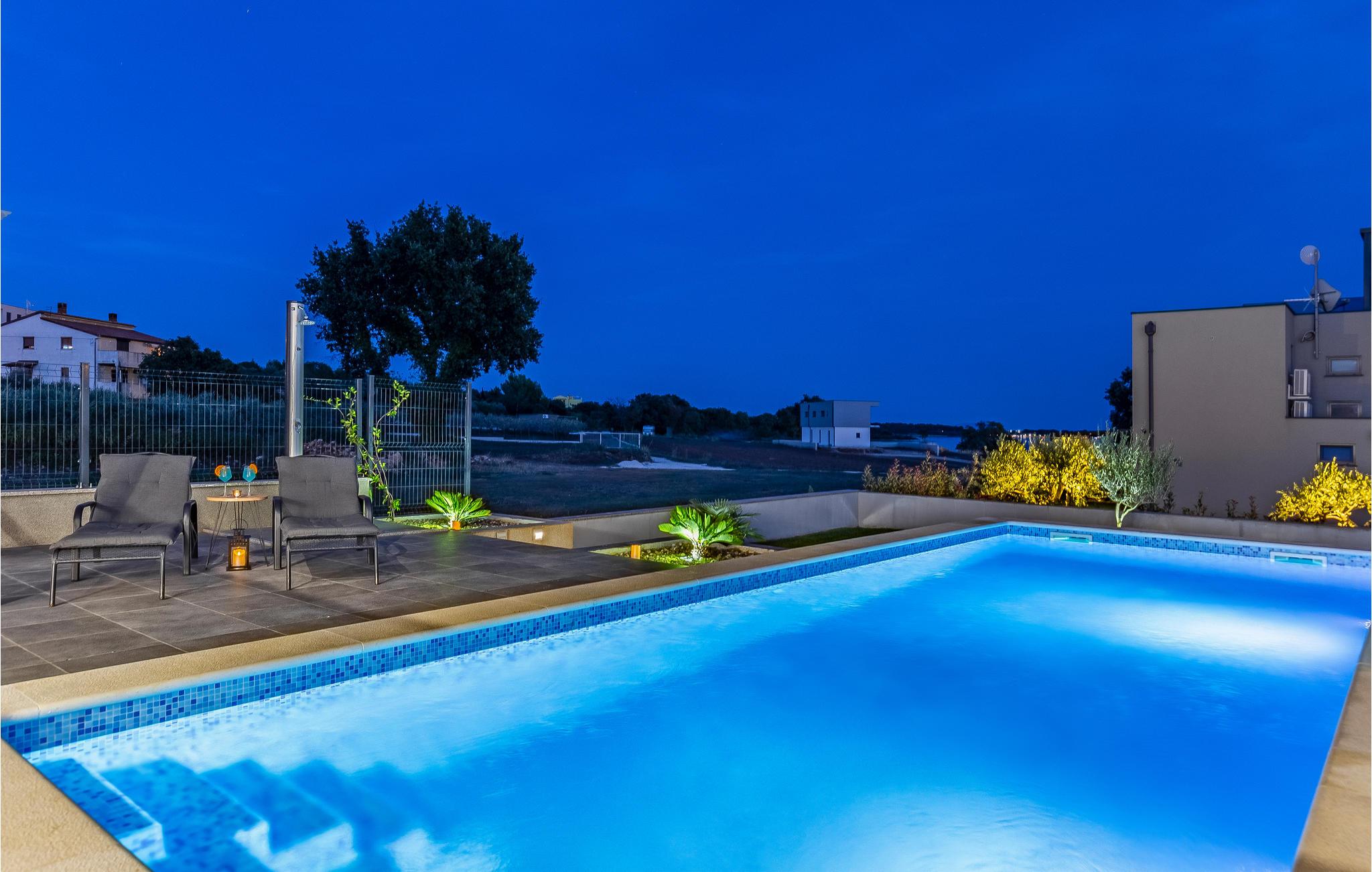 Udearealet omfatter en meget flot overdækket terrasse med solterrasse. Derudover fører en udvendig trappe langs den rummelige altan på 1. sal op til tagterrassen. Herfra kan I nyde en fantastisk udsigt til bugten Pomer og Medulin. jeres børn vil finde en græsplæne at lege i haven, men I vil helt sikkert tilbringe mange timer i vandet i den store pool. Et andet højdepunkt er udekøkkenet, hvor I kan lave mad og grille efter hjertens lyst og spise jeres måltider under åben himmel.