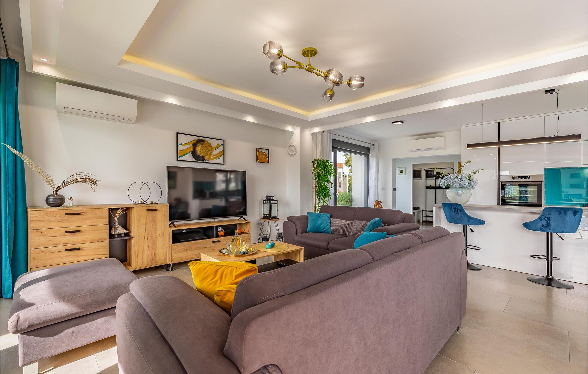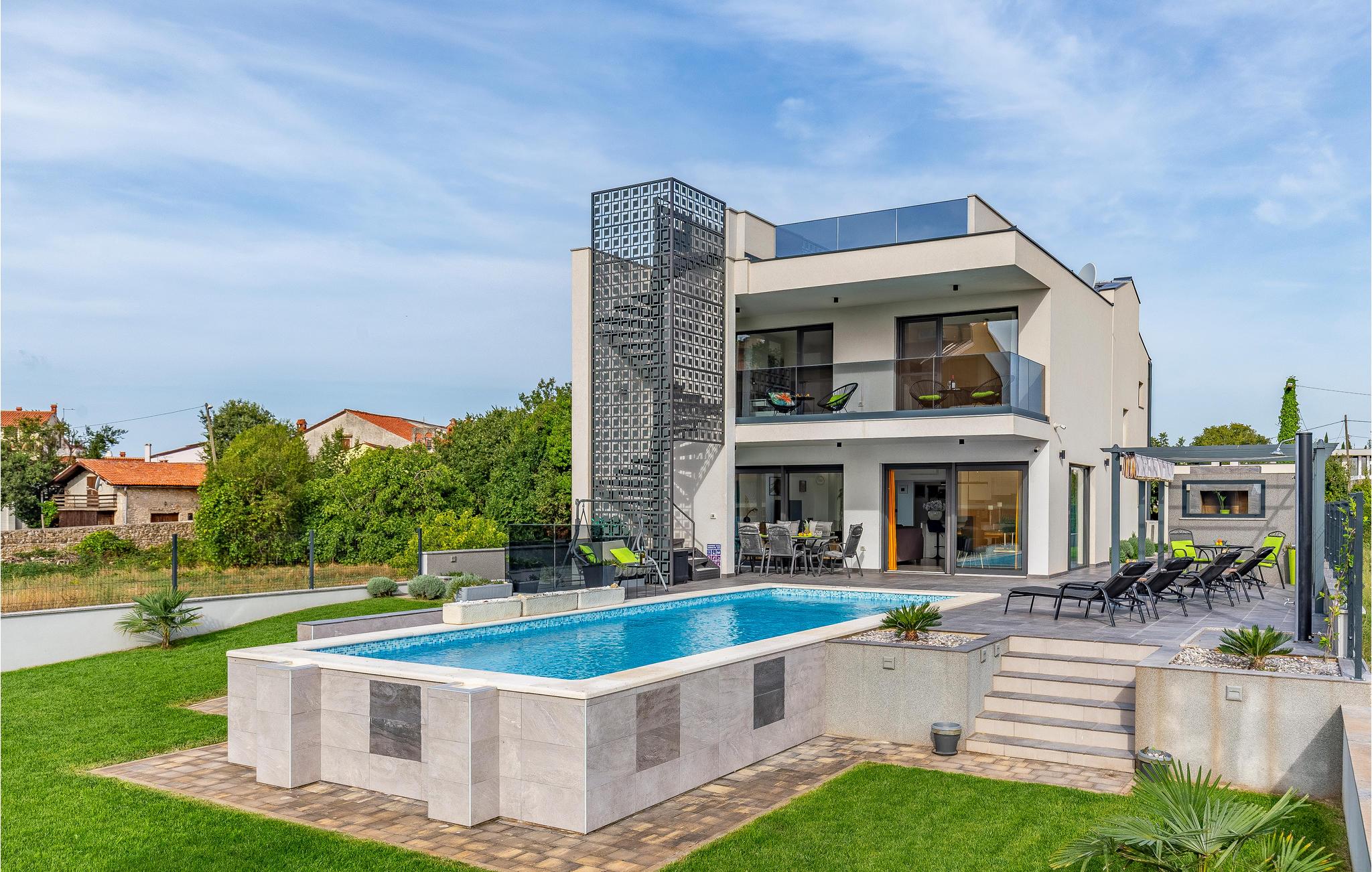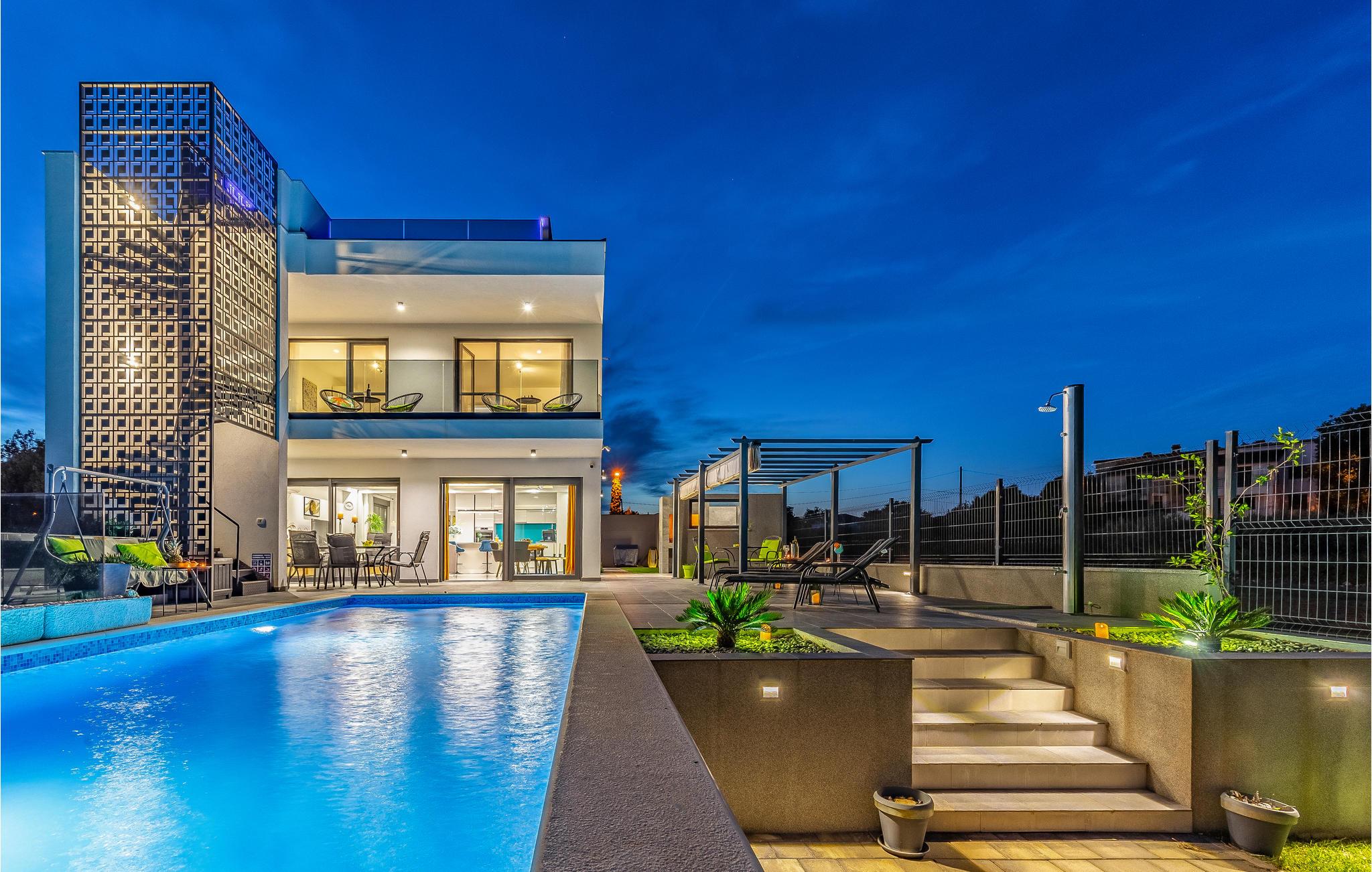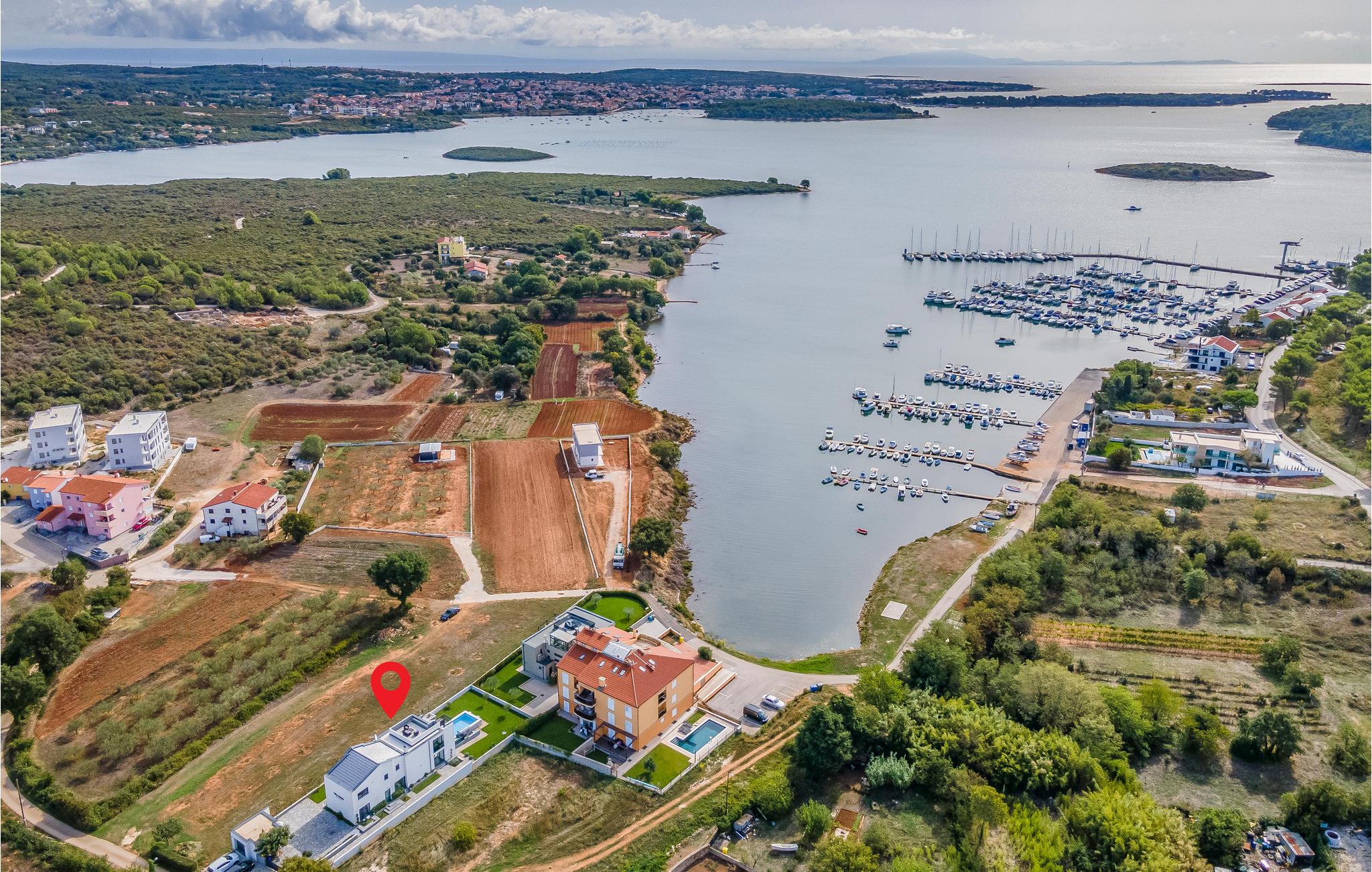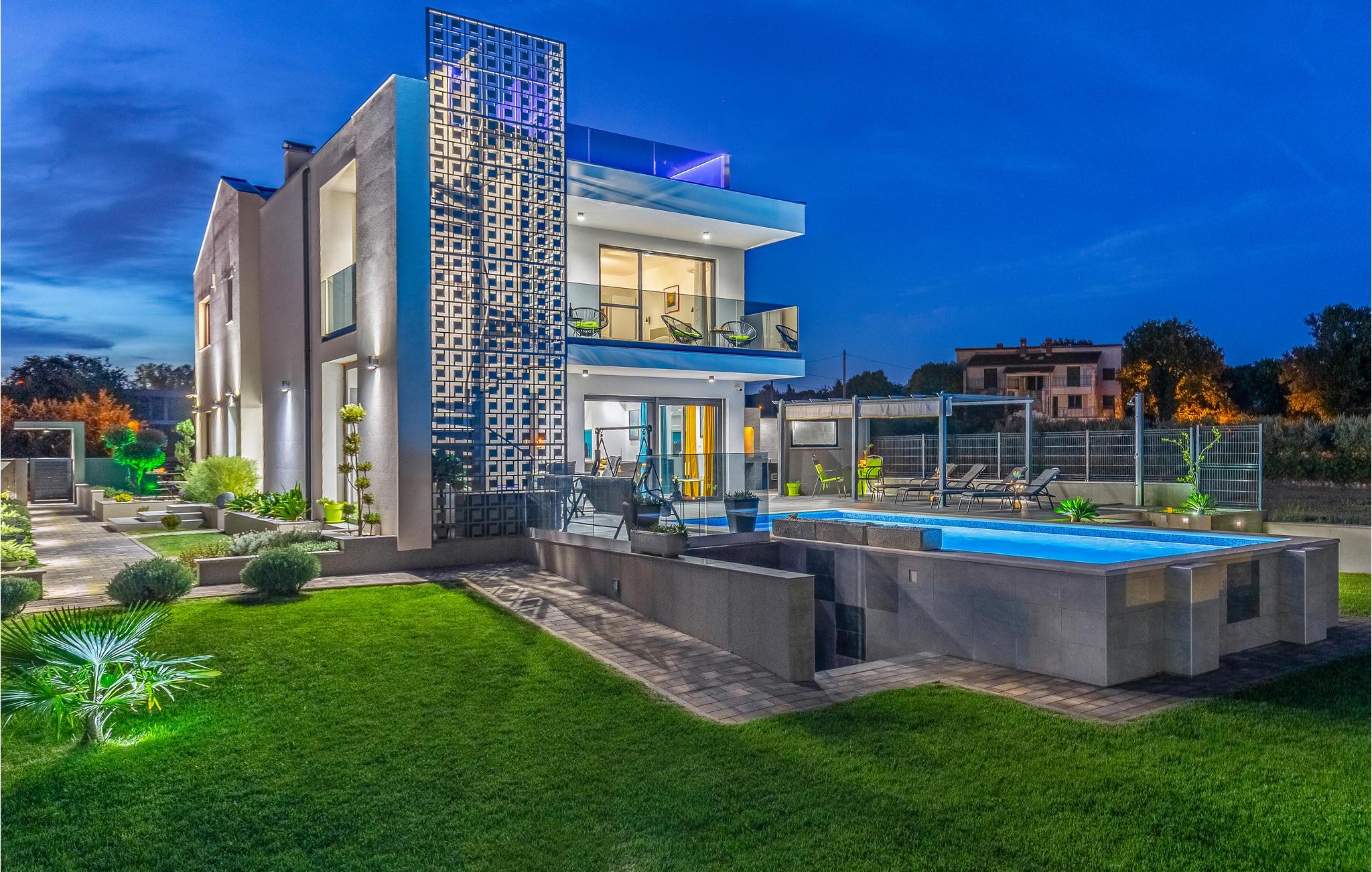 Udearealet omfatter en meget flot overdækket terrasse med solterrasse. Derudover fører en udvendig trappe langs den rummelige altan på 1. sal op til tagterrassen. Herfra kan I nyde en fantastisk udsigt til bugten Pomer og Medulin. jeres børn vil finde en græsplæne at lege i haven, men I vil helt sikkert tilbringe mange timer i vandet i den store pool. Et andet højdepunkt er udekøkkenet, hvor I kan lave mad og grille efter hjertens lyst og spise jeres måltider under åben himmel.