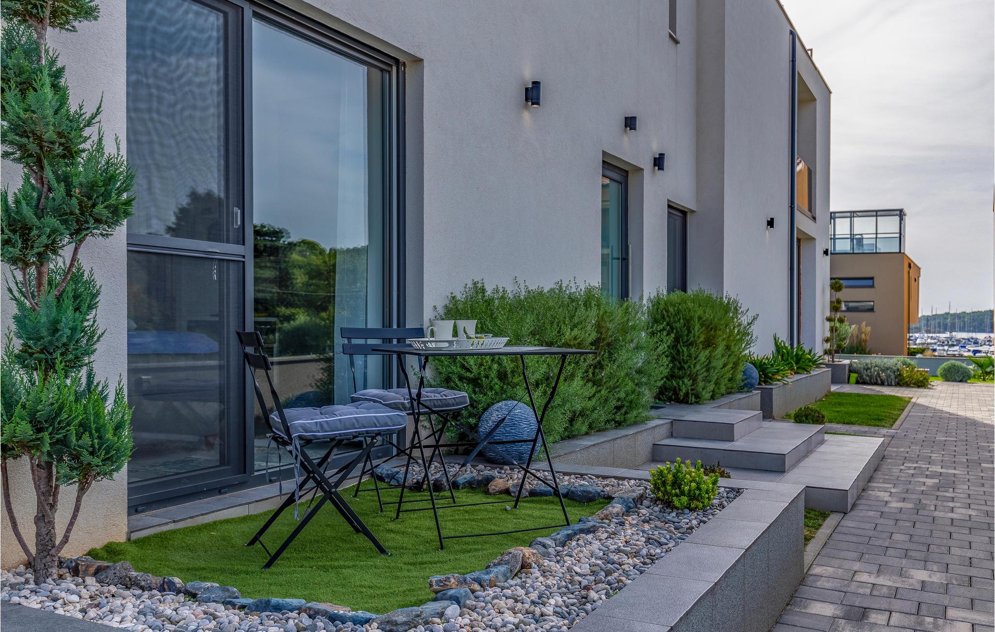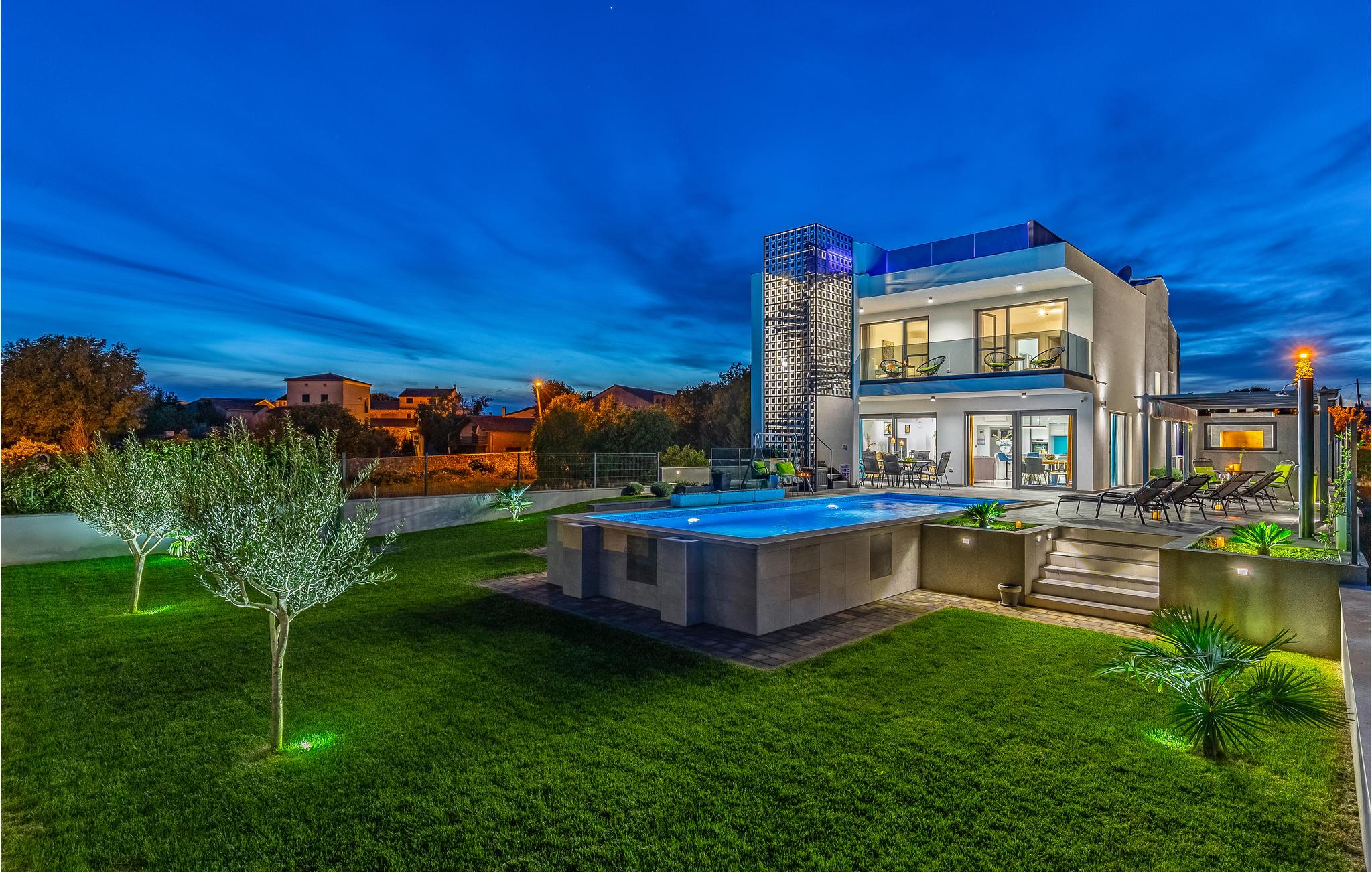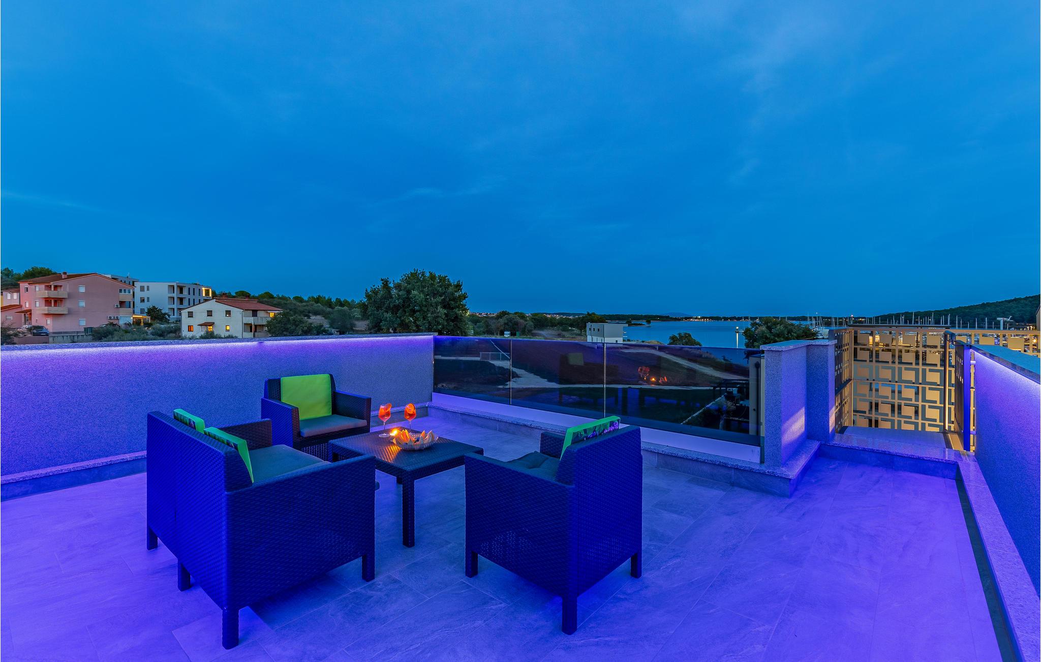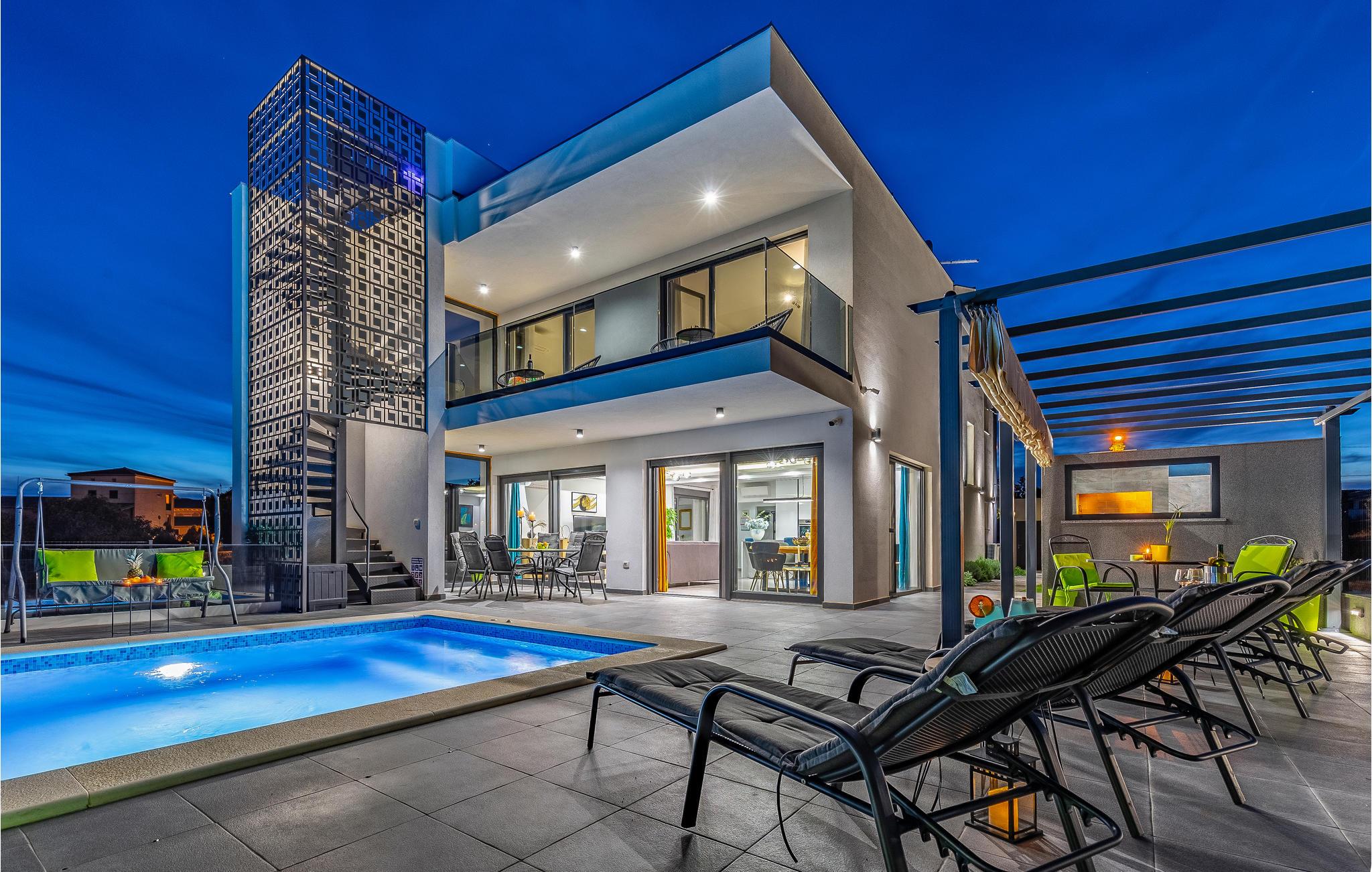 Udearealet omfatter en meget flot overdækket terrasse med solterrasse. Derudover fører en udvendig trappe langs den rummelige altan på 1. sal op til tagterrassen. Herfra kan I nyde en fantastisk udsigt til bugten Pomer og Medulin. jeres børn vil finde en græsplæne at lege i haven, men I vil helt sikkert tilbringe mange timer i vandet i den store pool. Et andet højdepunkt er udekøkkenet, hvor I kan lave mad og grille efter hjertens lyst og spise jeres måltider under åben himmel.