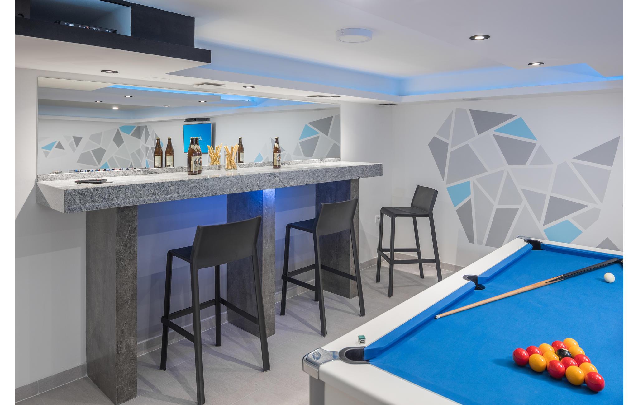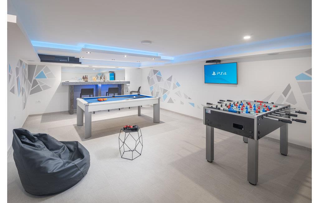Udstyret er moderne, og møblerne er pæne, så huset opfylder de højeste standarder for en afslappende ferie. Ud over masser af faciliteter til børn og underholdning, er huset også præget af en smuk panoramaudsigt til havet. Boligen fordeler sig over stueetage og en første sal, som er forbundet via en trappe. Stueetagen har et opholdsrum med spisestue og køkken til alle gæster i huset og et legehjørne til børn, samt et badeværelse, mens der ovenpå er fire soveværelser og tre badeværelser. I underetagen er der et aktivitetsrum, hvor børnene sikkert kan få mange timer til at gå.