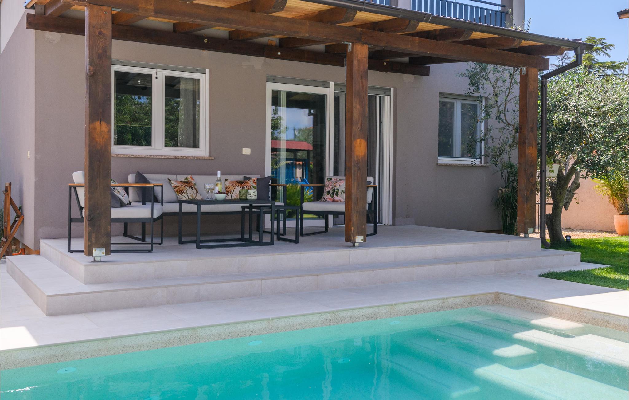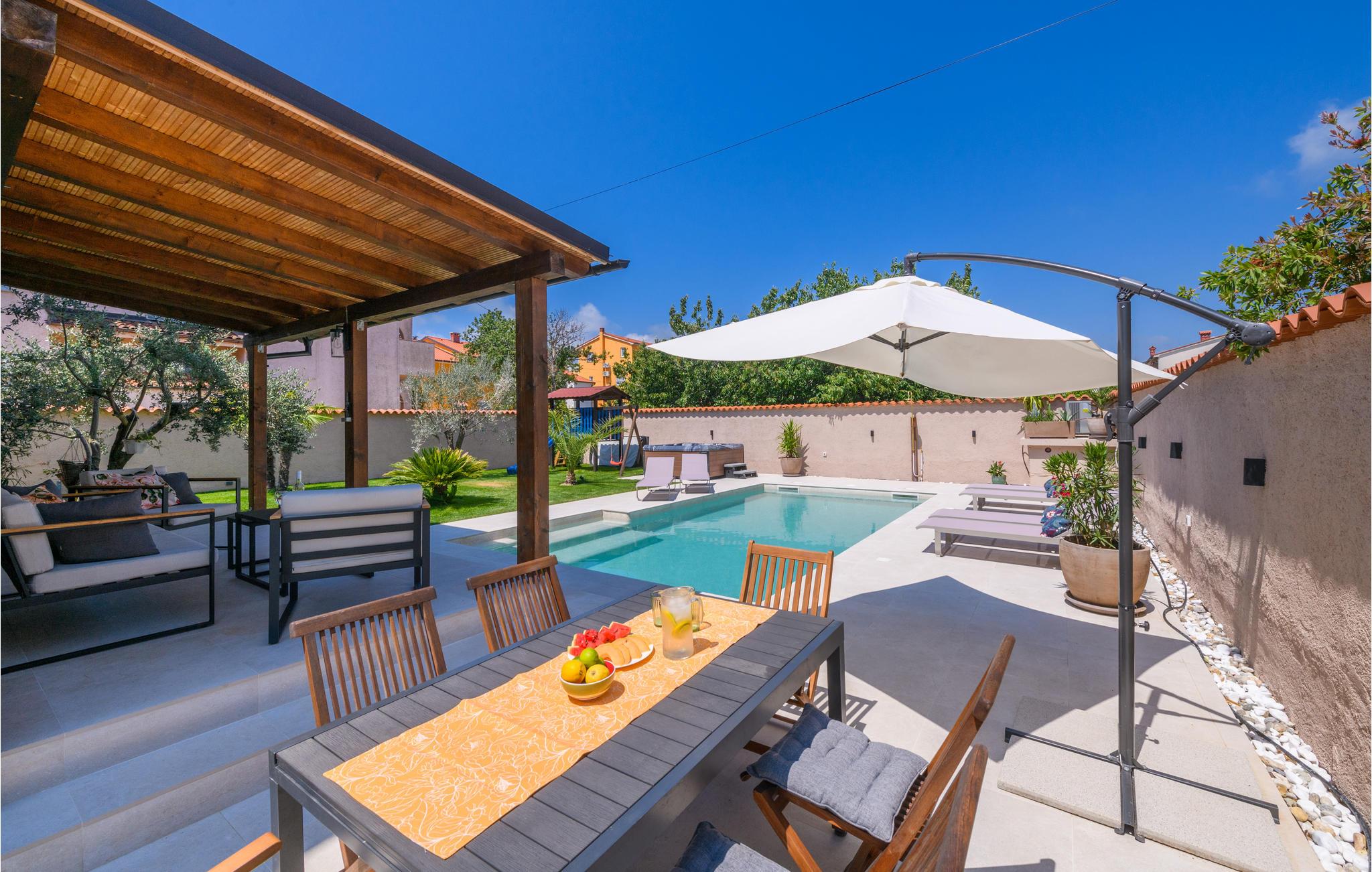 Hold ferie i dette dejlige feriehus med pool. huset ligger i den populære by Medulin og har alt hvad der er behov for til en afslappende og rolig ferie blandt familie og venner. Den er velindrettet og så vil I kunne nyde en Whirlpool. Beliggenheden tæt på havet og områdets mange aktiviteter er en af de største fordele ved dette herlige domicil. Ud af fire soveværelser har tre klimaanlæg, men alle har TV. På den indhegnede grund findes endvidere legeredskaber for de yngste gæster. Lad bare bilen stå på grunden, for restauranter og badestrande ligger i gåafstand fra huset. Som oplagte udflugtsmål kan Pula imidlertid anbefales, med byens imponerende amfiteater med de mange sommerkoncerter. Det kan varmet anbefales at gå til sommerkoncert i amfiteateret i Pula.