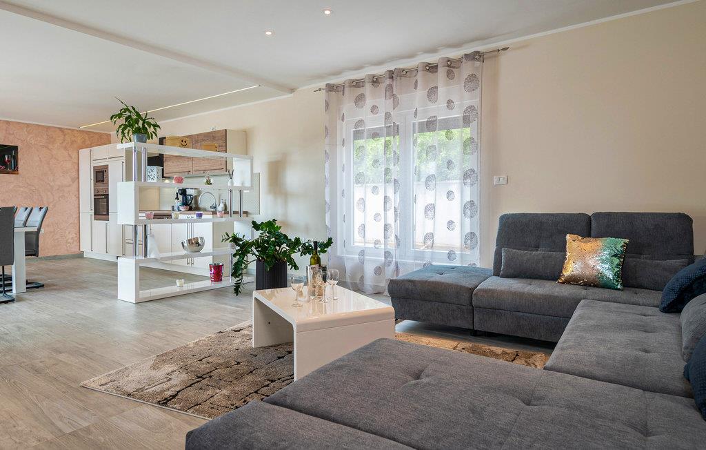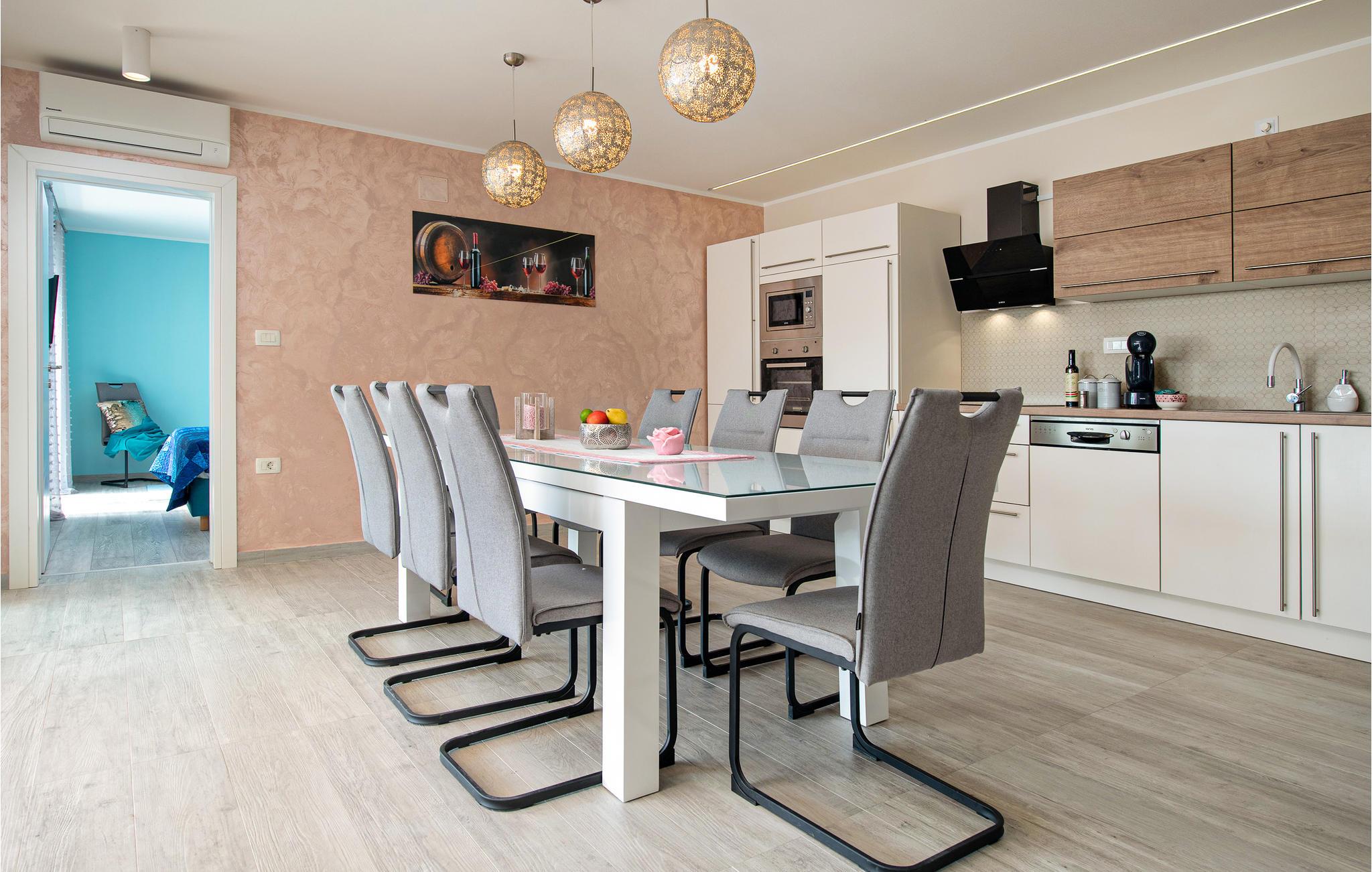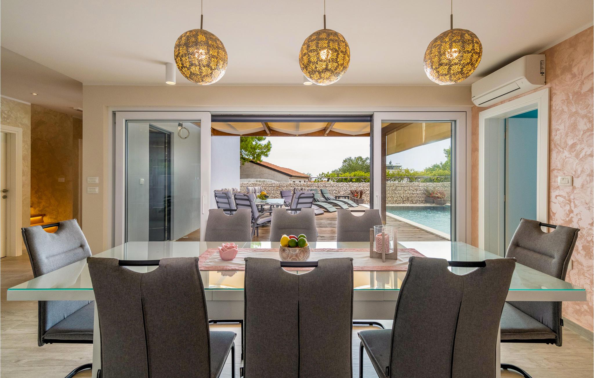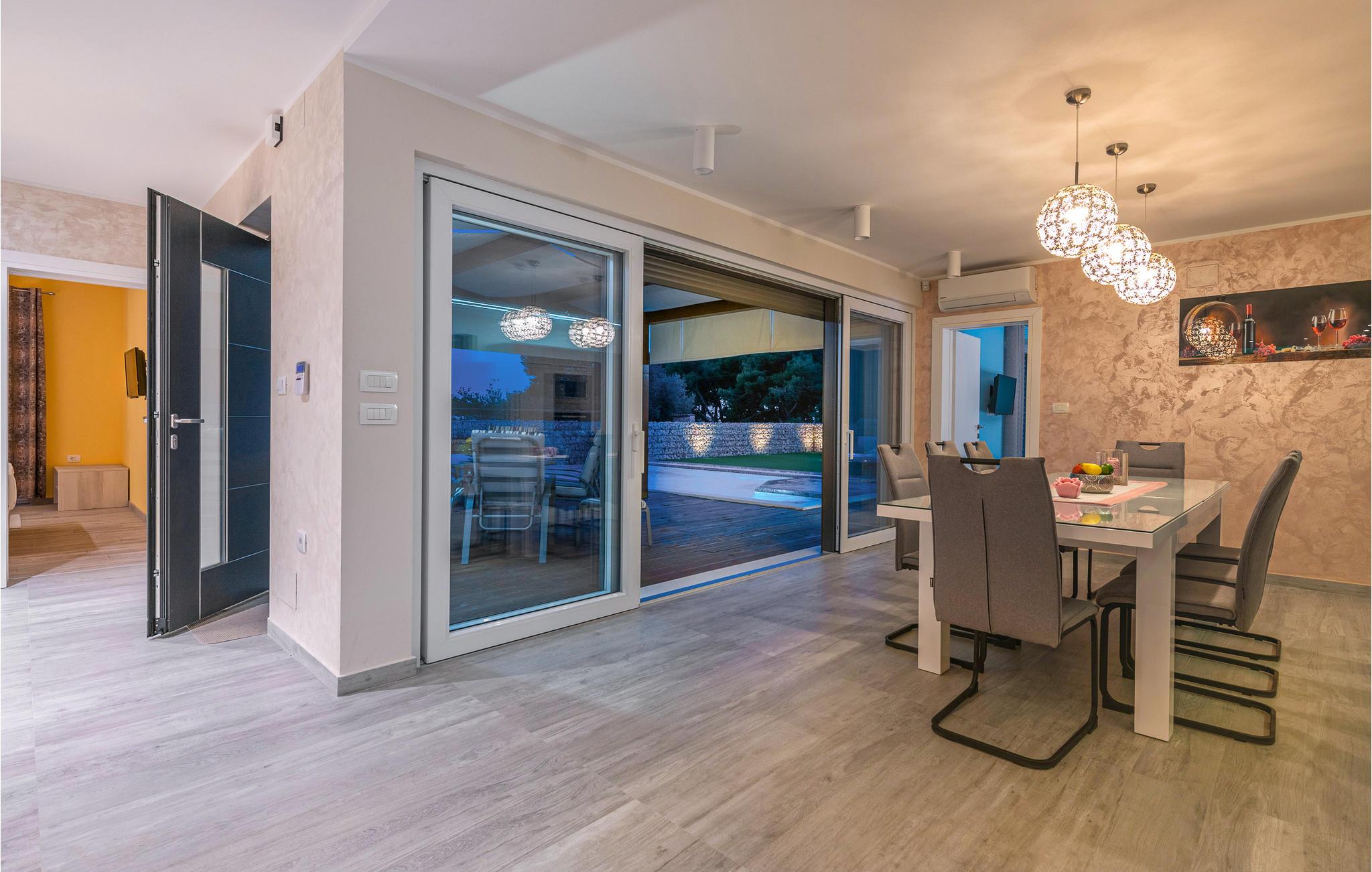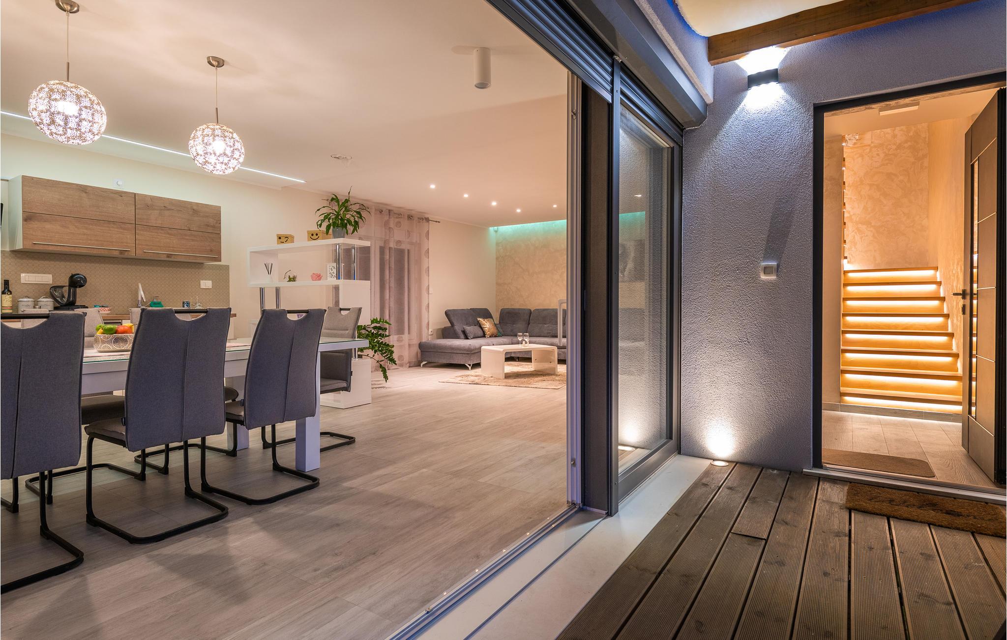 Interiøret er smukt og moderne med komfortable møbler og tilbyder jer alt, hvad I behøver til en afslappende ferie. Huset består af to etager, som er forbundet via en intern trappe. Stueetagen består af et åbent rum med køkken, spisestue og stue og to soveværelser med badeværelser. På første sal, der tilbyder en smuk udsigt over havet og Medulin-bugten, er der to soveværelser med eget badeværelse.