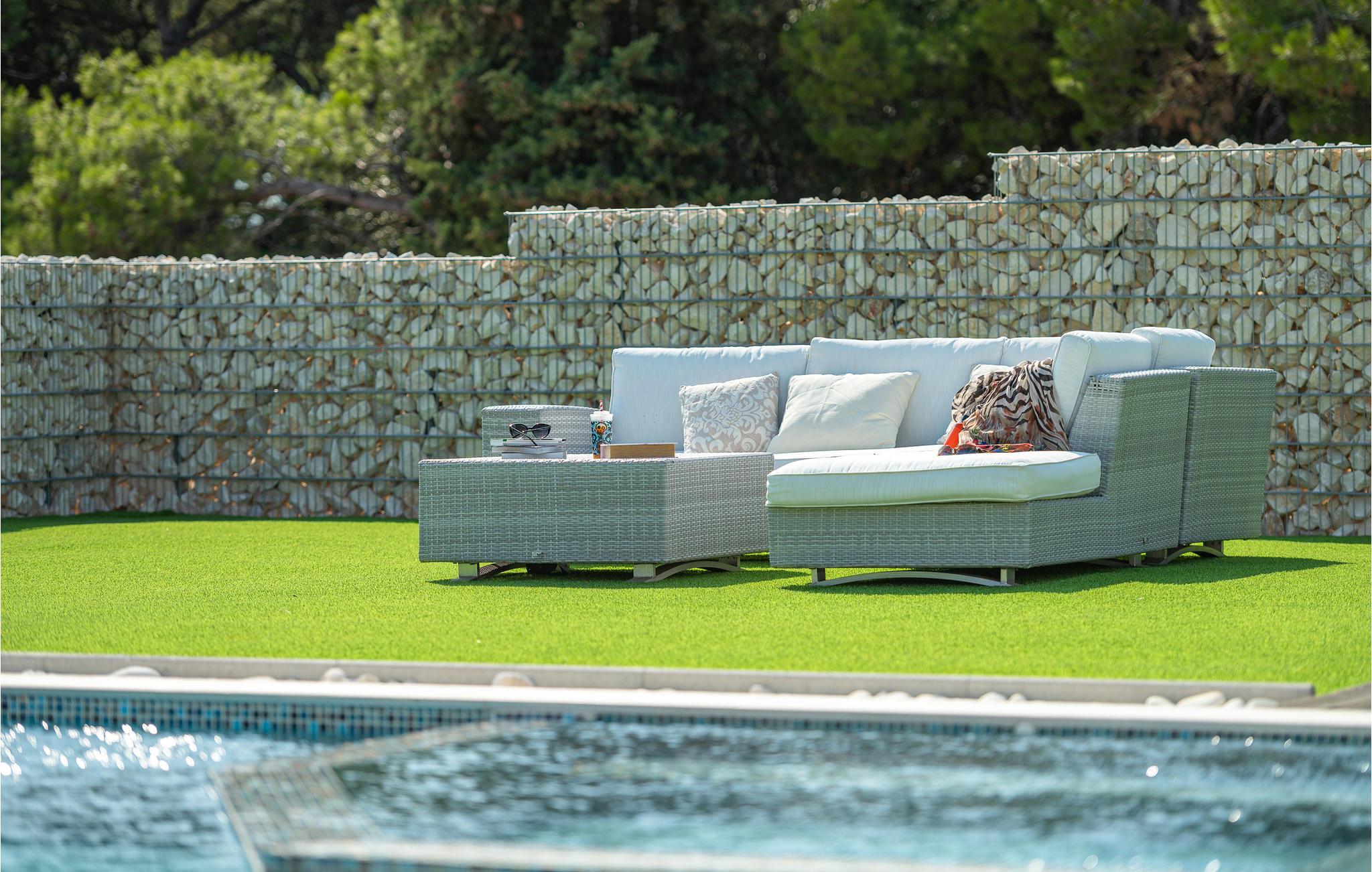 I kan se frem til behagelige øjeblikke på den overdækkede terrasse eller græsplænen med den skønne pool og whirlpool til seks personer. Slap af på havemøblerne eller liggestolene og lad tankerne vandre i disse smukke omgivelser.