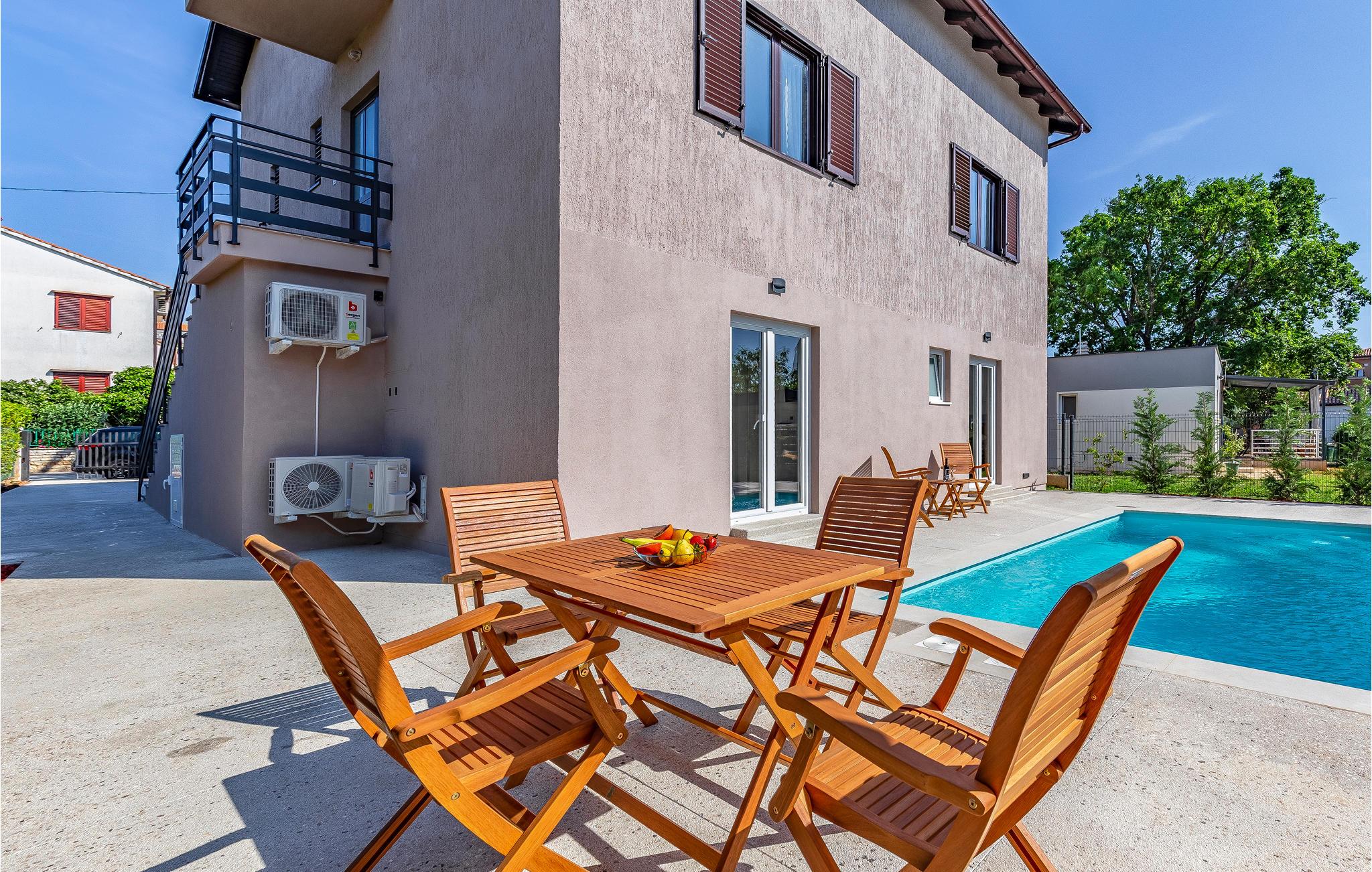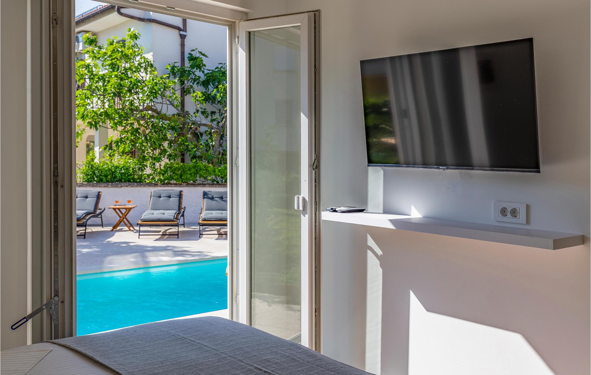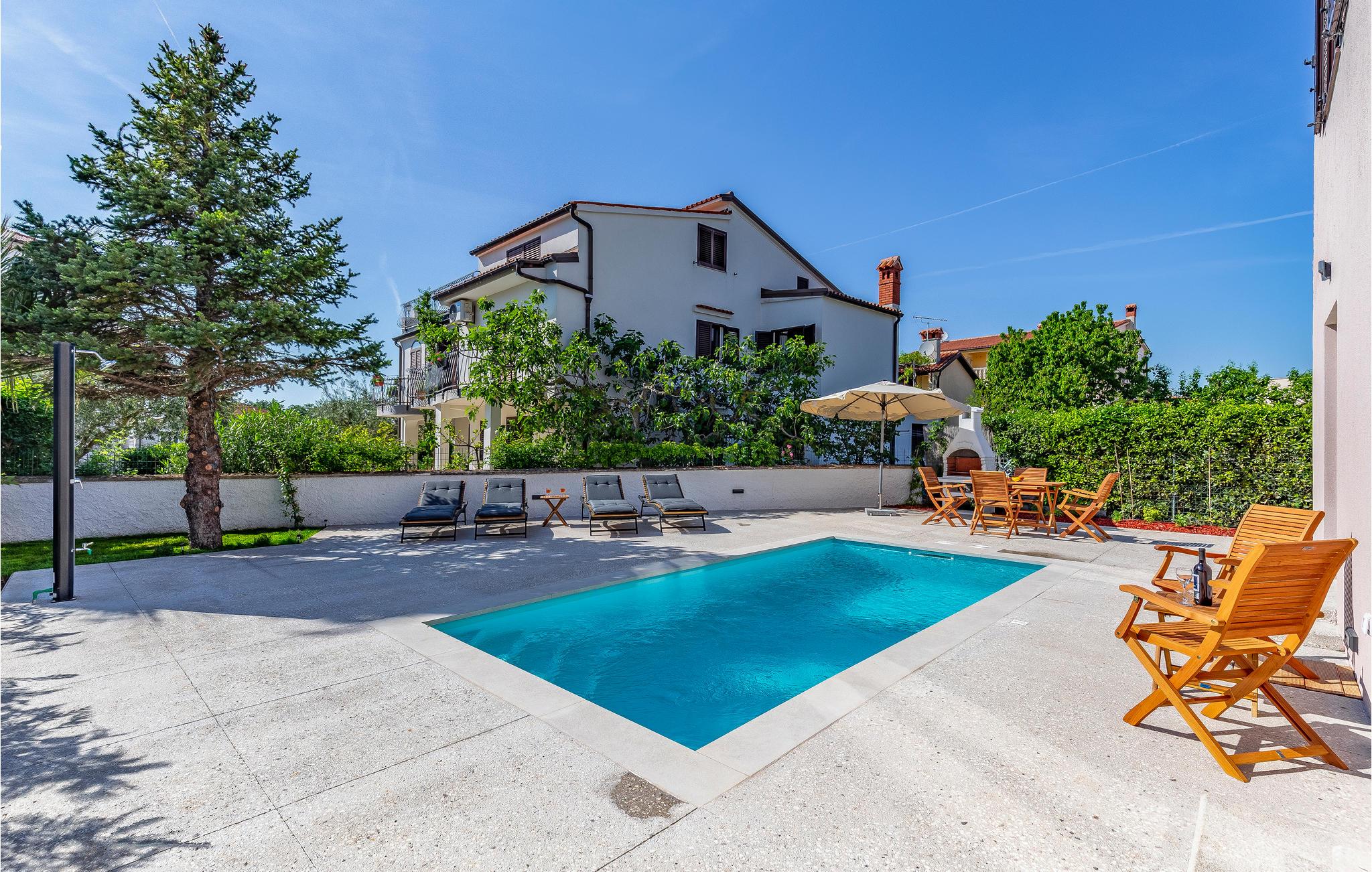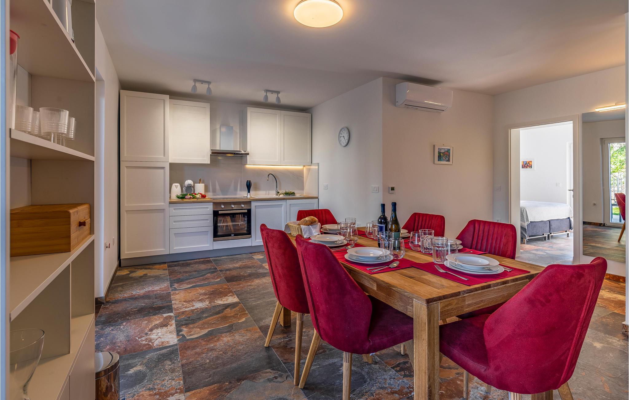 Kom til Medulin til denne smukke ferielejlighed og se frem til en fantastisk ferie med sol, strand og hav. Den moderne og luksuriøse indretning byder på alt, hvad I har brug for til en afslappende ferie. Det naturlige samlingspunkt er det dejlige køkkenalrum, hvor I kan nyde måltiderne sammen. Herfra I adgang til udendørsarealet med privat pool. Tag en forfriskende dukkert og lad solen tørre jer på en af liggestolene. Om aftenen kan I tilberede lækker grillmad på stengrillen.
