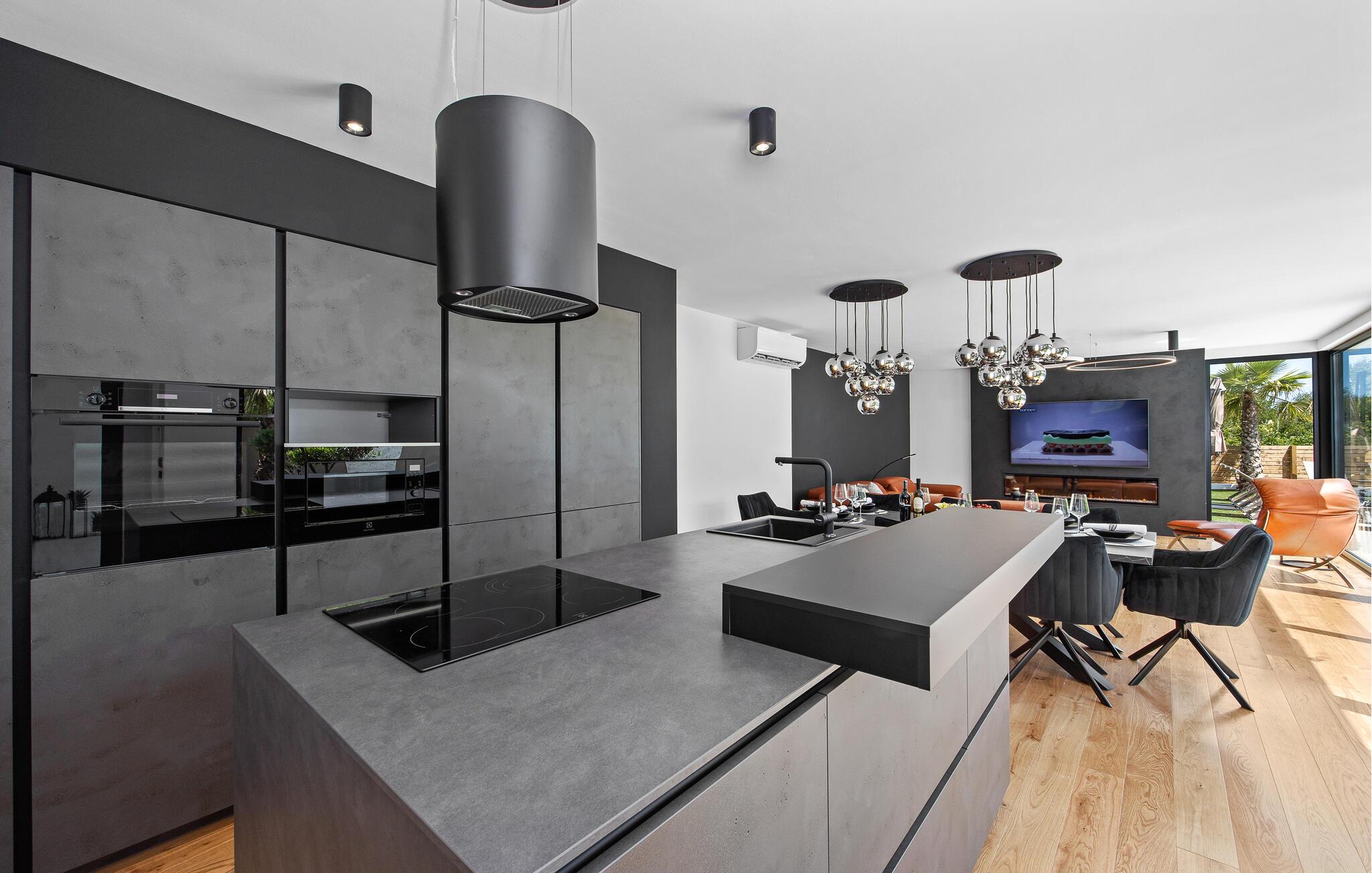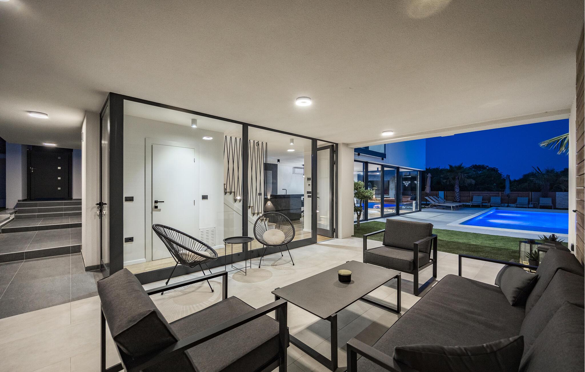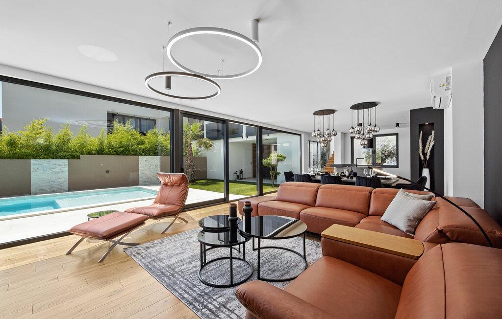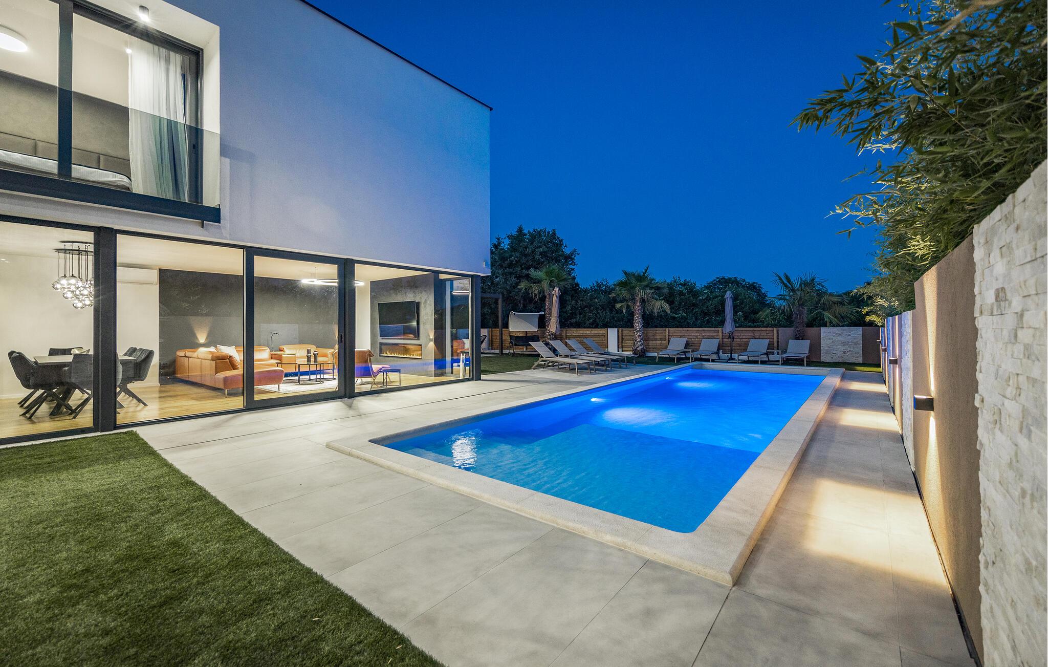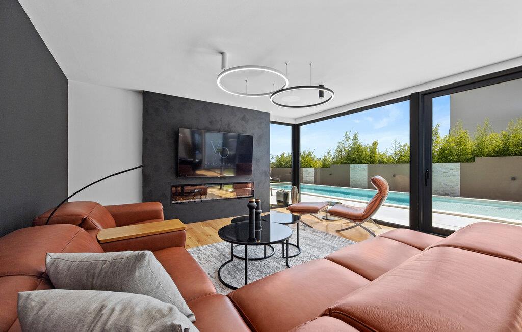 Dette moderne designerhjem vil glæde jer med sin enestående arkitektur, elegante møbler og adskillige faciliteter. Hold at tilberede lækre måltider i køkkenet af høj kvalitet med et glas vin, tænd brændeovnen og tag plads i den stilfulde spiseplads. Tilbring afslappende stunder i saunaen og glæd jer til afslappende filmaftener i den store stue, hvor rummelige vinduesfronter giver udsigt til den stemningsfuldt oplyste pool.
