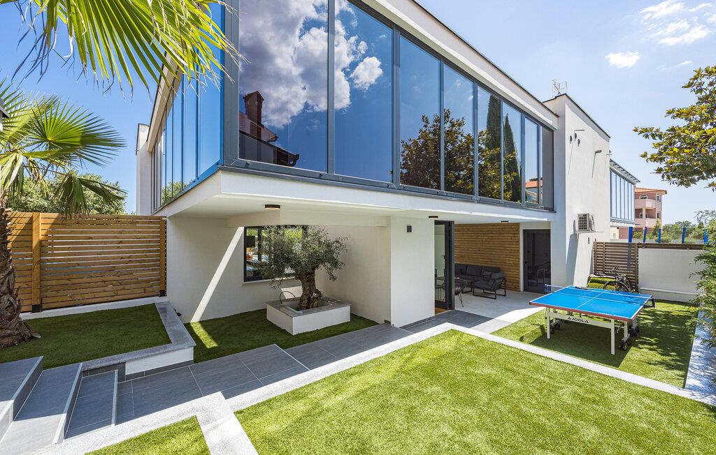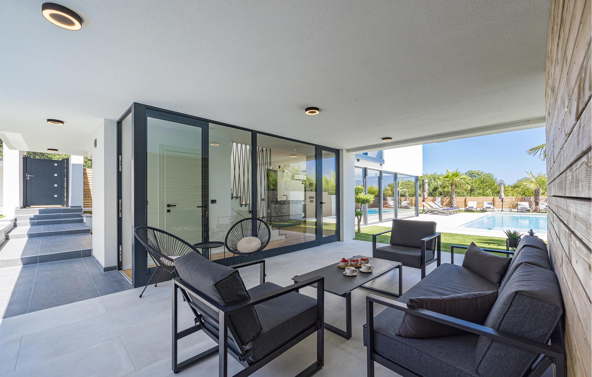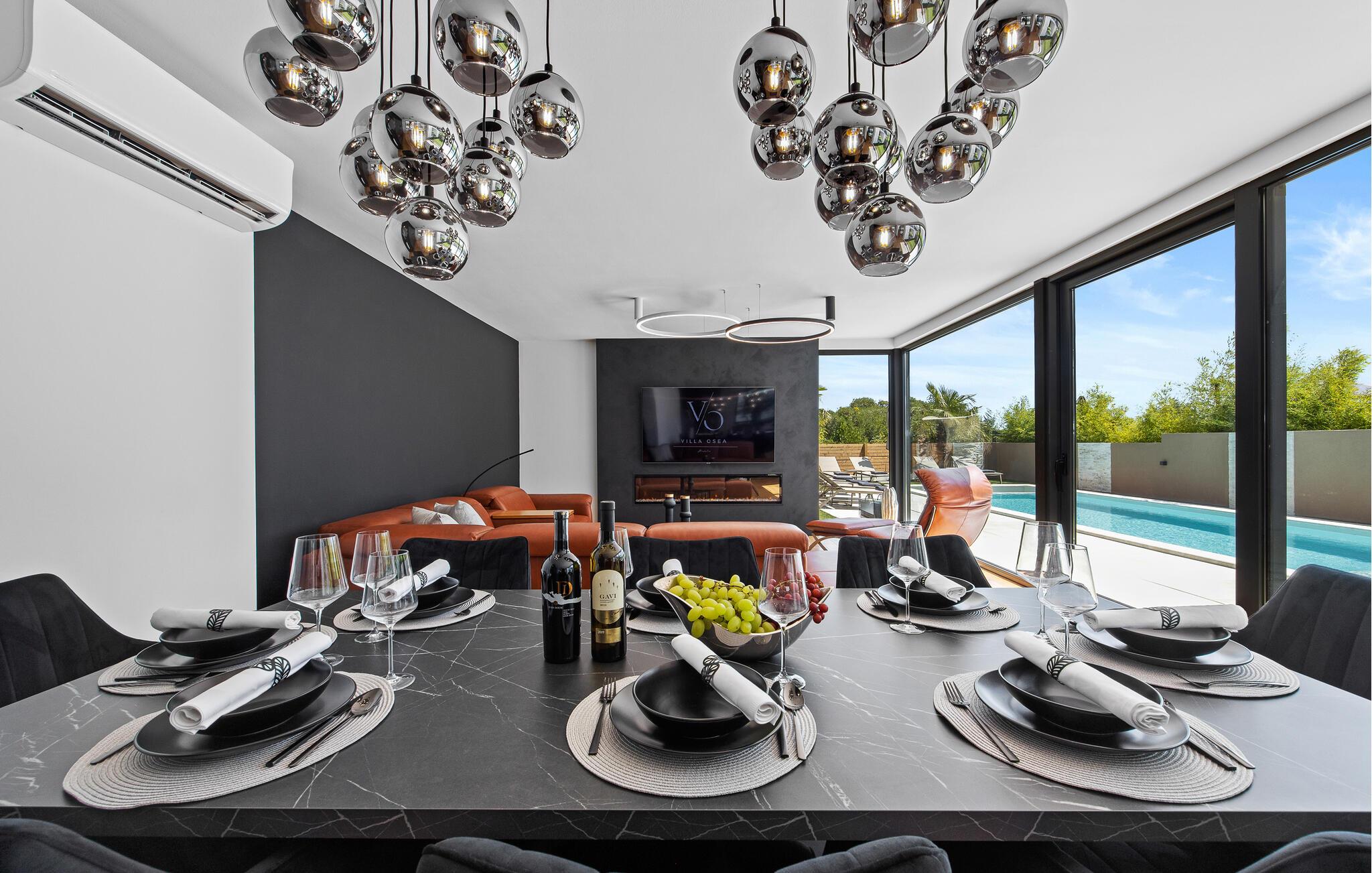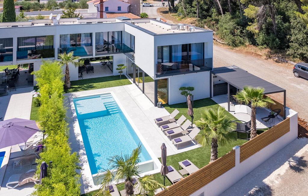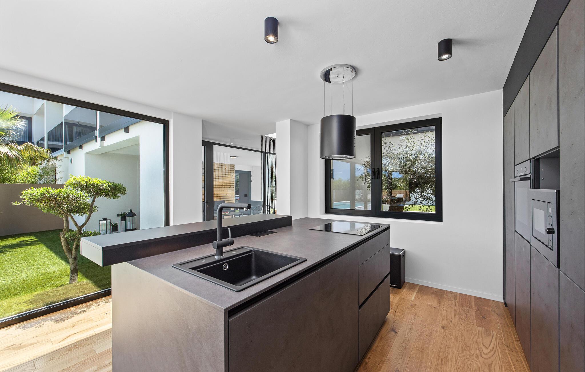 Dette moderne designerhjem vil glæde jer med sin enestående arkitektur, elegante møbler og adskillige faciliteter. Hold at tilberede lækre måltider i køkkenet af høj kvalitet med et glas vin, tænd brændeovnen og tag plads i den stilfulde spiseplads. Tilbring afslappende stunder i saunaen og glæd jer til afslappende filmaftener i den store stue, hvor rummelige vinduesfronter giver udsigt til den stemningsfuldt oplyste pool.