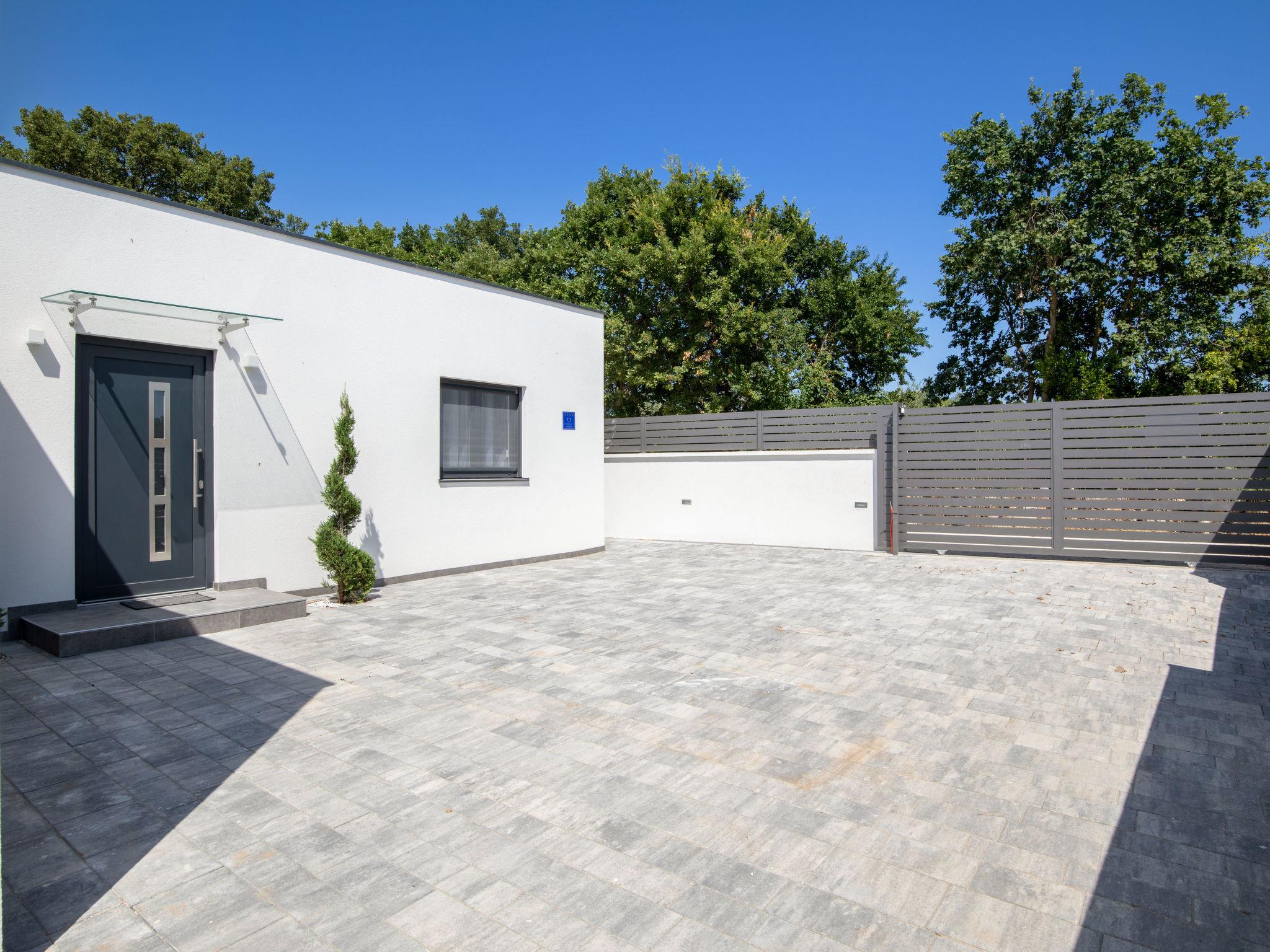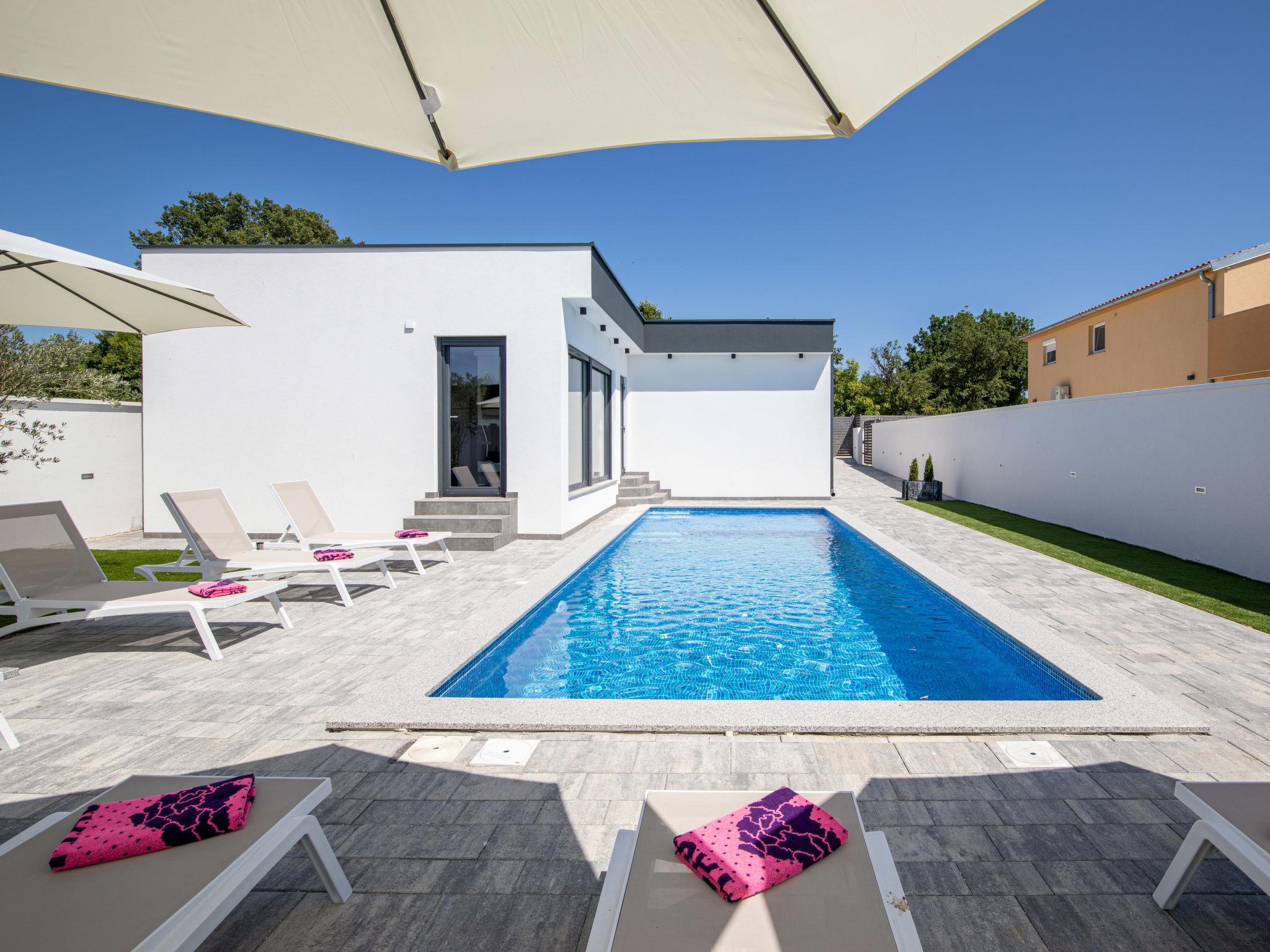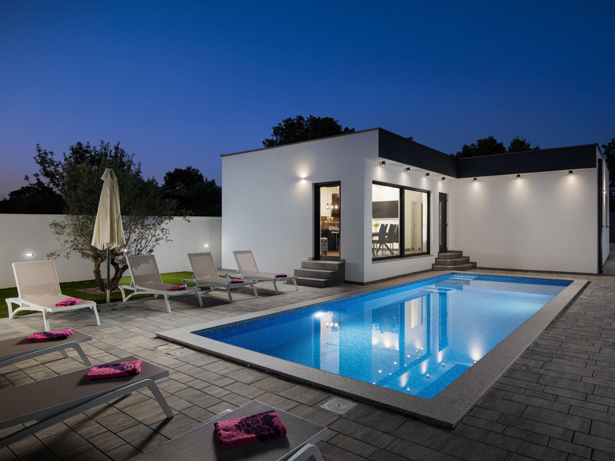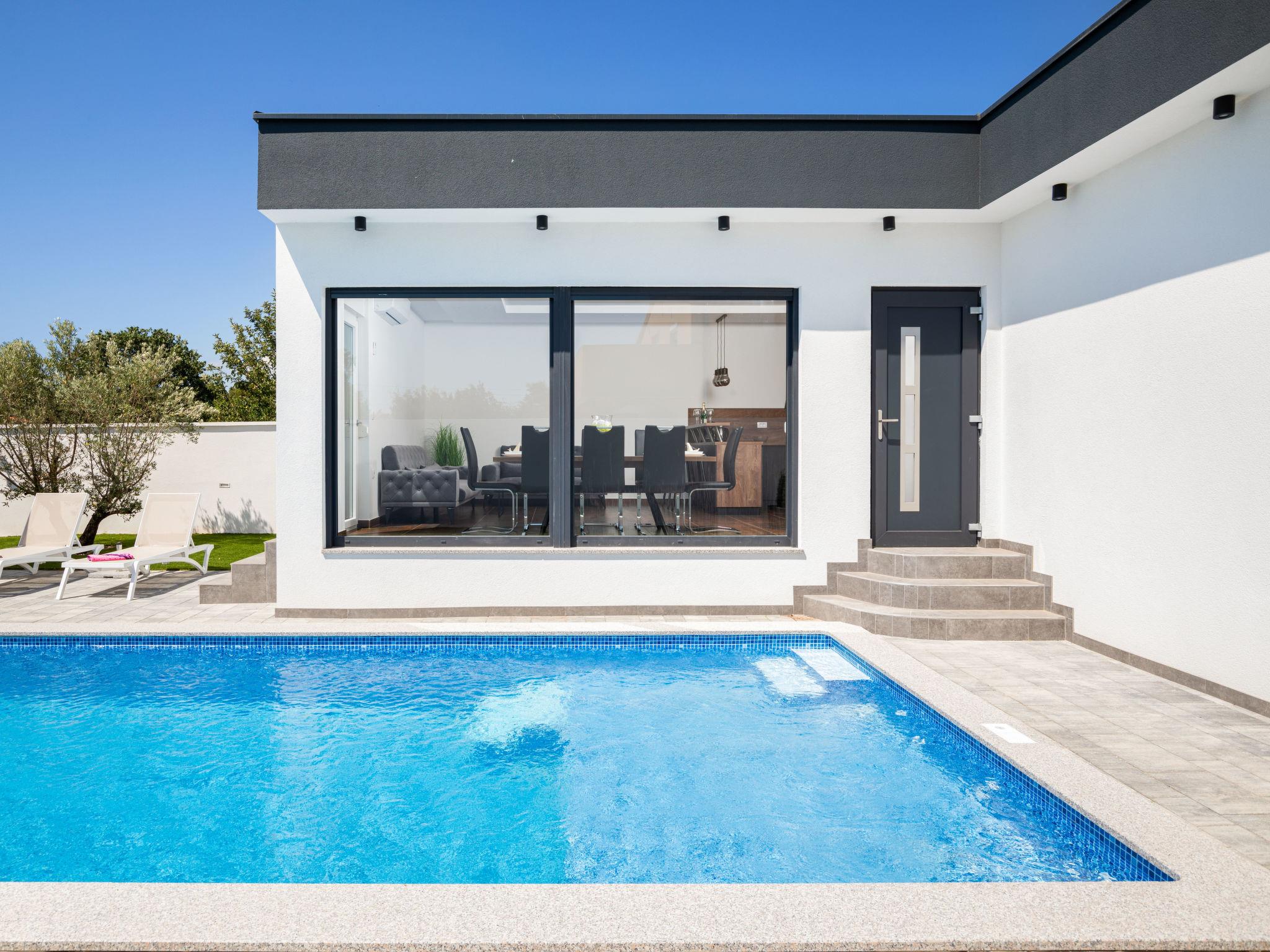 Modern house "L&L". 1.5 km from the centre of Medulin, 10 km from the centre of Pula, in a sunny position, 1.3 km from the sea, 1.3 km from the beach. Private: property 450 m2 (fenced), swimming pool angular, heated (35 m2, depth 140 cm, seasonal availability: 01.May. - 01.Nov.) with internal staircase and salt-electrolysis pool-cleaning system. Outdoor shower, pool house with WC, terrace (20 m2), garden furniture, barbecue. In the house: internet access, air conditioning, washing machine. Parking (for 3 cars) at the house on the premises. Shop 600 m, supermarket 1 km, restaurant 700 m, bus stop 750 m, sandy beach 2 km pebble beach 1.3 km. Surf school 2 km, riding stable 1 km, walking paths from the house 500 m, cycle lane 300 m. Nearby attractions: Amphitheater 10 km. The owner does not accept any youth groups. Swimming pool heated (extra). It is necessary to announce 7 days in advance if the pool heating is required.