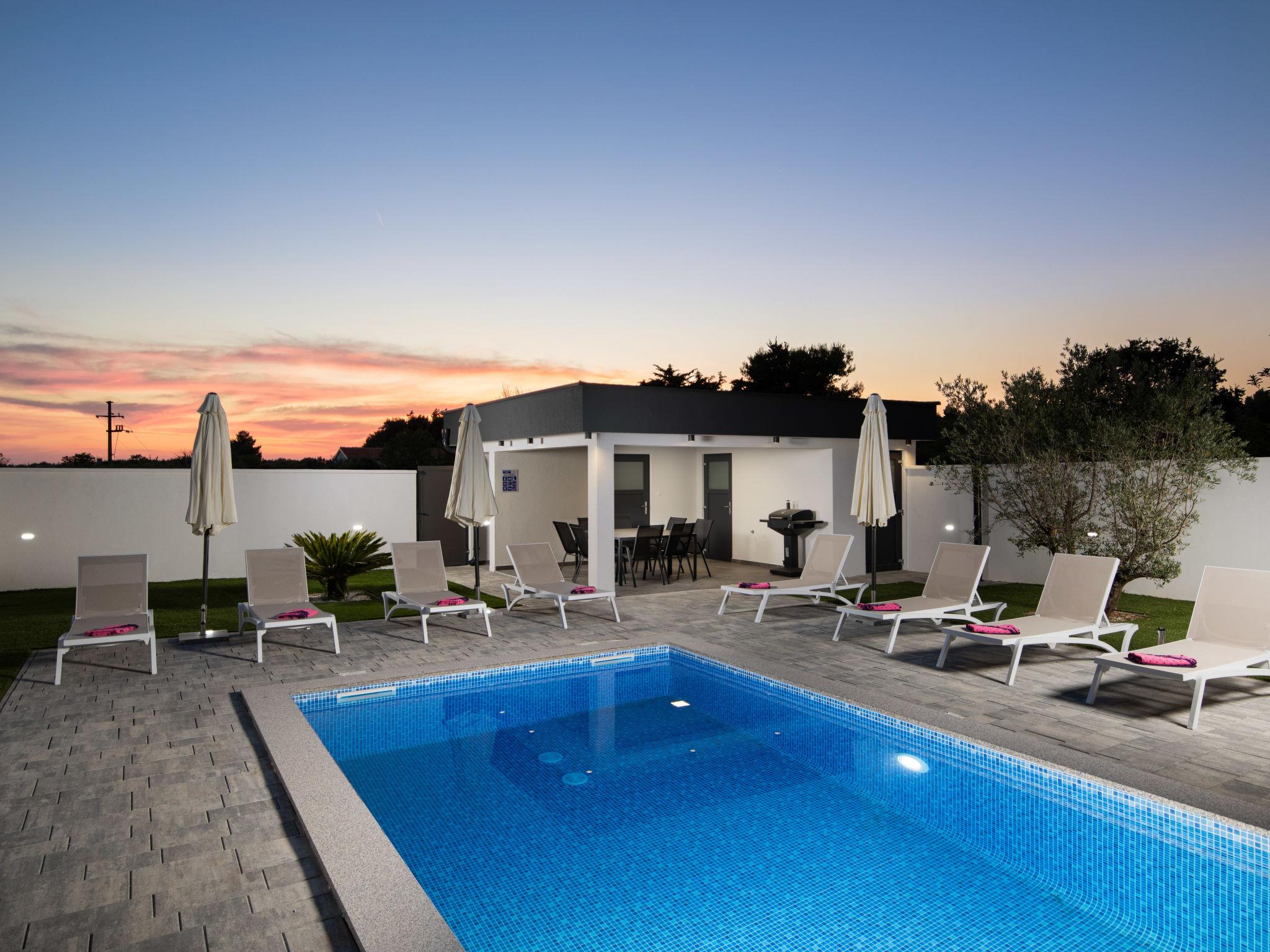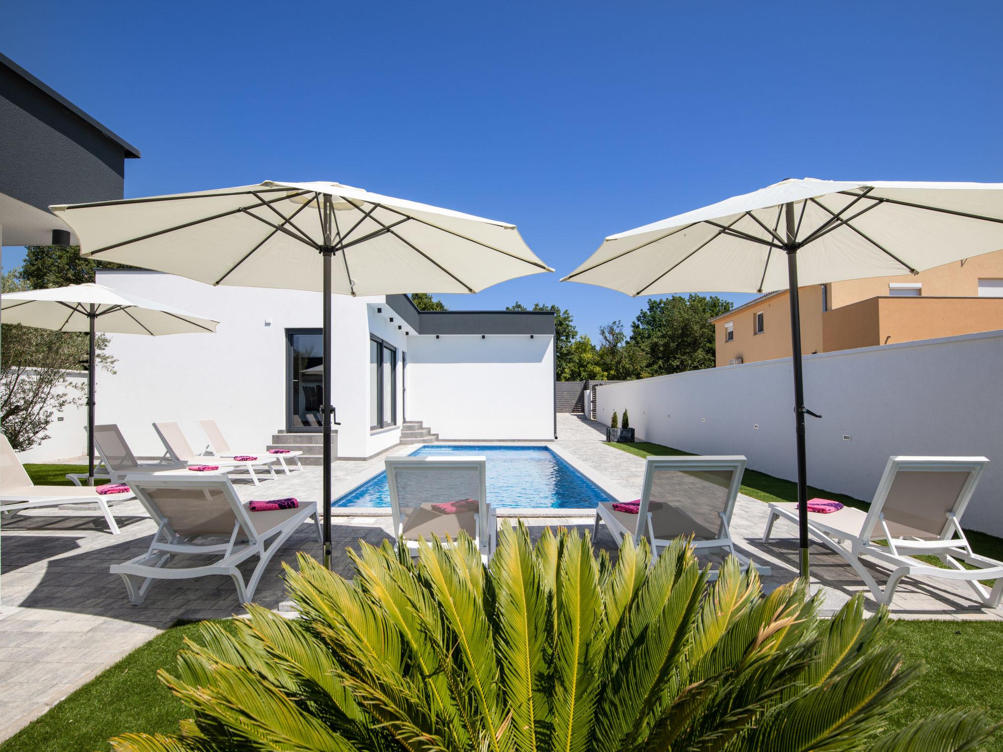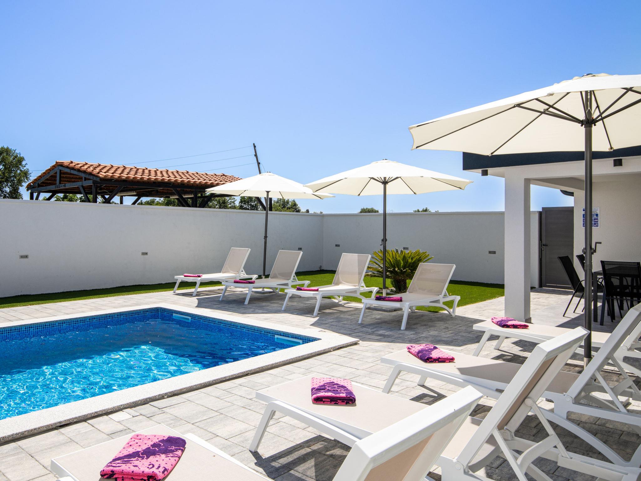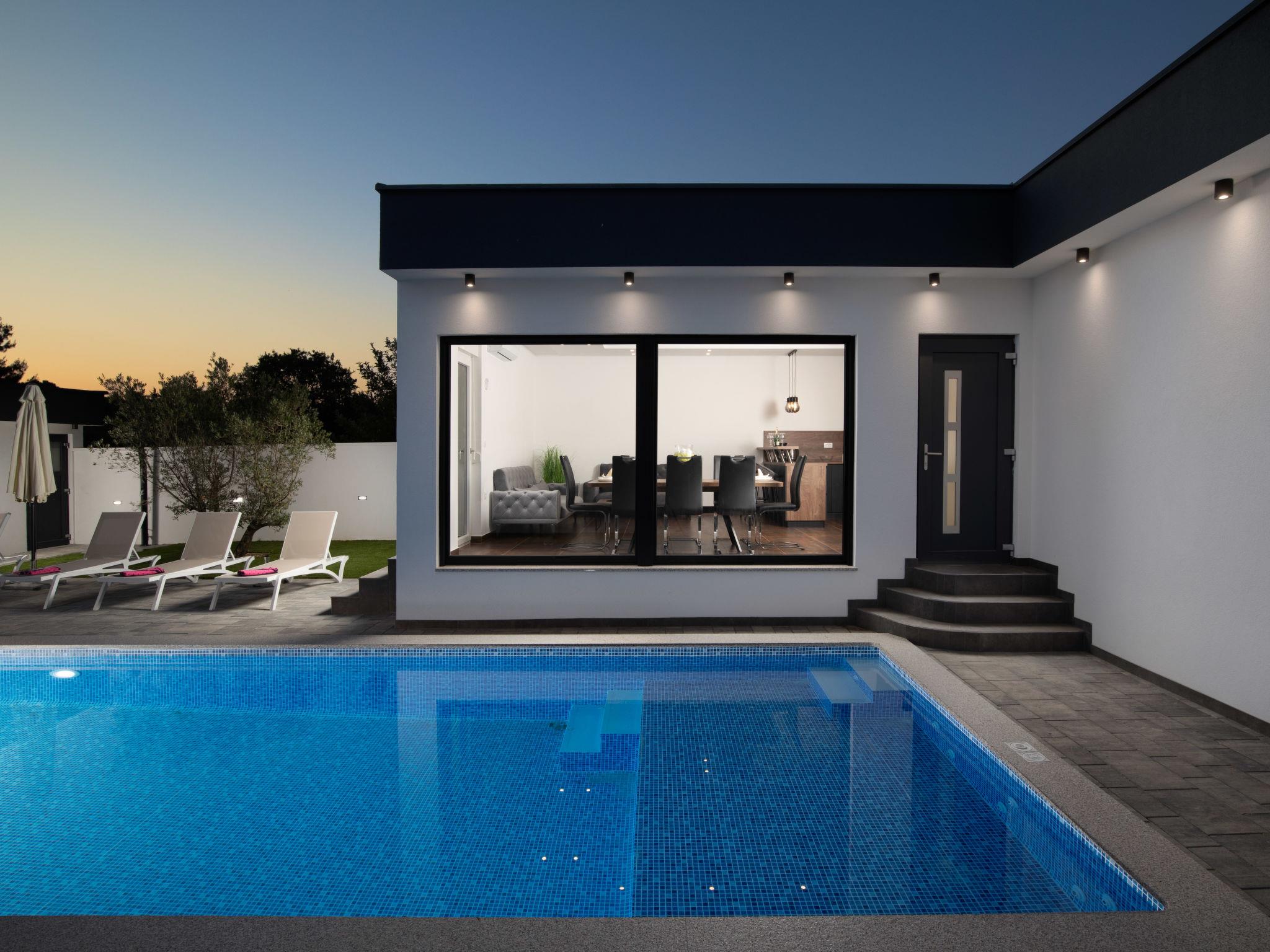 Modern house "L&L". 1.5 km from the centre of Medulin, 10 km from the centre of Pula, in a sunny position, 1.3 km from the sea, 1.3 km from the beach. Private: property 450 m2 (fenced), swimming pool angular, heated (35 m2, depth 140 cm, seasonal availability: 01.May. - 01.Nov.) with internal staircase and salt-electrolysis pool-cleaning system. Outdoor shower, pool house with WC, terrace (20 m2), garden furniture, barbecue. In the house: internet access, air conditioning, washing machine. Parking (for 3 cars) at the house on the premises. Shop 600 m, supermarket 1 km, restaurant 700 m, bus stop 750 m, sandy beach 2 km pebble beach 1.3 km. Surf school 2 km, riding stable 1 km, walking paths from the house 500 m, cycle lane 300 m. Nearby attractions: Amphitheater 10 km. The owner does not accept any youth groups. Swimming pool heated (extra). It is necessary to announce 7 days in advance if the pool heating is required.