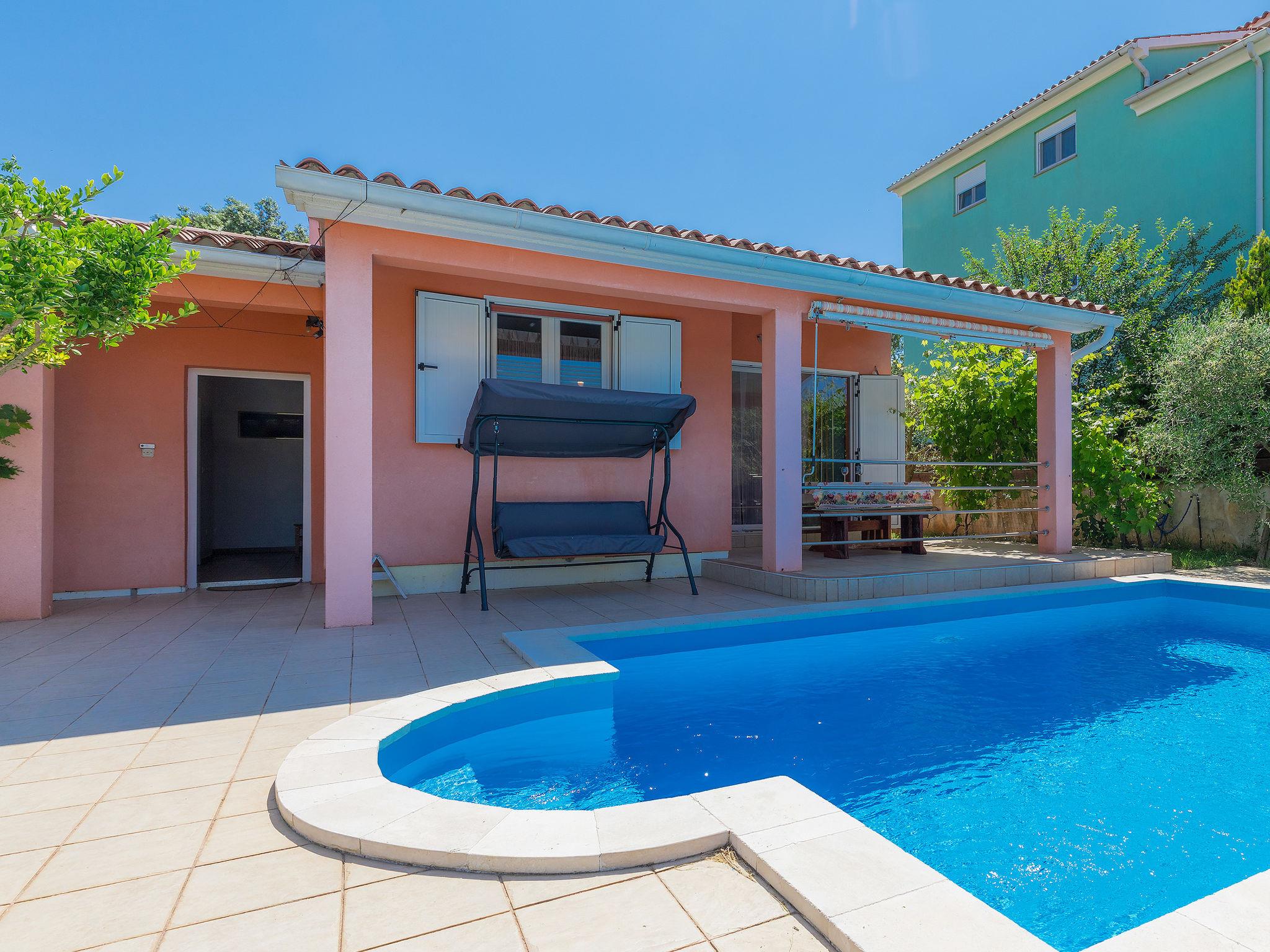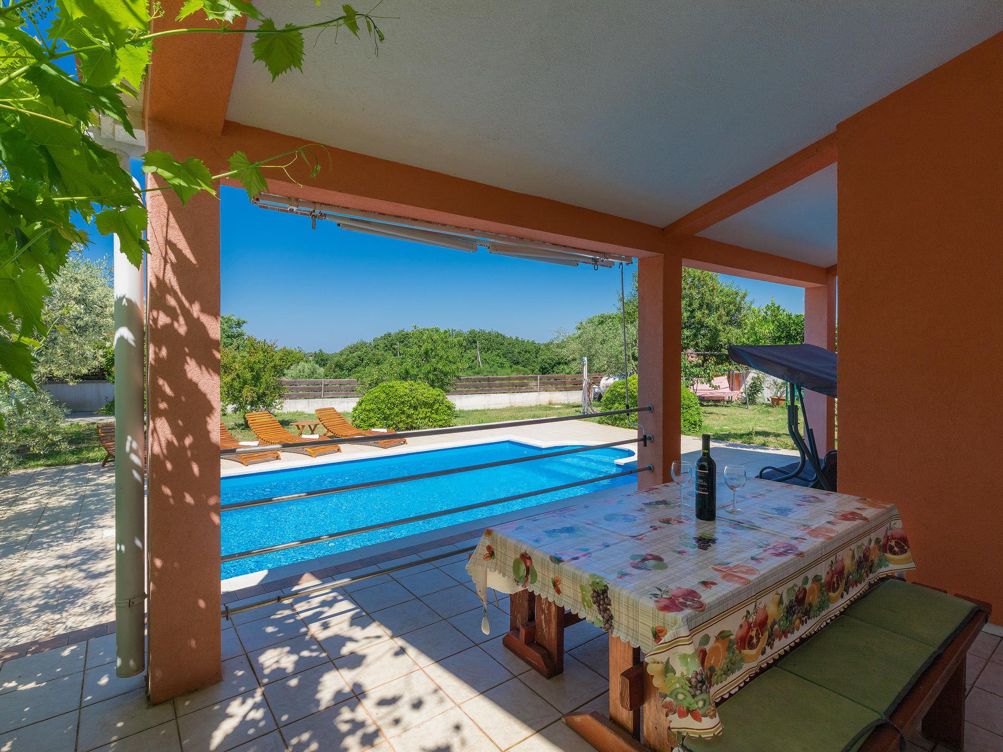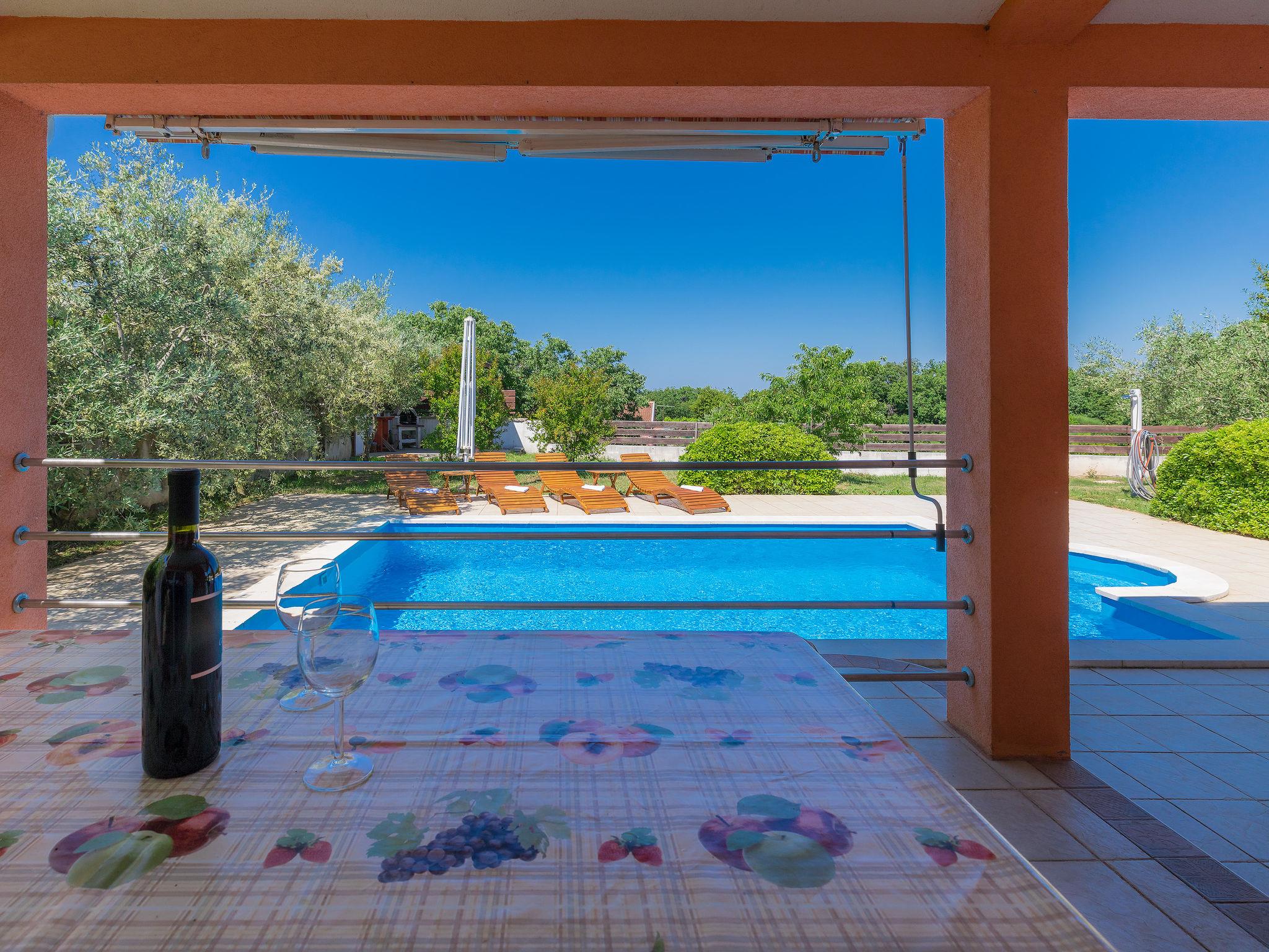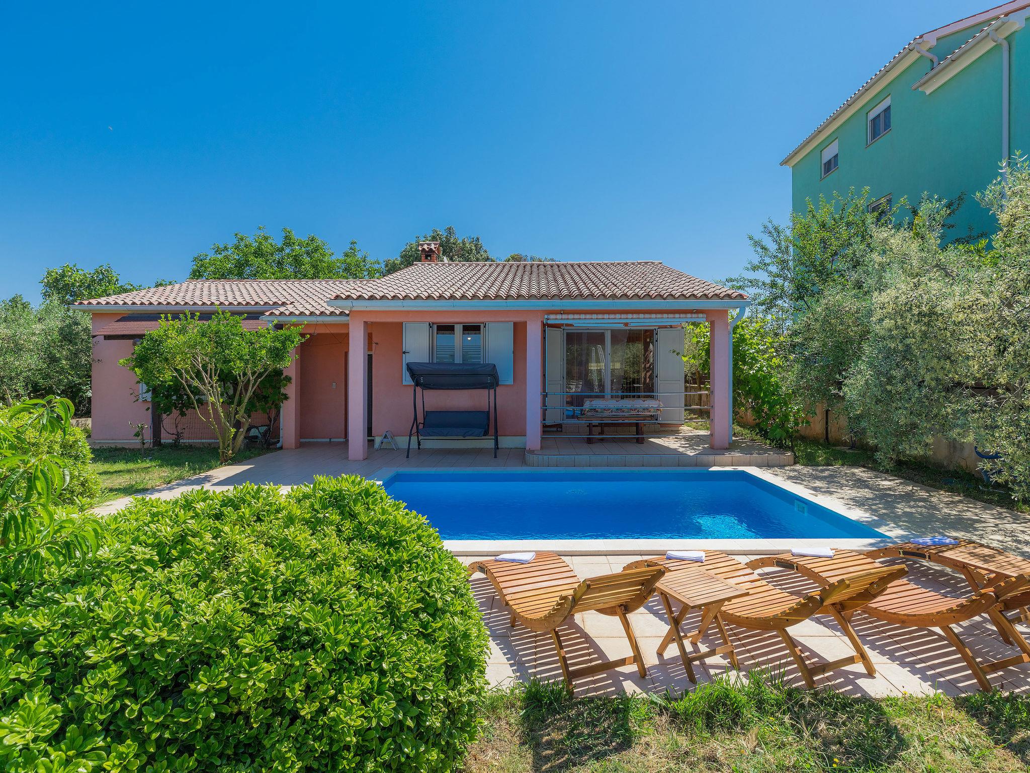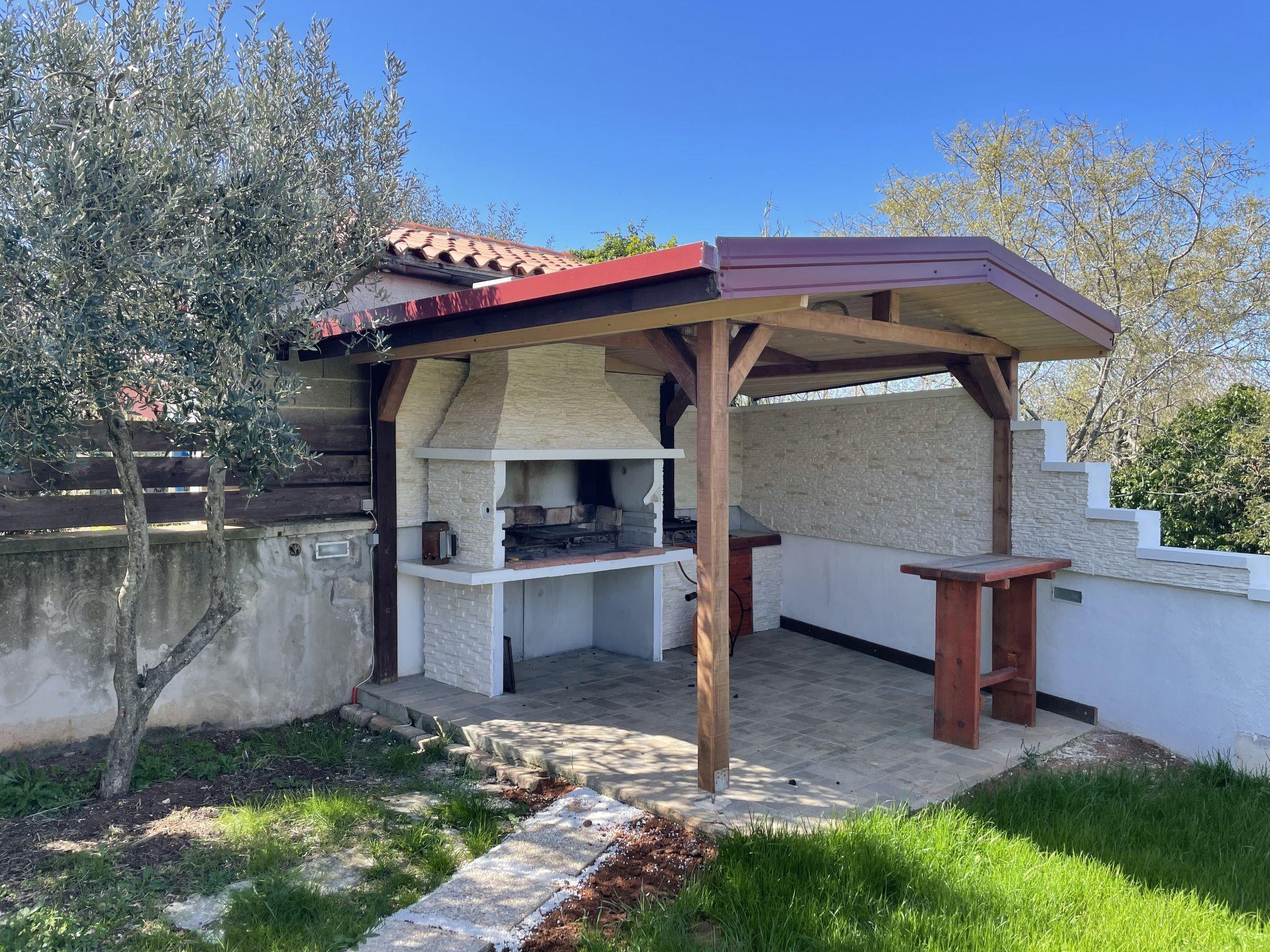 Single-family house "Cherry". 800 m from the centre of Ližnjan, 3 km from the centre of Medulin, 10 km from the centre of Pula, 1.5 km from the sea, 1.5 km from the beach. Private: property 600 m2 (fenced) with lawn, swimming pool (6 x 4 m, depth 130 cm, seasonal availability: 01.May. - 07.Oct.). Outdoor shower, barbecue. In the house: internet access, washing machine, tumble dryer. Motor access to the house (150 m via unmade road). Parking (for 2 cars) on the premises. Shop 300 m, restaurant 400 m, bus stop 900 m, pebble beach 1.5 km, rocky beach 1.5 km. Marina 13 km. Please note: the owner lives on the same property.