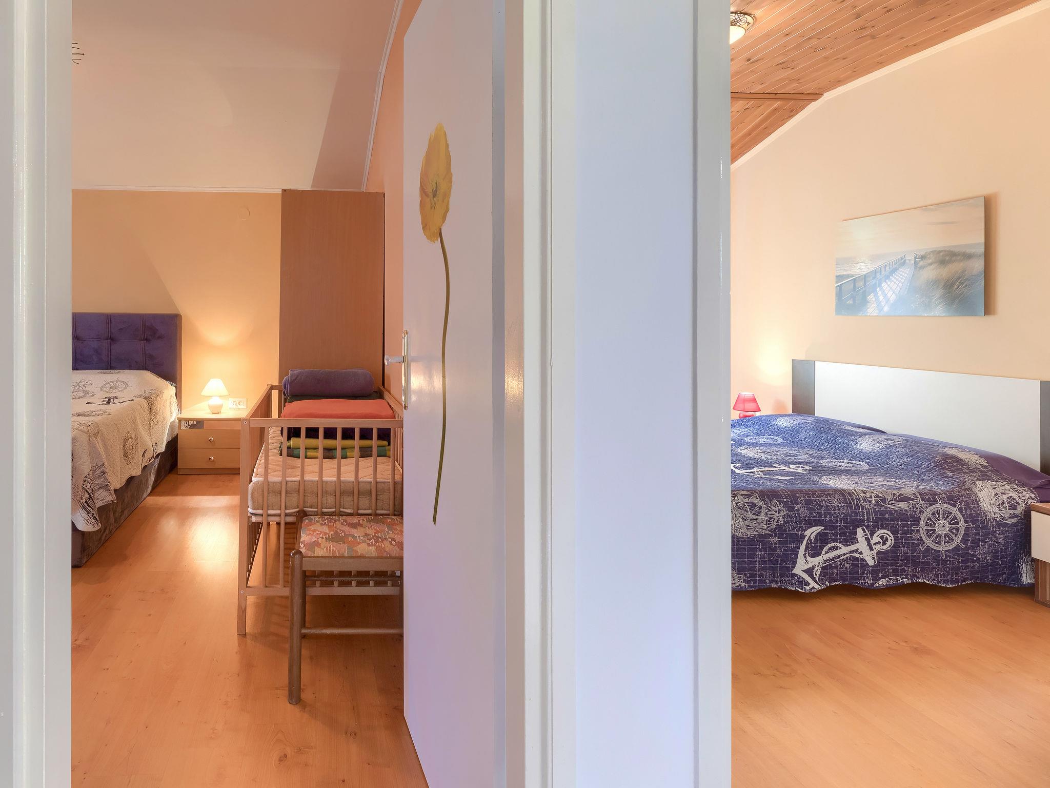 3-room house 116 m2. Living/dining room with 1 double sofabed, satellite TV and air conditioning. Exit to the terrace. 1 room with 1 double bed. 1 room with 1 french bed. Open kitchen (1 hot plate, oven, dishwasher, 3 gas rings, toaster, kettle, microwave, freezer, electric coffee machine). Bath/WC, sep. WC. Gas heating. Terrace 20 m2, roofed. Terrace furniture, deck chairs. Facilities: iron. Internet (WiFi, free). Maximum 2 pets/ dogs allowed. KLASA:UP/I335-03/20-01/384 RED.BROJ 6878