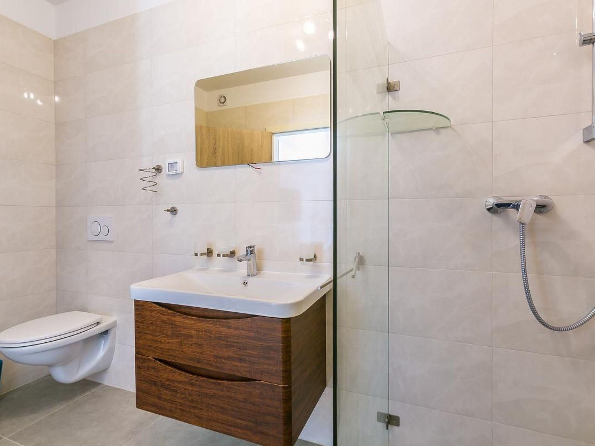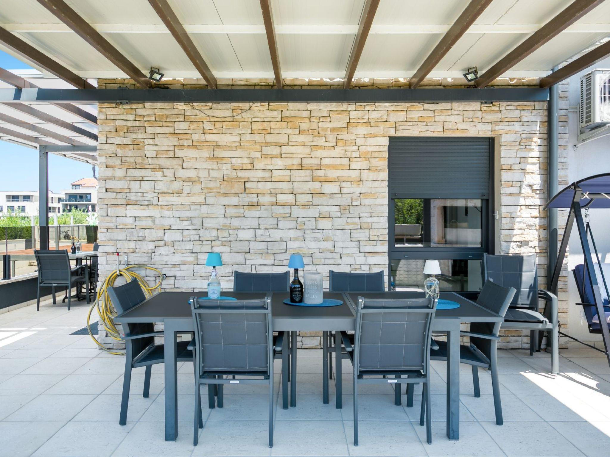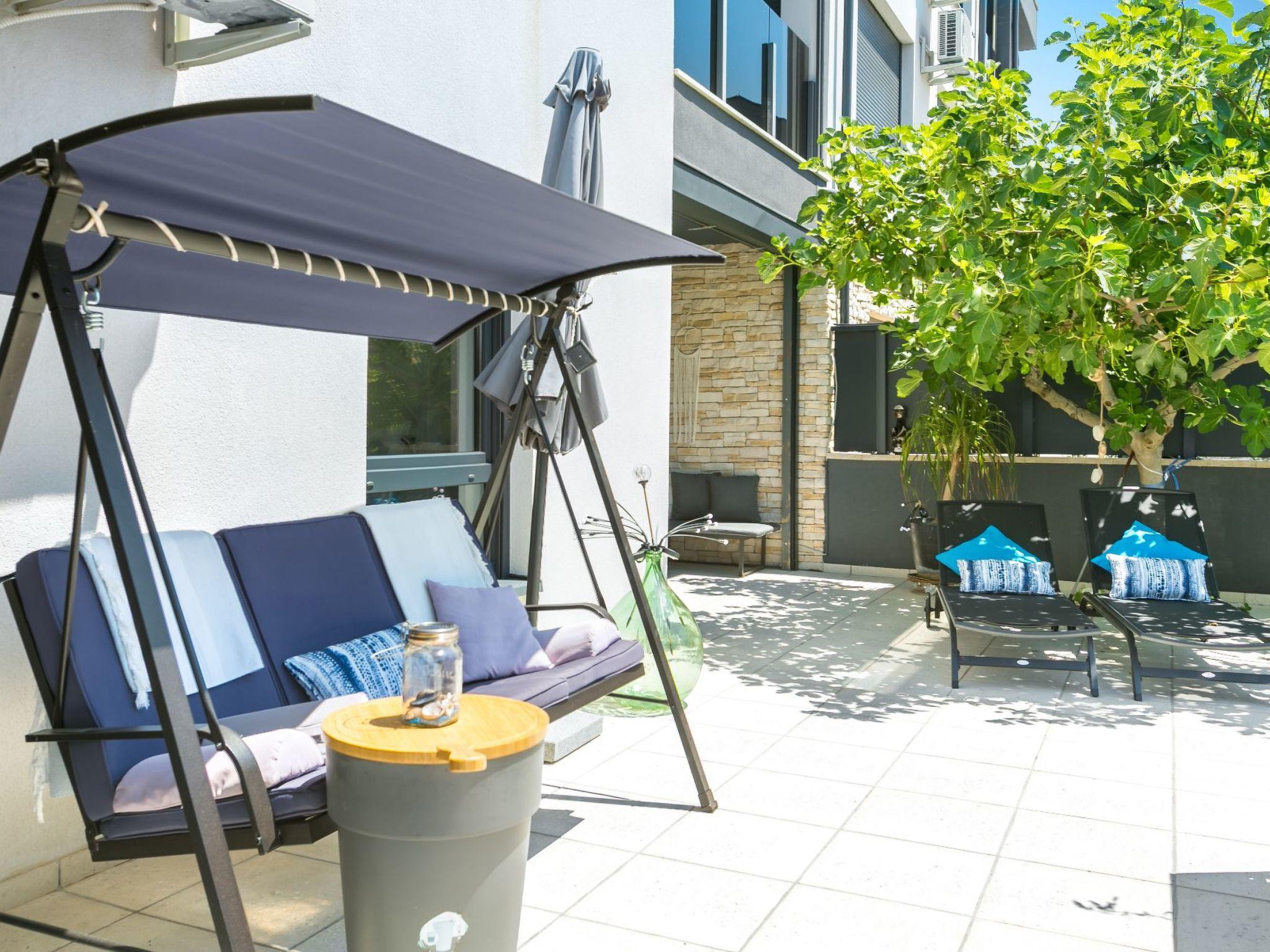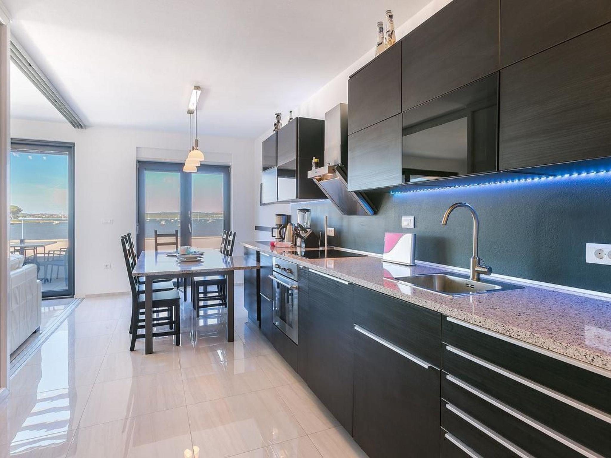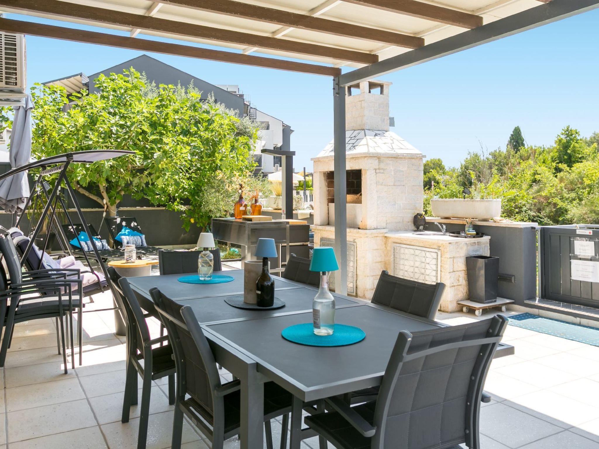 The kitchen has everything necessary for preparing a nice meal: electric stove with oven, microwave, big fridge with freezer, dishwasher, toaster, water heater, filter coffee machine, dishes and cutlery. Highlight of the apartment is the 80 m² big terrace where you will surely enjoy making barbecue with your friends, and bonus is a communal swimming pool where you can freshen' up during those hot summer days. You also have WiFi, washer/dryer and one parking space. Pets are not allowed. Bed sheets and towels are included in the price. From 2025, Clients have direct access to the sea(no bathing area) from terrace. Convenient for those who have a SUP, inflatable boat, rowing boat, canoe etc.