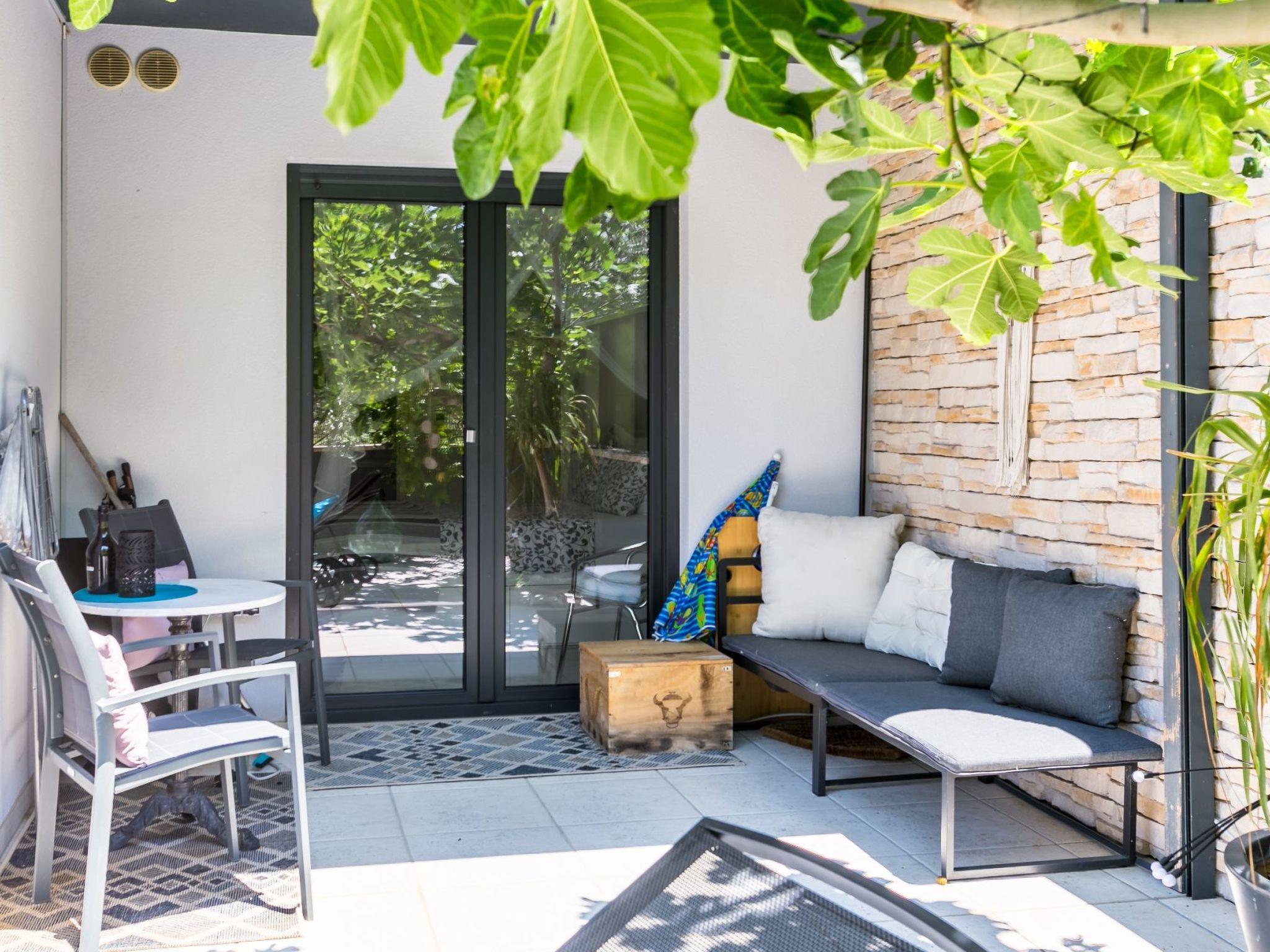 The apartment is situated on the ground floor and can accommodate 4 people. With its 80 m² size, it offers: two double bedrooms, an air conditioned living room combined with kitchen, two shower bathrooms and a terrace with view of the sea, olive trees and Mediterranean herbs.