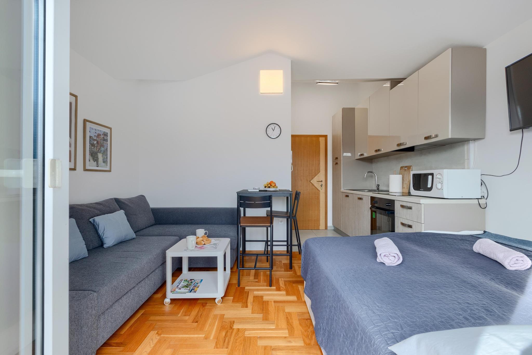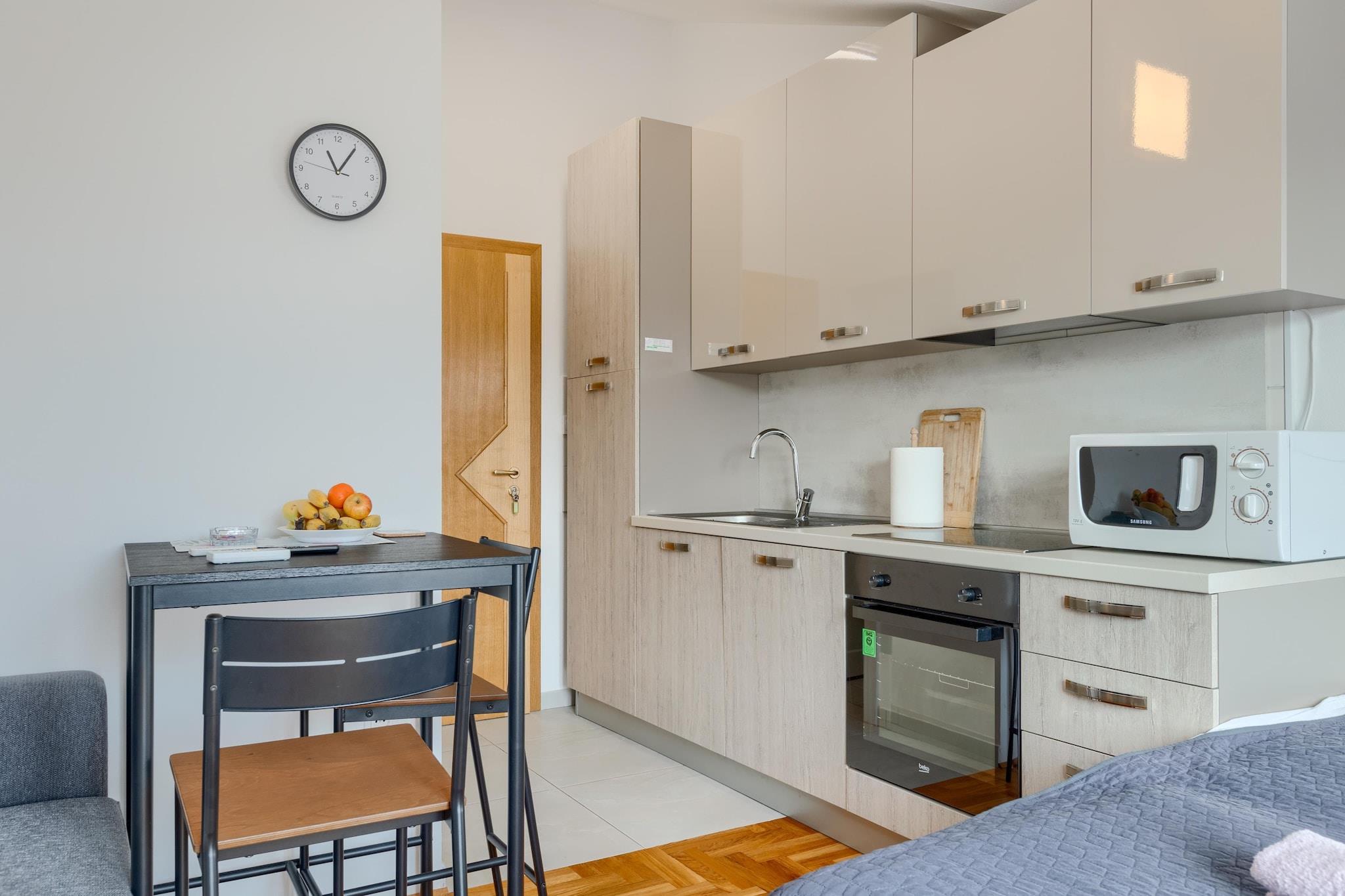 Forestil dig at træde ind i en lys og indbydende lejlighed i stueetagen i hjertet af Medulin, skabt til en fredelig ferie for to. Dette elegante rum byder dig velkommen med en blid summen af stille, behageligt blødt lys, rene linjer og naturlige detaljer, der skaber en perfekt base for din ferie i Istrien. Opholdsstuen flyder ubesværet fra sofa til spisebord og tilbyder plads til at slappe af, læse eller blot se lyset skifte, mens middagen simrer i det åbne køkken. Med moderne apparater og gennemtænkte detaljer føles hverdagen let og indbydende. Køkkenet er mere end funktionelt, det er klar til øjeblikke, du vil huske. Et køleskab med fryser, mikrobølgeovn, kaffemaskine og brødrister står sammen med gryder, bestik og køkkenredskaber, så du kan brygge din morgenespresso eller lave et måltid med lokale ingredienser. Soveværelset er roligt og privat, et sted at hvile dybt efter dagens eventyr, mens badeværelset er rent, moderne og roligt komfortabelt. Ekstraudstyr som aircondition, Wi-Fi, parkering og et pengeskab tilføjer et ekstra lag af lethed, så du kan ankomme i dit eget tempo, trække vejret ind i kystens rytme og slappe af. Kun få minutter fra din dør byder Medulin dig varmt velkommen og byder på skjulte skatte. Gå en tur til det gyldne sand, eller tag mod det dramatiske romerske amfiteater i det nærliggende Pula, en historie i sten, der strækker sig over århundreder. Tag en cykeltur gennem olivenlunde og vinmarker, find stille bugter ved Adriaterhavet, eller se solnedgangen fra en café ved havet med en lokal vin i hånden. Tilbage i lejligheden finder du stilhed, den slags der gør hvert åndedrag rigere og hvert smil mere stille, hvor tempoet i Istrien bliver dit eget.