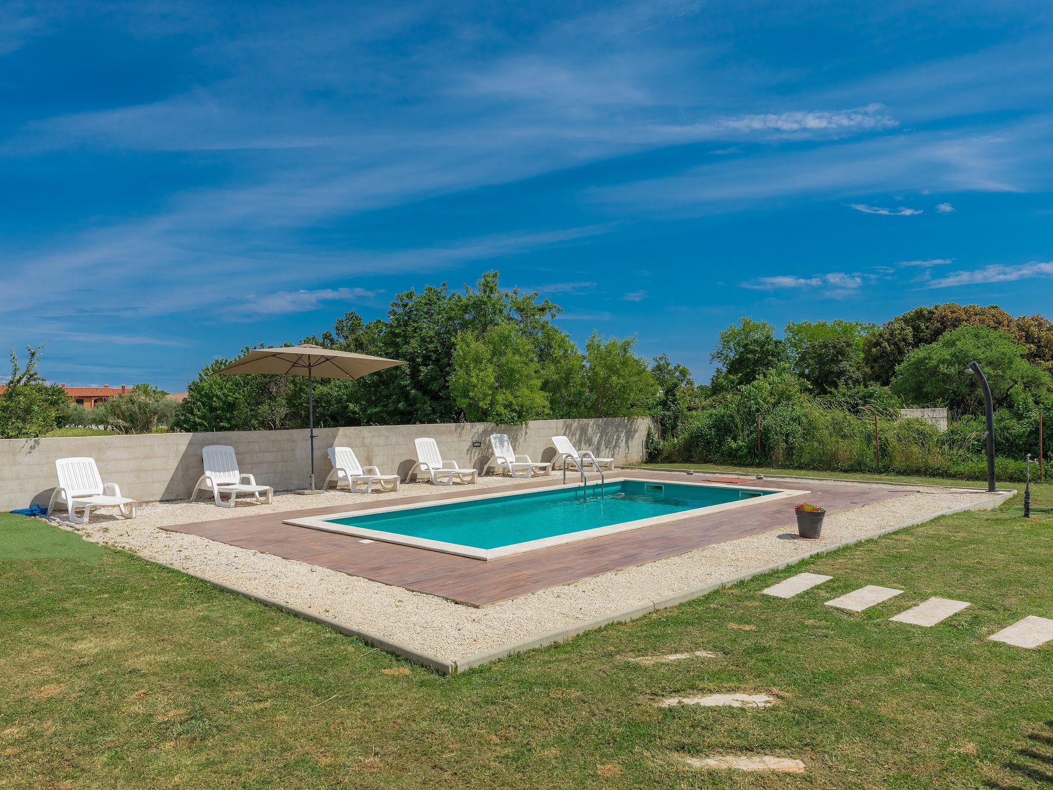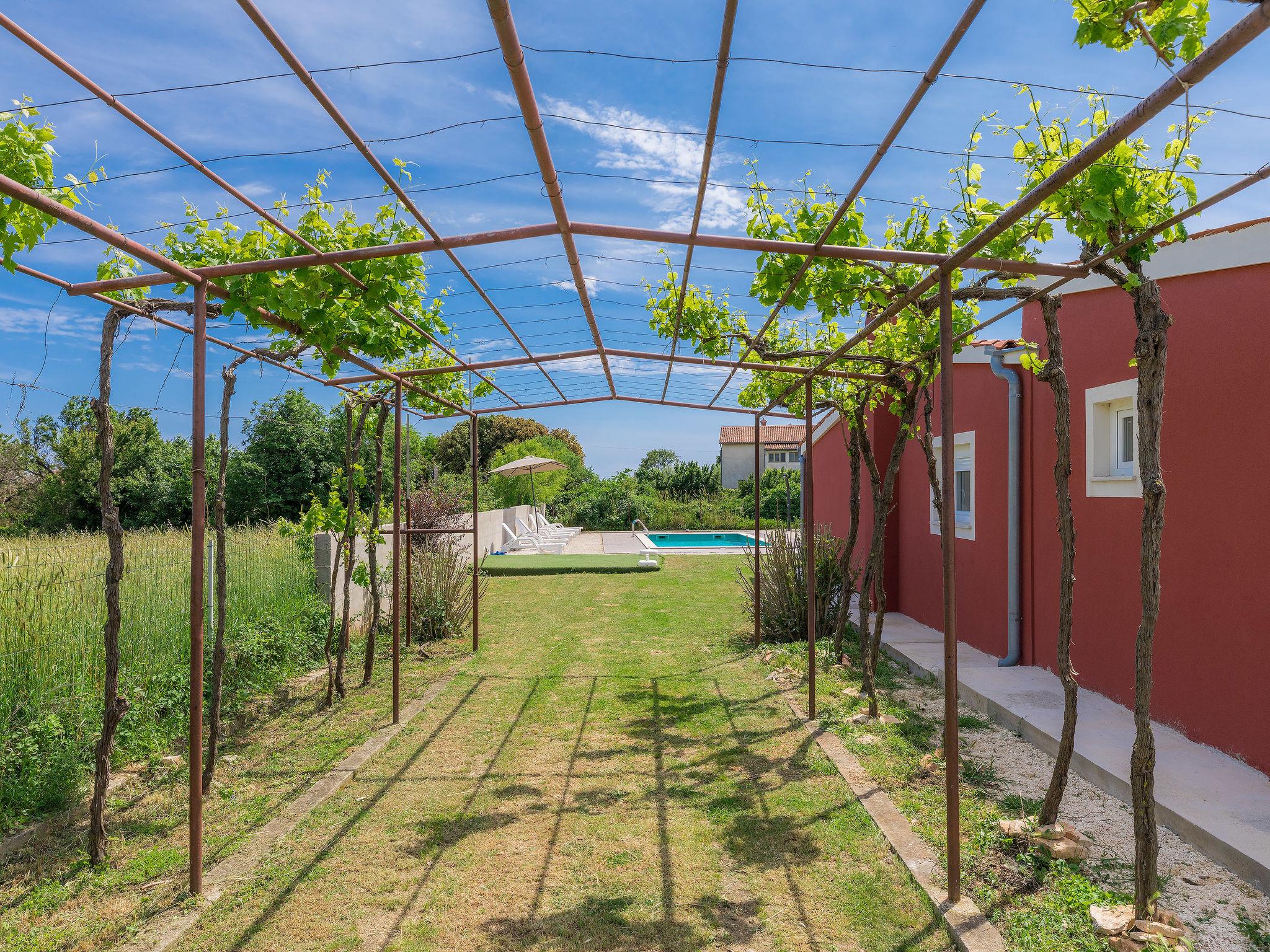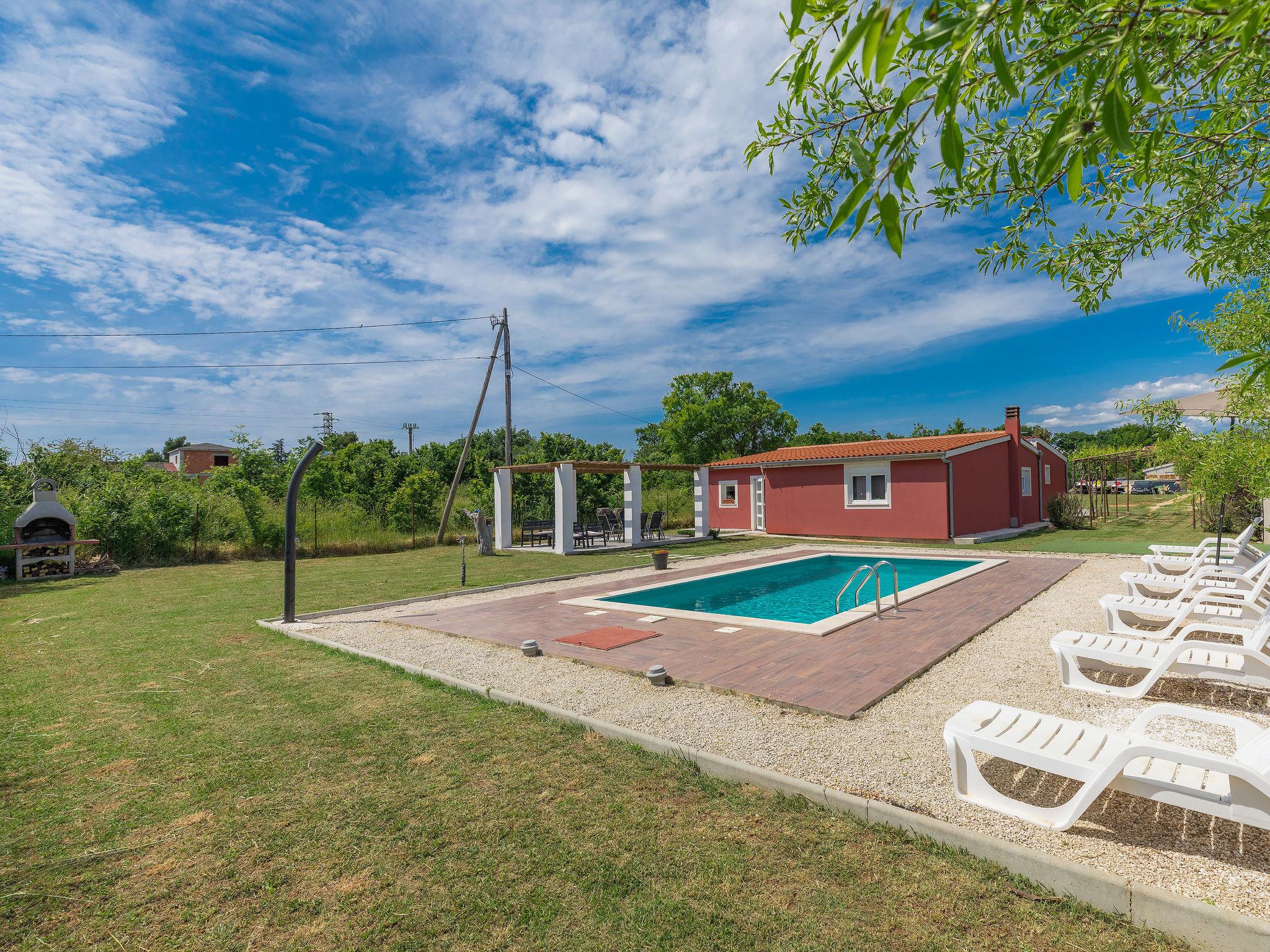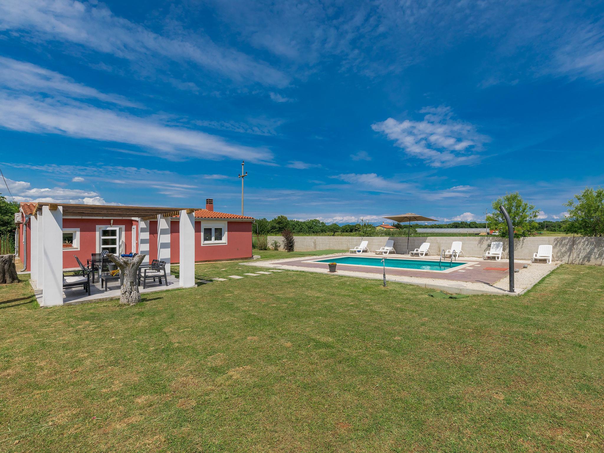 Šišan 4 km from Medulin: Single-family house "Alma". 900 m from the centre of Šišan, 8 km from the centre of Pula, in a quiet, sunny position, 2 km from the sea, 2 km from the beach. Private: property 1'500 m2 (fenced), garden with lawn, swimming pool angular (6 x 4 m, depth 150 cm, seasonal availability: 27.Apr. - 28.Sep.). Outdoor shower, terrace (20 m2), garden furniture, barbecue, children's playground (swing). In the house: internet access, washing machine. Motor access to the house (100 m via unmade road). Parking (for 3 cars) at the house on the premises. Shop 800 m, supermarket 6 km, restaurant, bus stop 650 m, pebble beach 2 km, rocky beach 2 km. Surf school 4 km, sailing school 4 km, tennis 6 km, riding stable 1 km, walking paths from the house 100 m, cycle lane 150 m. Available: jet ski scooter (on request, extra).