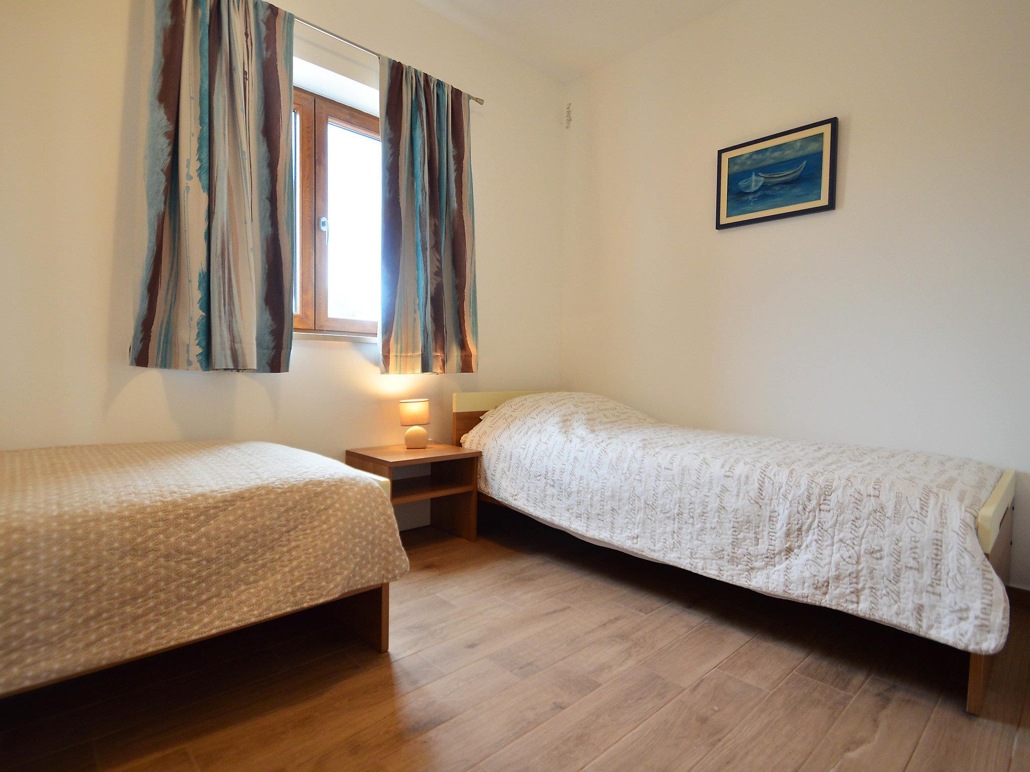 3-room apartment 50 m2, on the ground floor. Living/dining room with 1 double sofabed (140 cm, length 200 cm), satellite TV (flat screen), air conditioning. Exit to the terrace. 1 room with 1 french bed (160 cm, length 200 cm). Exit to the terrace. 1 room with 2 beds (90 cm, length 200 cm). Open kitchen (oven, dishwasher, 4 ceramic glass hob hotplates, electric coffee machine). Shower/WC. Forced-air heating. Terrace 10 m2, roofed. Terrace furniture. Partial view of the sea and the garden. Facilities: washing machine, iron, hair dryer. Internet (WiFi, free). Please note: non-smoking house.