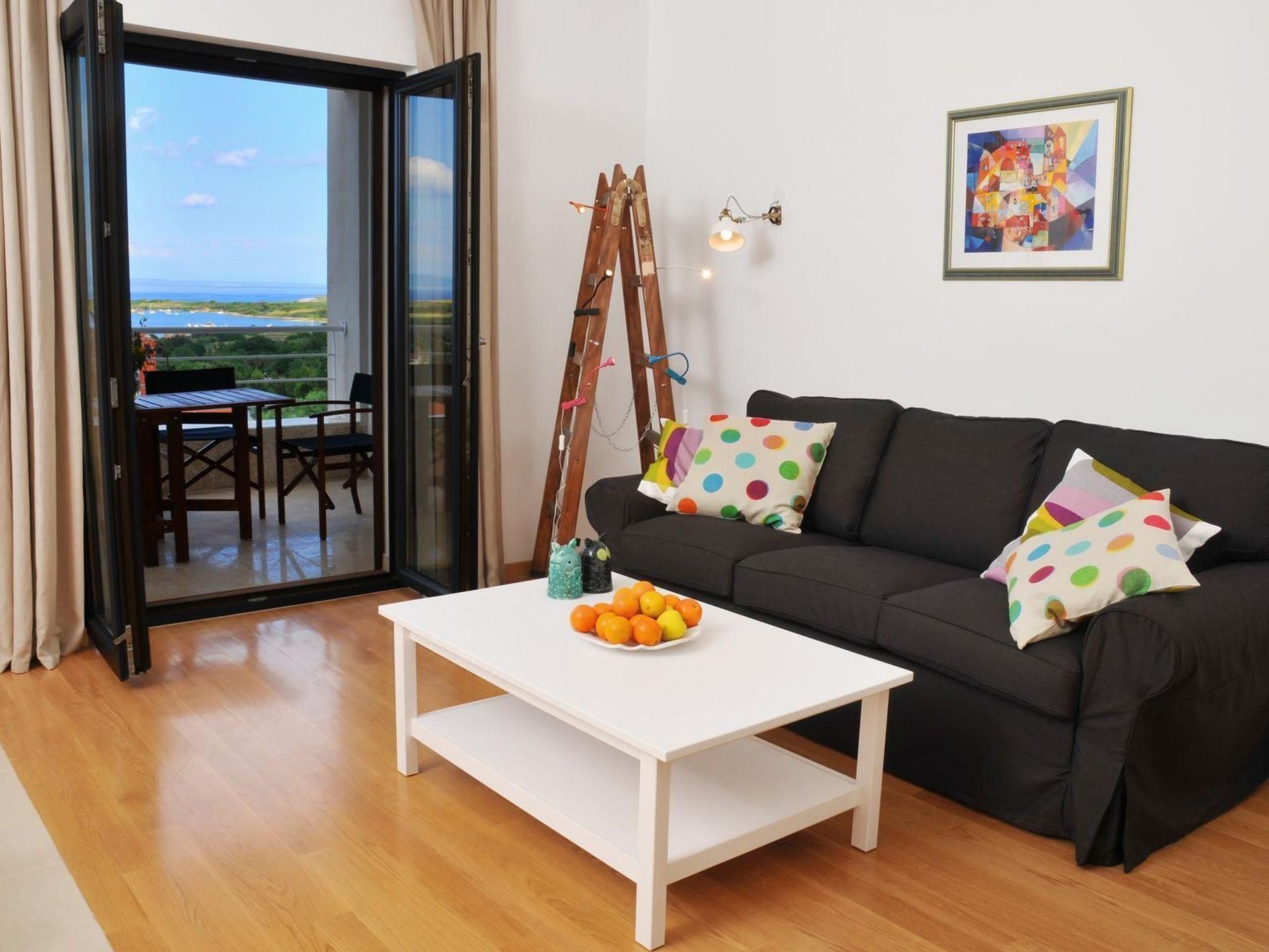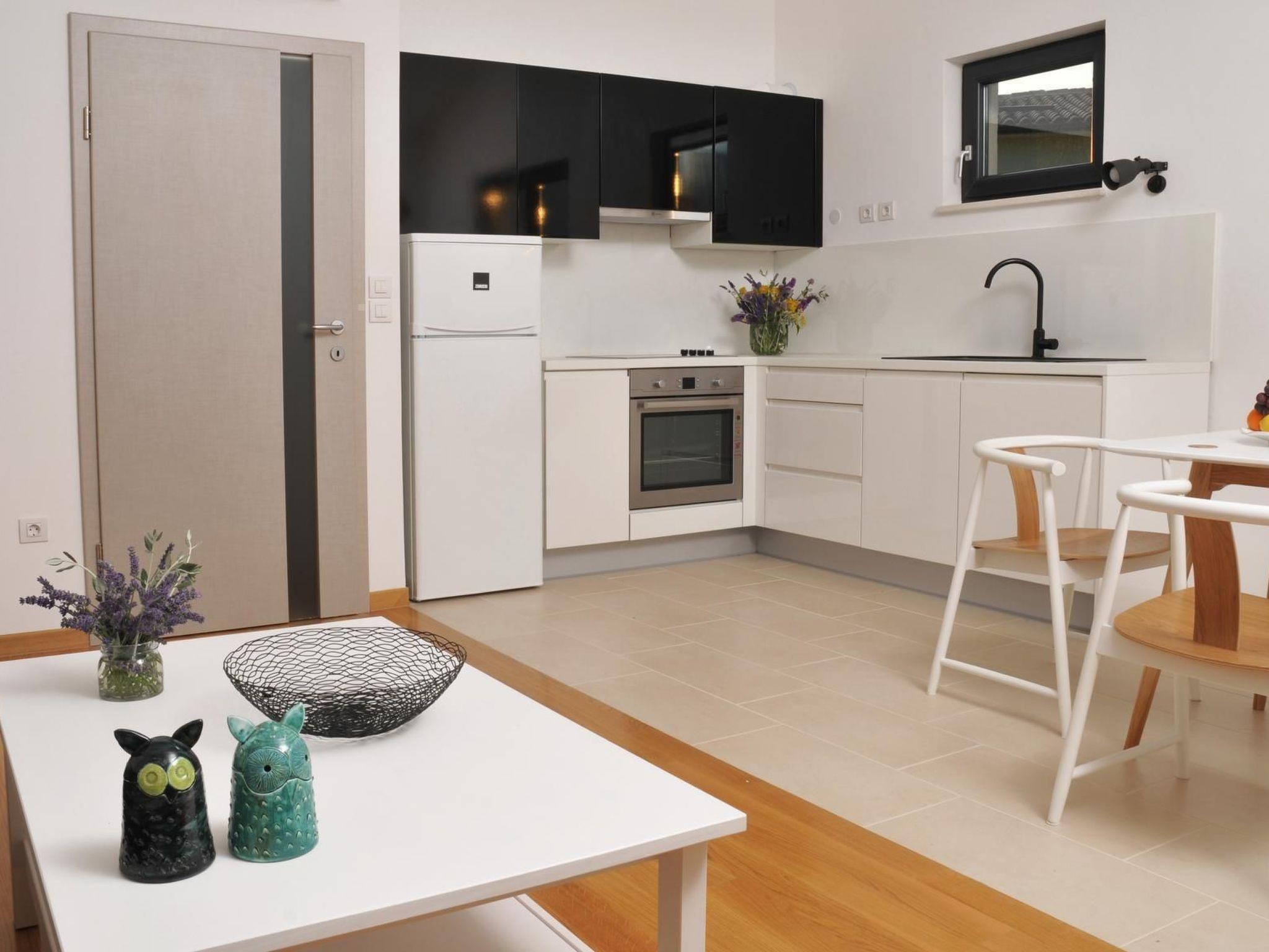 The 57m² apartment is on the second floor of the house and can accommodate five people comfortably. It has a bathroom with a shower, toilet and hairdryer, and two bedrooms with a double bed (160 x 200cm) in the first bedroom and a single bed (90 x 200cm) in the second. The spacious living room is divided into a modern kitchen, a dining area and a sitting area. The kitchen provides a stove, oven, coffee machine, fridge and dishwasher. The sofa bed (140 x 190cm) in front of the TV is suitable for two people. The living room and the double bedroom have air conditioning.