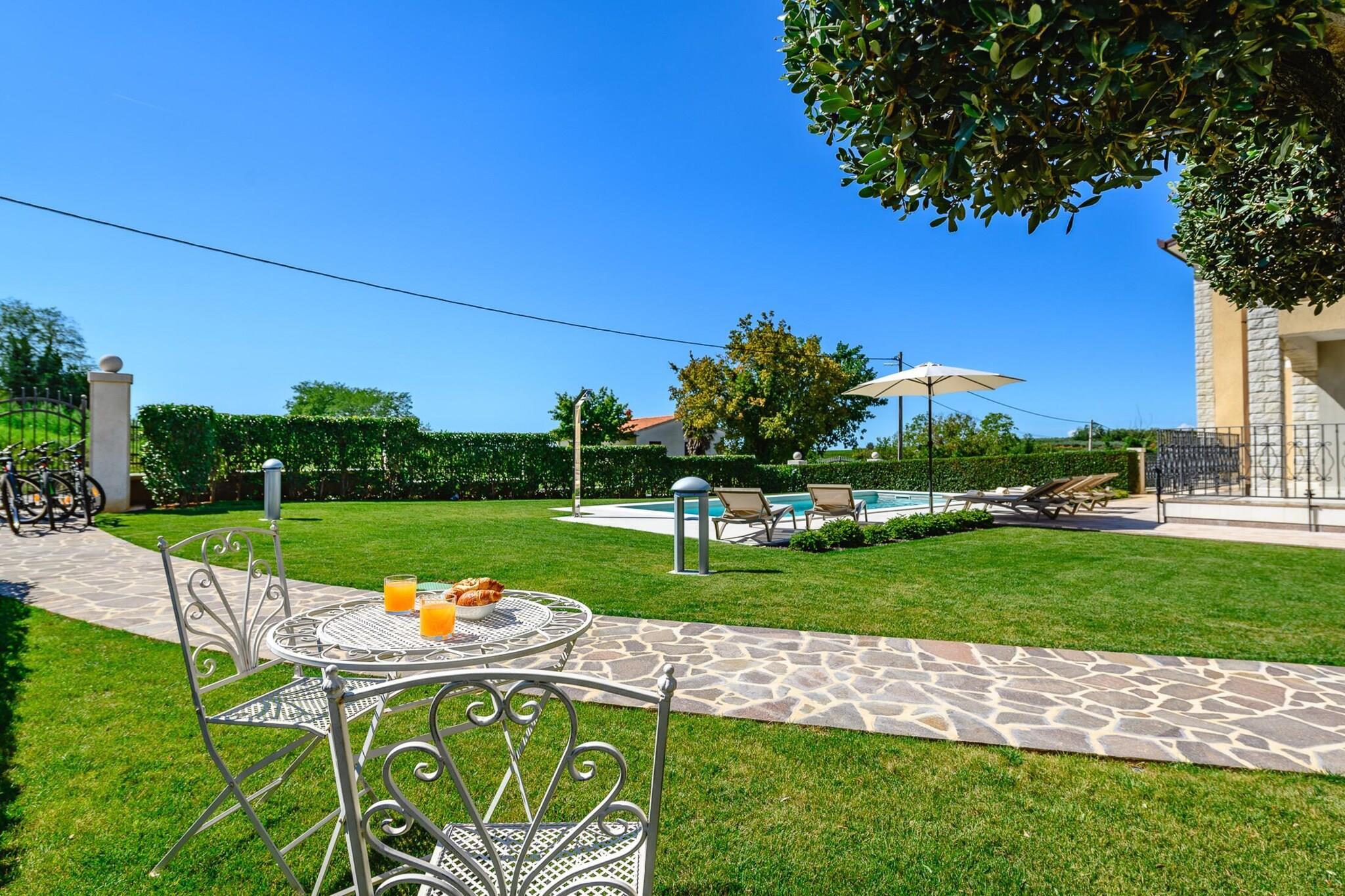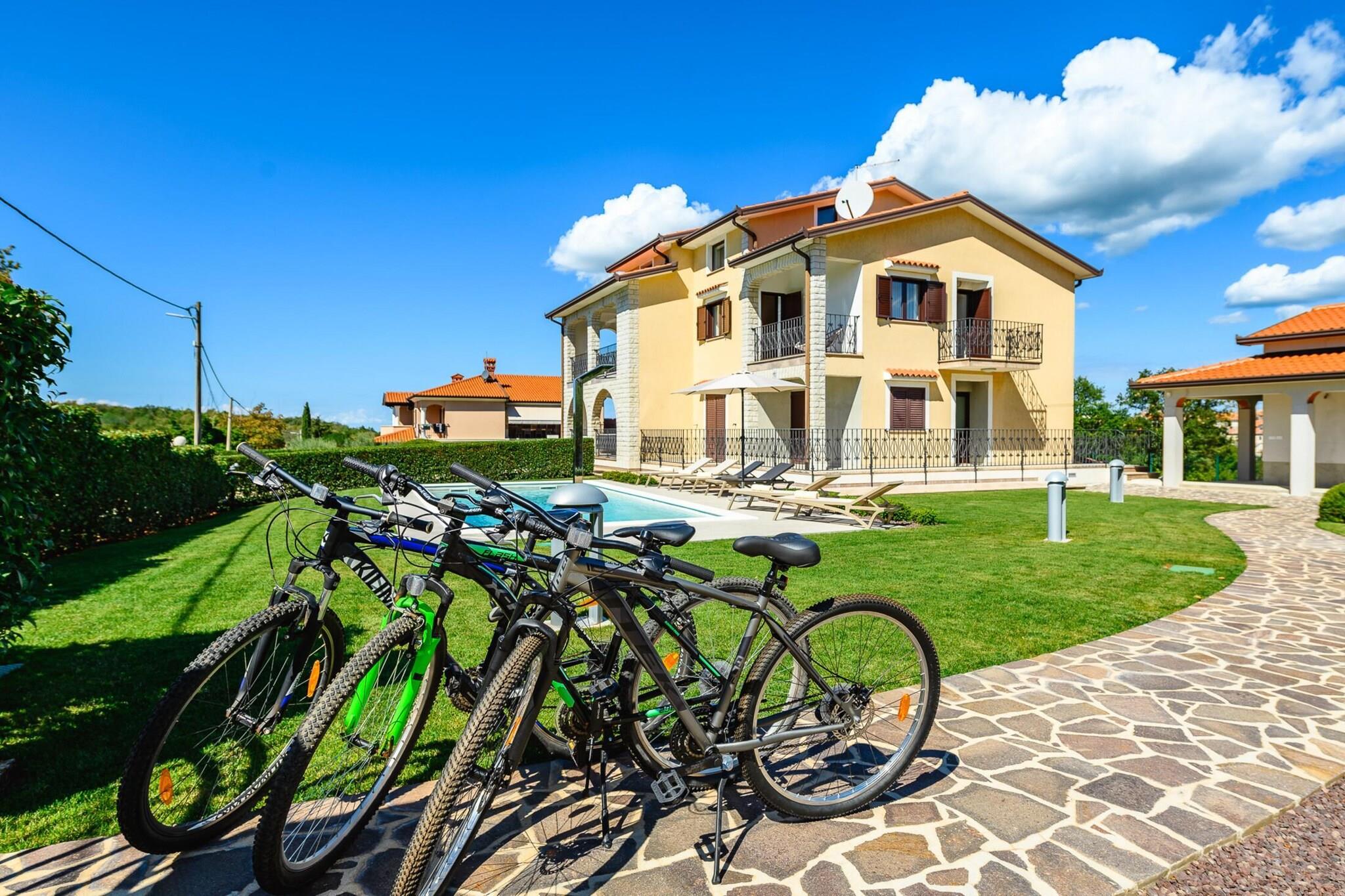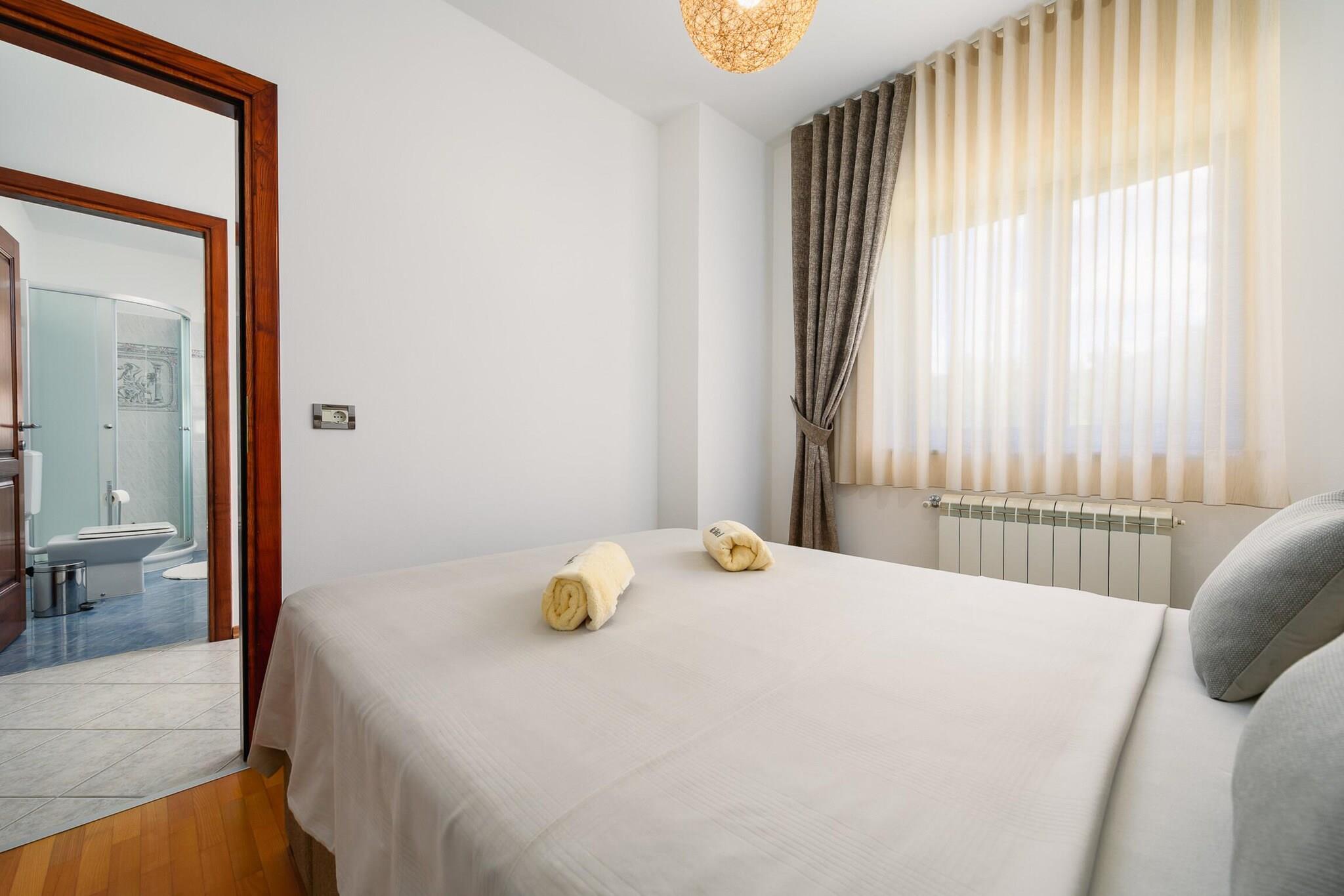 Lejligheden tilbyder sammen med sit rummelige og komfortable design et treværelses rum med plads til op til seks gæster, med en have med udendørsmøbler, en terrasse og et grillområde til udendørs spisning. Lejligheden tilbyder også en privat swimmingpool, ideel til at køle af og slappe af. Yderligere faciliteter omfatter aircondition, centralvarme, Wi-Fi, et tv med satellitkanaler på engelsk og tysk og udendørs parkering i samme bygning. Ejendommen er beliggende i Mekiši kod Vižinade, en fredfyldt, familievenlig zone omgivet af smukke landskaber. Landsbyen Vižinada ligger kun 2 km derfra, hvor gæsterne kan finde et supermarked og lokale butikker. Den nærliggende by Porec (18 km) giver adgang til både sandstrande (Marea-stranden) og klippestrande (Materada-stranden), mens det berømte vandland "Istralandia" kun ligger 11 km væk, hvilket gør det til en perfekt destination for familier. For naturelskere byder Mirna-floden (8 km) og de termiske kilder (20 km) på udendørsoplevelser. Ejendommen er let tilgængelig, hvor Pula Lufthavn (60 km) og togstationen i Trst (60 km) er praktiske transportknudepunkter. Det åbne køkken er udstyret med induktionsapparater, herunder køleskab, mikroovn, ovn, fryser og opvaskemaskine. Køkkenet tilbyder også vigtigt køkkenudstyr, tallerkener, bestik og redskaber, så gæsterne nemt kan tilberede måltider. En kaffemaskine, brødrister og kedel er også tilgængelige for ekstra bekvemmelighed. Med sin rolige beliggenhed, moderne bekvemmeligheder og tæt på attraktioner er denne lejlighed et ideelt valg for familier eller grupper, der søger en behagelig og fredelig ferie i det Istriske landskab.