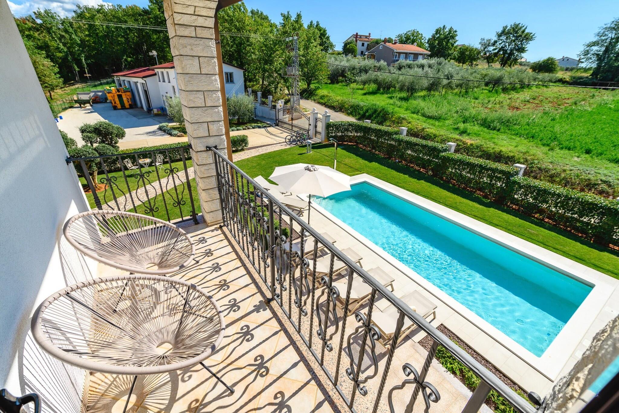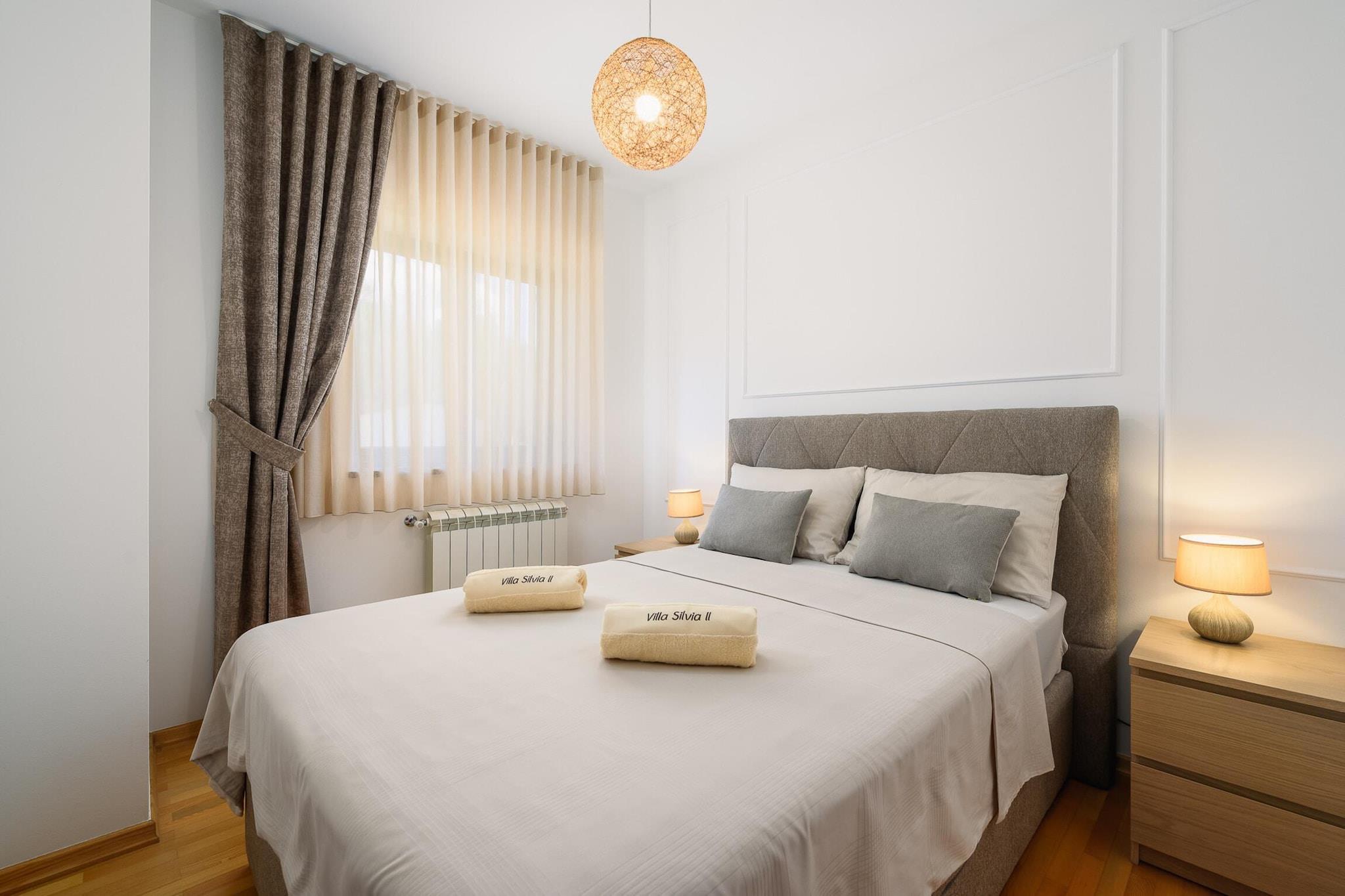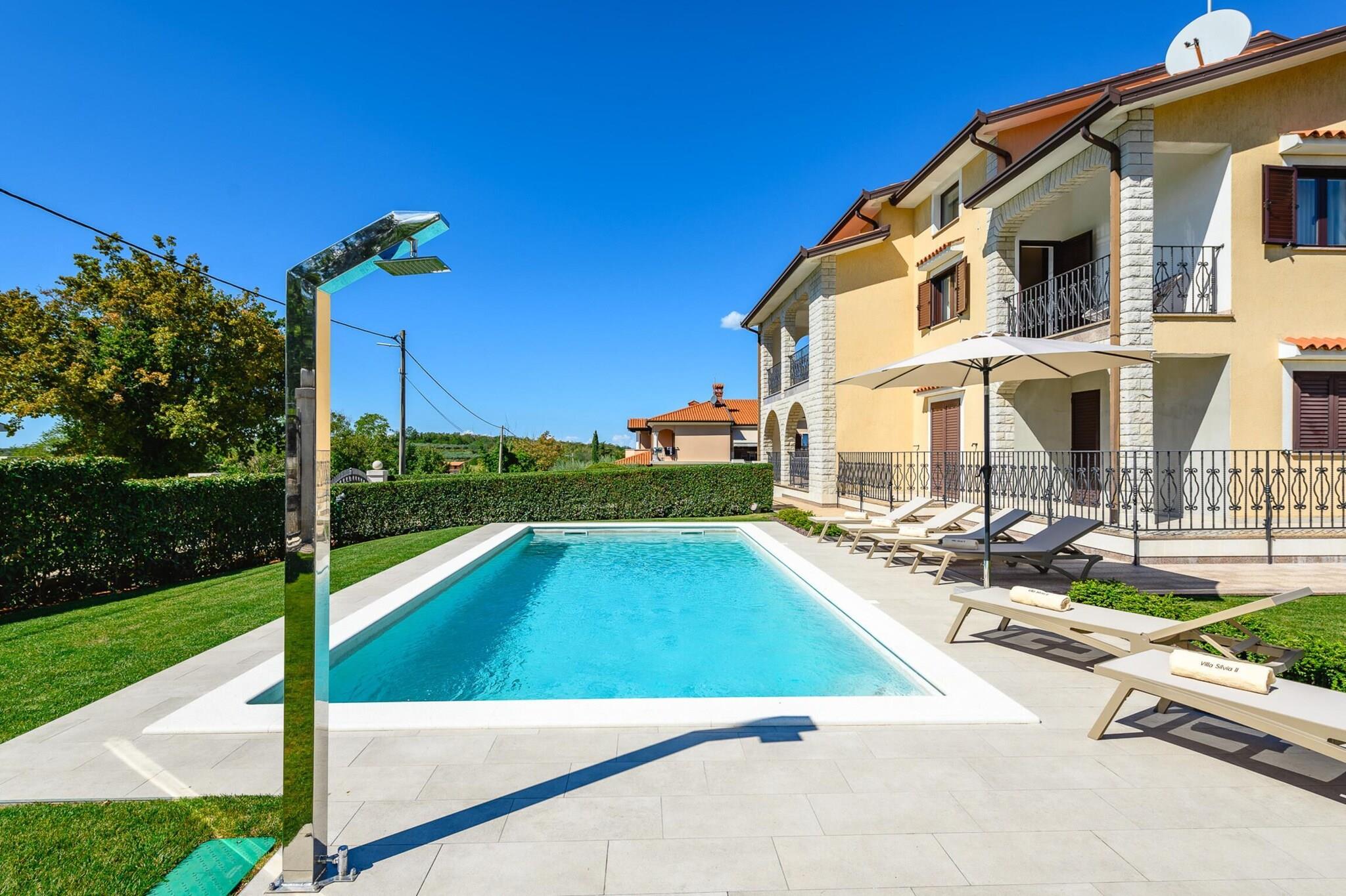 Lejligheden tilbyder sammen med sit rummelige og komfortable design et treværelses rum med plads til op til seks gæster, med en have med udendørsmøbler, en terrasse og et grillområde til udendørs spisning. Lejligheden tilbyder også en privat swimmingpool, ideel til at køle af og slappe af. Yderligere faciliteter omfatter aircondition, centralvarme, Wi-Fi, et tv med satellitkanaler på engelsk og tysk og udendørs parkering i samme bygning. Ejendommen er beliggende i Mekiši kod Vižinade, en fredfyldt, familievenlig zone omgivet af smukke landskaber. Landsbyen Vižinada ligger kun 2 km derfra, hvor gæsterne kan finde et supermarked og lokale butikker. Den nærliggende by Porec (18 km) giver adgang til både sandstrande (Marea-stranden) og klippestrande (Materada-stranden), mens det berømte vandland "Istralandia" kun ligger 11 km væk, hvilket gør det til en perfekt destination for familier. For naturelskere byder Mirna-floden (8 km) og de termiske kilder (20 km) på udendørsoplevelser. Ejendommen er let tilgængelig, hvor Pula Lufthavn (60 km) og togstationen i Trst (60 km) er praktiske transportknudepunkter. Det åbne køkken er udstyret med induktionsapparater, herunder køleskab, mikroovn, ovn, fryser og opvaskemaskine. Køkkenet tilbyder også vigtigt køkkenudstyr, tallerkener, bestik og redskaber, så gæsterne nemt kan tilberede måltider. En kaffemaskine, brødrister og kedel er også tilgængelige for ekstra bekvemmelighed. Med sin rolige beliggenhed, moderne bekvemmeligheder og tæt på attraktioner er denne lejlighed et ideelt valg for familier eller grupper, der søger en behagelig og fredelig ferie i det Istriske landskab.