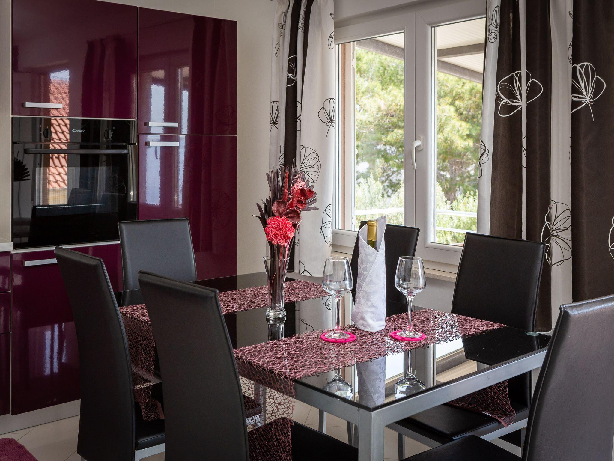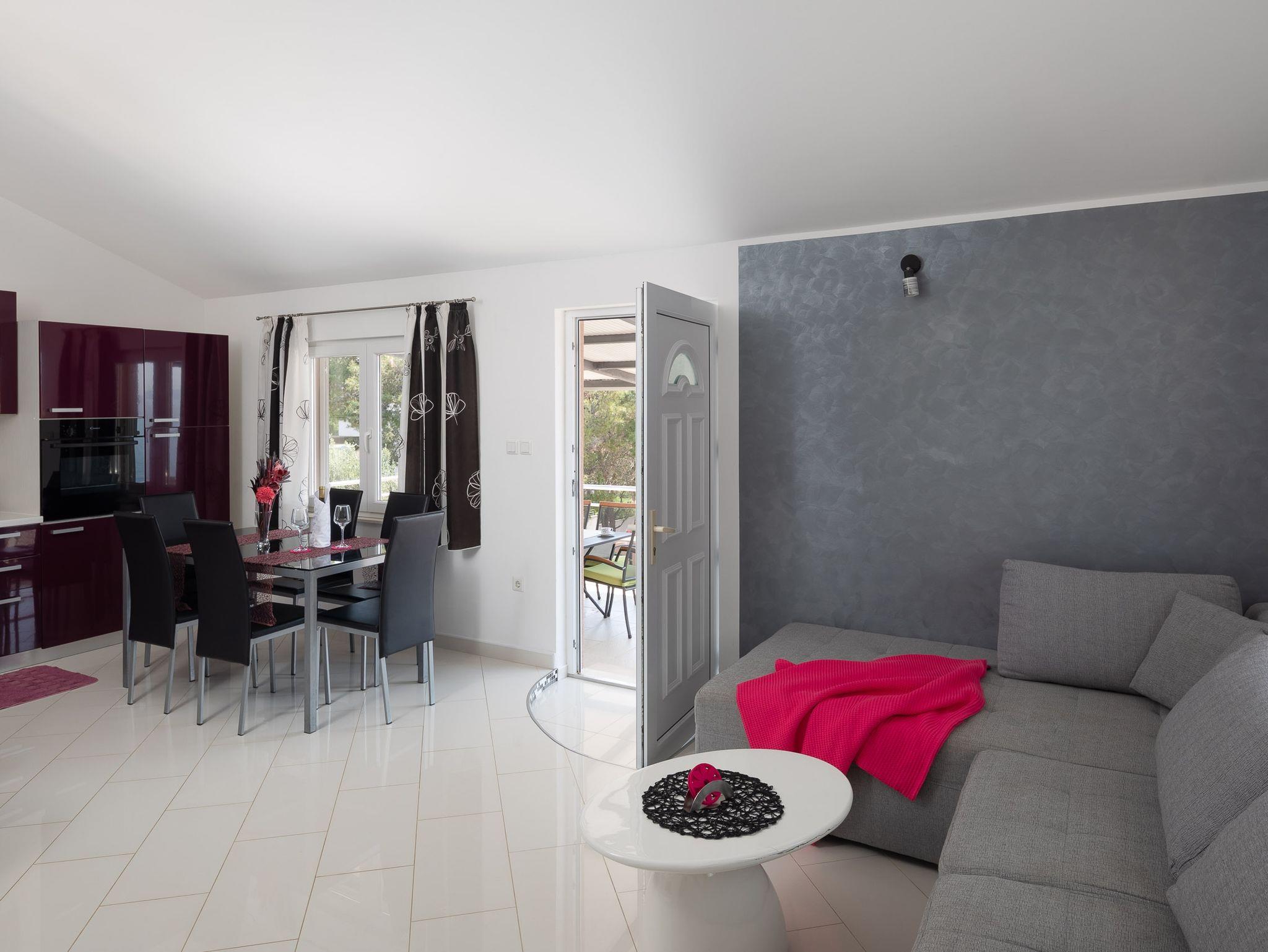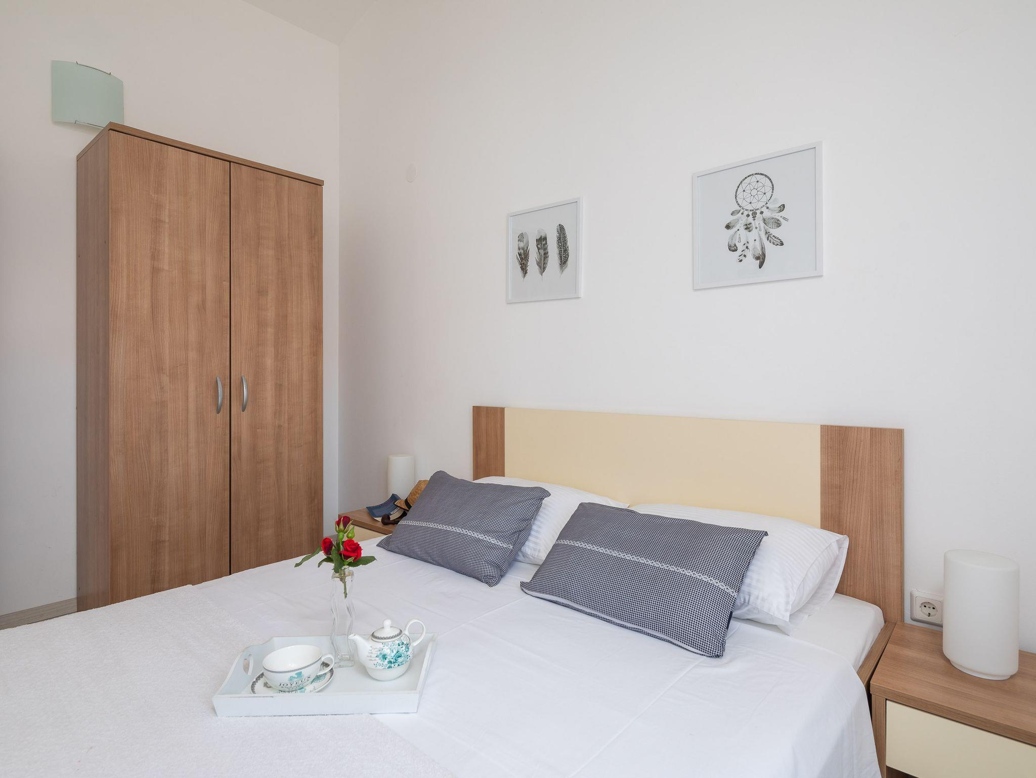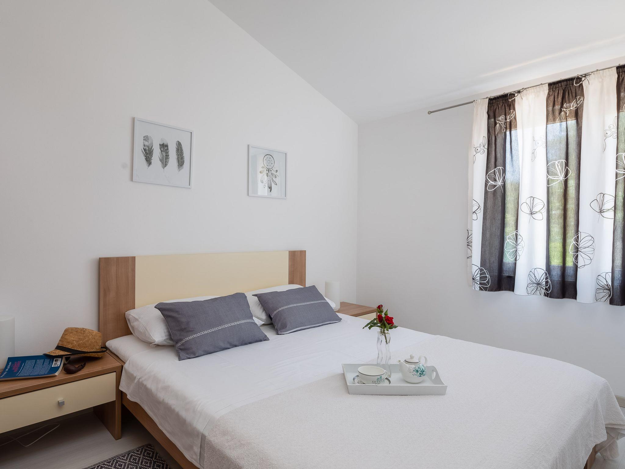 Ferienwohnung bietet Platz für 6 Gäste. Die Betten sind in Schlafzimmern, die es 2 gibt, und in Wohnzimmer, innerhalb einer Gesamtfläche von 51m2, angeordnet. Die Gäste haben eine eigene Terrasse zur Verfügung, auf der sie in warmen Sommernächten genießen können. Das Apartment bietet Meerblick. Es ist erlaubt, Speisen auf dem Gemeinschafts-Grill vorzubereiten. In der Unterkunftseinheit besteht die Möglichkeit des Mitbringens von Haustieren, und die Dienstleistung ist im Preis der Unterkunft enthalten. IM PREIS INBEGRIFFEN: Kurtaxe, Endreinigung, Klimatisierung, Parkplatz, Internet, Wäschewaschen, Bootsanlegeplatz, Haustiere, Kinderbett, Liegestühle. Die Verfügbarkeit zusätzlicher Dienstleistungen in Ihrem reservierten Termin und die Preise derselben (falls nicht aufgeführt) müssen im Voraus überprüft werden. Zusätzliche Dienstleistungen die in der Zahlungsaufforderung nicht aufgeführt sind werden direkt beim Vermieter bezahlt, angenommen der Gast nutzt auch diese. Ermäßigung auf den Grundpreis: Gratistag 21=19 (bei einem Aufenthalt von 21 Tagen oder mehr erhalten Sie 2 Gratistage für den Aufenthalt bis 31.12.26).