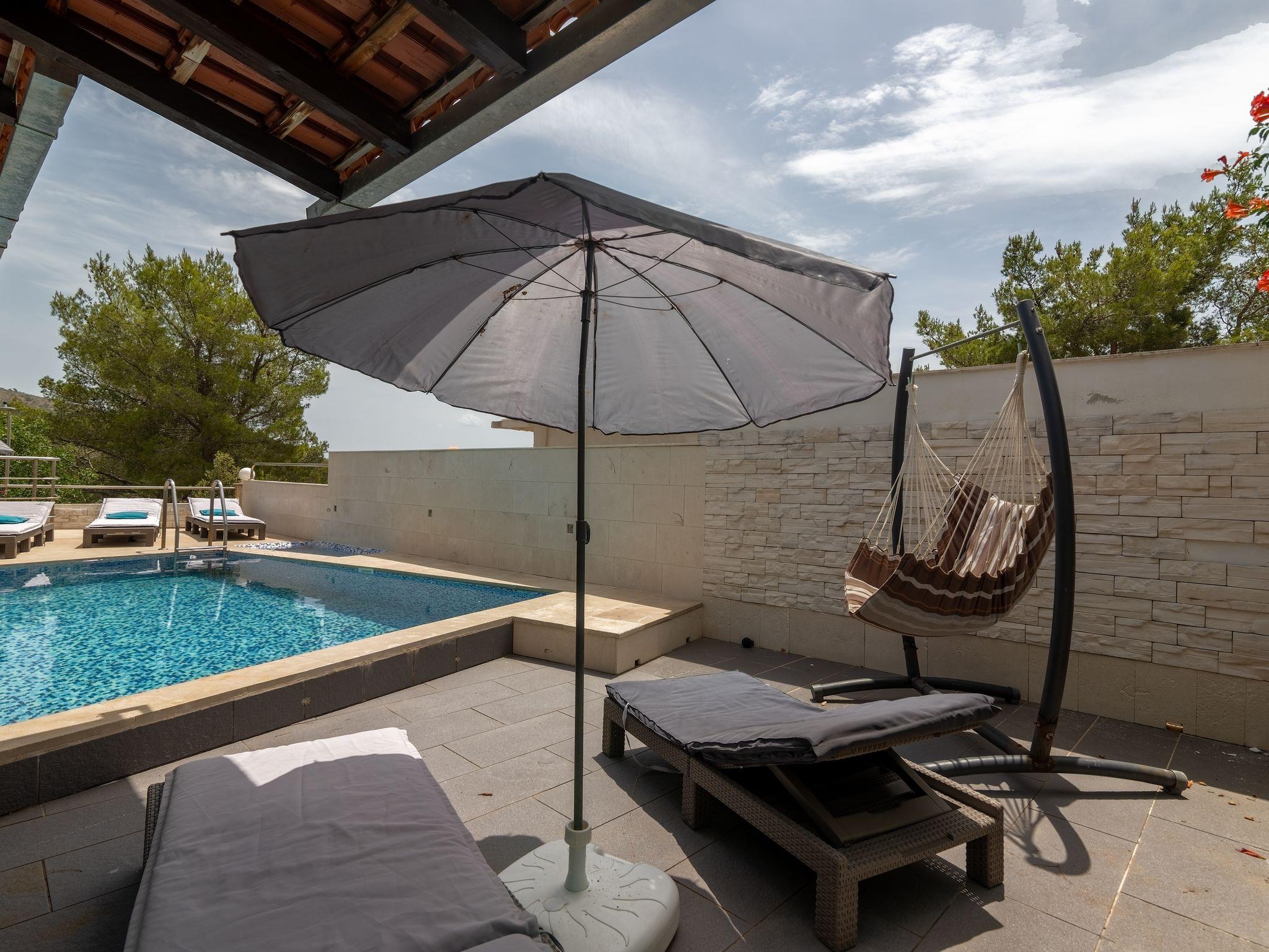 Haus bietet Platz für 8 Gäste. Die Betten sind in Schlafzimmern, die es 4 gibt, innerhalb einer Gesamtfläche von 94m2, angeordnet. Die Gäste haben eine eigene Terrasse zur Verfügung, auf der sie in warmen Sommernächten genießen können. Für vollen Genuss und Entspannung gibt es einen privaten Grill für Gäste dieser Unterkunft. Während ihres Aufenthalts können sich Gäste im privaten Schwimmbad entspannen. In der Unterkunftseinheit besteht die Möglichkeit des Mitbringens von Haustieren gegen Aufpreis. Räume der gebuchten Unterkunftseinheit werden nicht in eine Ganze verbunden. IM PREIS INBEGRIFFEN: Kurtaxe, Endreinigung, Klimatisierung, Pool, Parkplatz, Internet, Fahrrad, Kinderbett, Bügeleisen, Bügelbrett, Föhn, Sonnenschirm, Liegestühle. VERBINDLICHE ZUSÄTZLICHE KOSTEN: Aufzahlung für Kurzaufenthalte (prozentualer Zuschlag pro Nächtigungsanzahl: 30% - 1, 20% - 2, 10% - 3). UNVERBINDLICHE ZUSÄTZLICHE KOSTEN: Haustiere (8,00 € pro Nacht). Die Verfügbarkeit zusätzlicher Dienstleistungen in Ihrem reservierten Termin und die Preise derselben (falls nicht aufgeführt) müssen im Voraus überprüft werden. Zusätzliche Dienstleistungen die in der Zahlungsaufforderung nicht aufgeführt sind werden direkt beim Vermieter bezahlt, angenommen der Gast nutzt auch diese. Ermäßigung auf den Grundpreis: Gratistag 21=19 (bei einem Aufenthalt von 21 Tagen oder mehr erhalten Sie 2 Gratistage für den Aufenthalt bis 31.12.26).