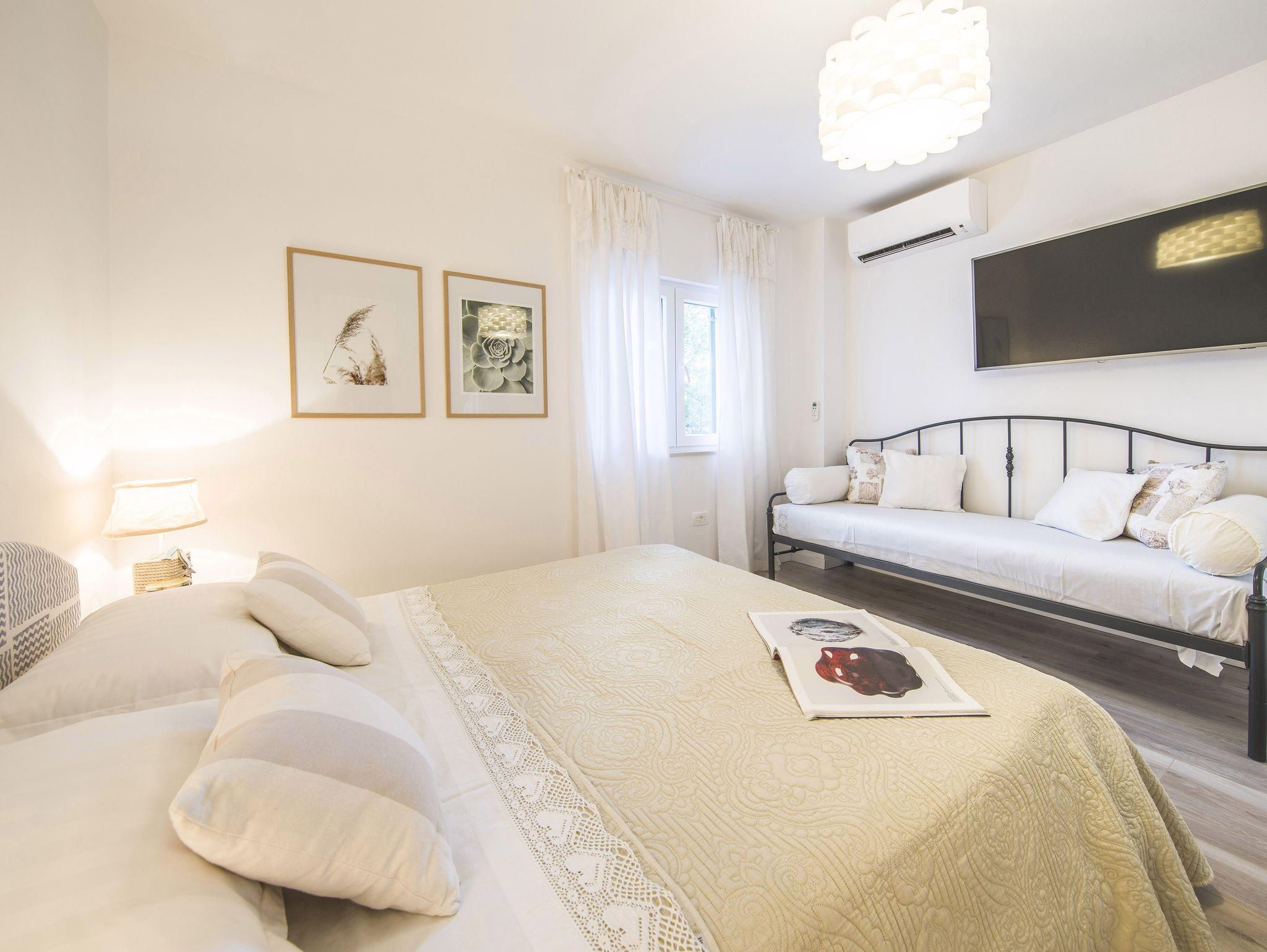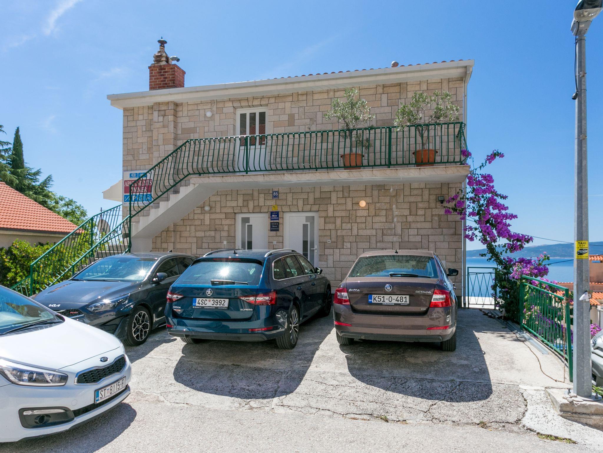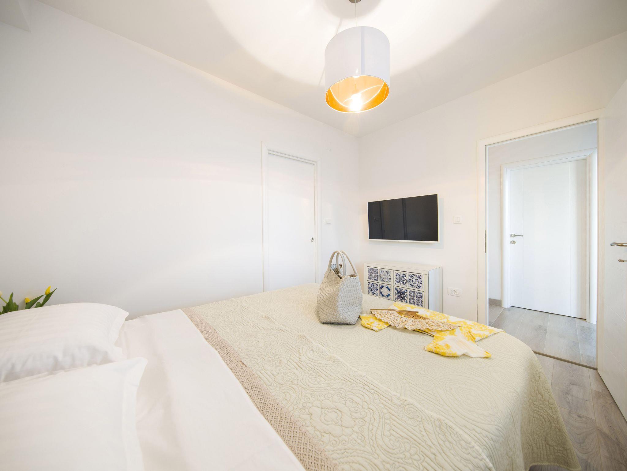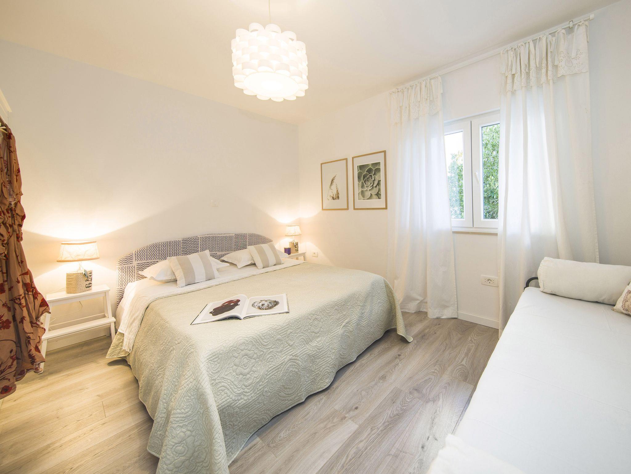 Ferienwohnung bietet Platz für 9 Gäste. Die Betten sind in Schlafzimmern, die es 4 gibt, innerhalb einer Gesamtfläche von 93m2, angeordnet. Die Gäste haben eine eigene Terrasse zur Verfügung, auf der sie in warmen Sommernächten genießen können. Das Apartment bietet Meerblick. Es ist erlaubt, Speisen auf dem Gemeinschafts-Grill vorzubereiten. IM PREIS INBEGRIFFEN: Kurtaxe, Endreinigung, Klimatisierung, Parkplatz, Garage, Internet, Kinderbett, Bügeleisen, Bügelbrett, Föhn. VERBINDLICHE ZUSÄTZLICHE KOSTEN: Aufzahlung für Kurzaufenthalte (prozentualer Zuschlag pro Nächtigungsanzahl: 30% - 1, 20% - 2, 10% - 3). Die Verfügbarkeit zusätzlicher Dienstleistungen in Ihrem reservierten Termin und die Preise derselben (falls nicht aufgeführt) müssen im Voraus überprüft werden. Zusätzliche Dienstleistungen die in der Zahlungsaufforderung nicht aufgeführt sind werden direkt beim Vermieter bezahlt, angenommen der Gast nutzt auch diese.