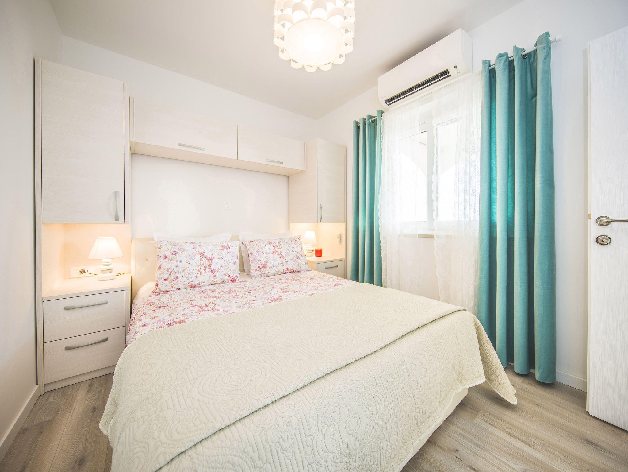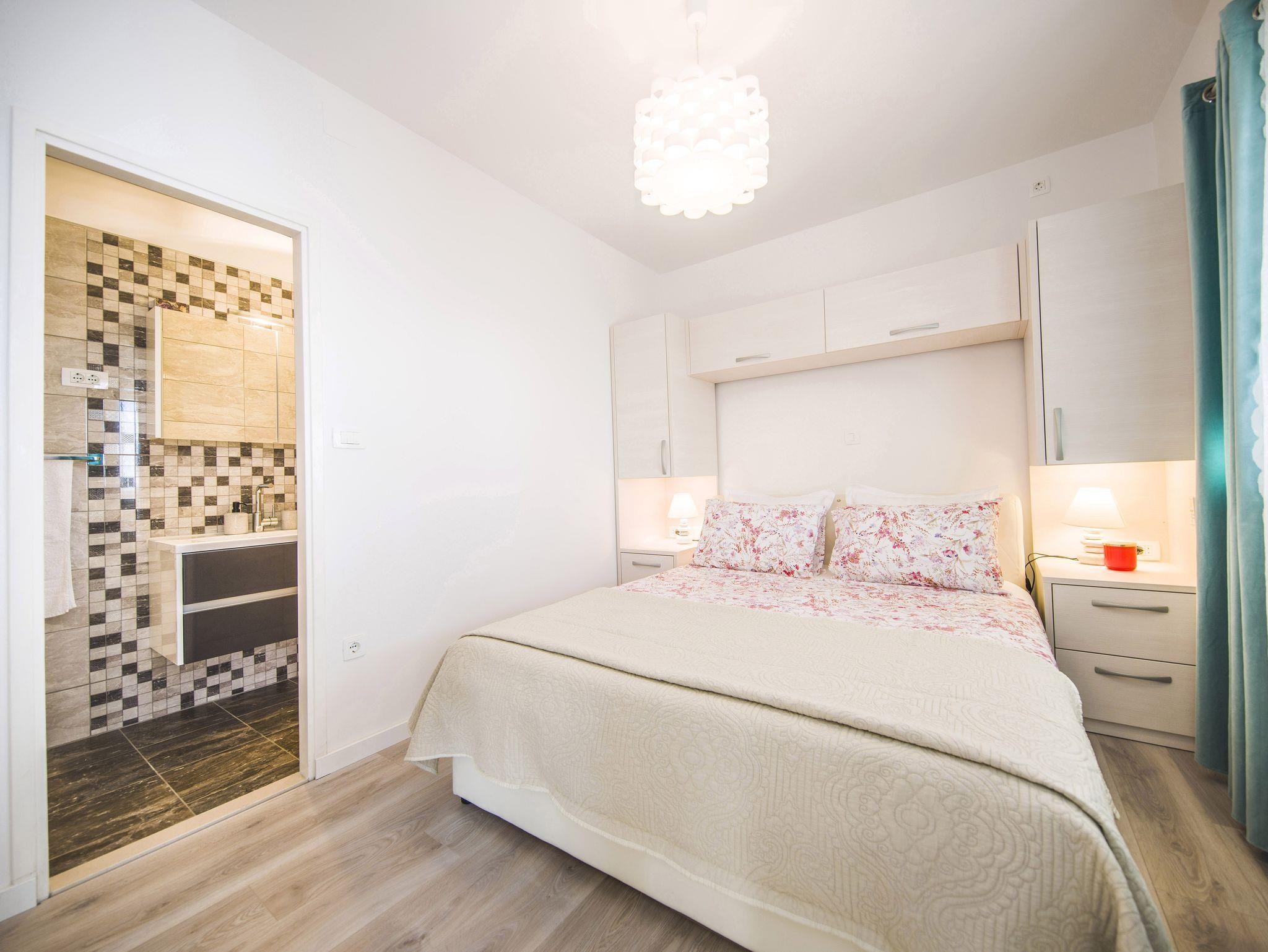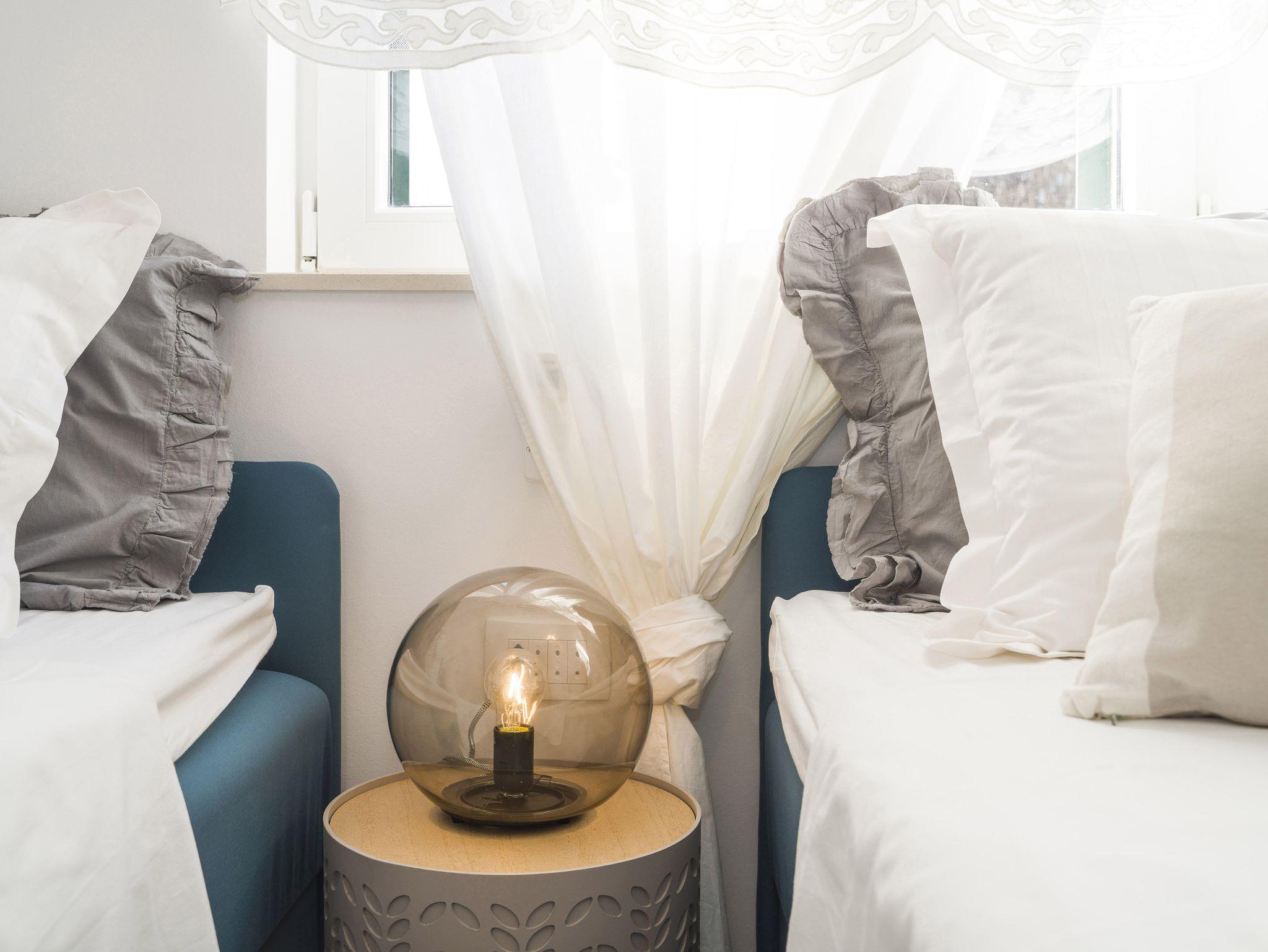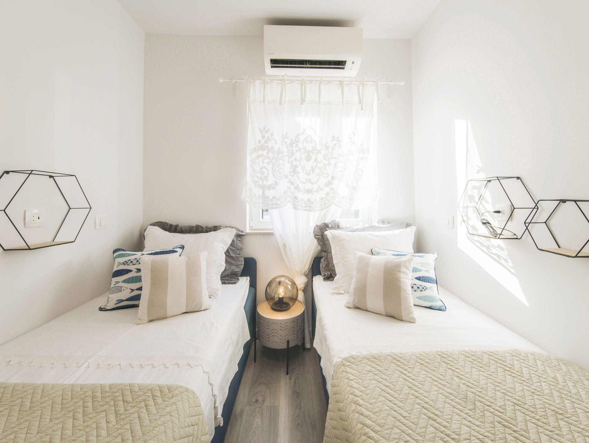 Ferienwohnung bietet Platz für 9 Gäste. Die Betten sind in Schlafzimmern, die es 4 gibt, innerhalb einer Gesamtfläche von 93m2, angeordnet. Die Gäste haben eine eigene Terrasse zur Verfügung, auf der sie in warmen Sommernächten genießen können. Das Apartment bietet Meerblick. Es ist erlaubt, Speisen auf dem Gemeinschafts-Grill vorzubereiten. IM PREIS INBEGRIFFEN: Kurtaxe, Endreinigung, Klimatisierung, Parkplatz, Garage, Internet, Kinderbett, Bügeleisen, Bügelbrett, Föhn. VERBINDLICHE ZUSÄTZLICHE KOSTEN: Aufzahlung für Kurzaufenthalte (prozentualer Zuschlag pro Nächtigungsanzahl: 30% - 1, 20% - 2, 10% - 3). Die Verfügbarkeit zusätzlicher Dienstleistungen in Ihrem reservierten Termin und die Preise derselben (falls nicht aufgeführt) müssen im Voraus überprüft werden. Zusätzliche Dienstleistungen die in der Zahlungsaufforderung nicht aufgeführt sind werden direkt beim Vermieter bezahlt, angenommen der Gast nutzt auch diese.