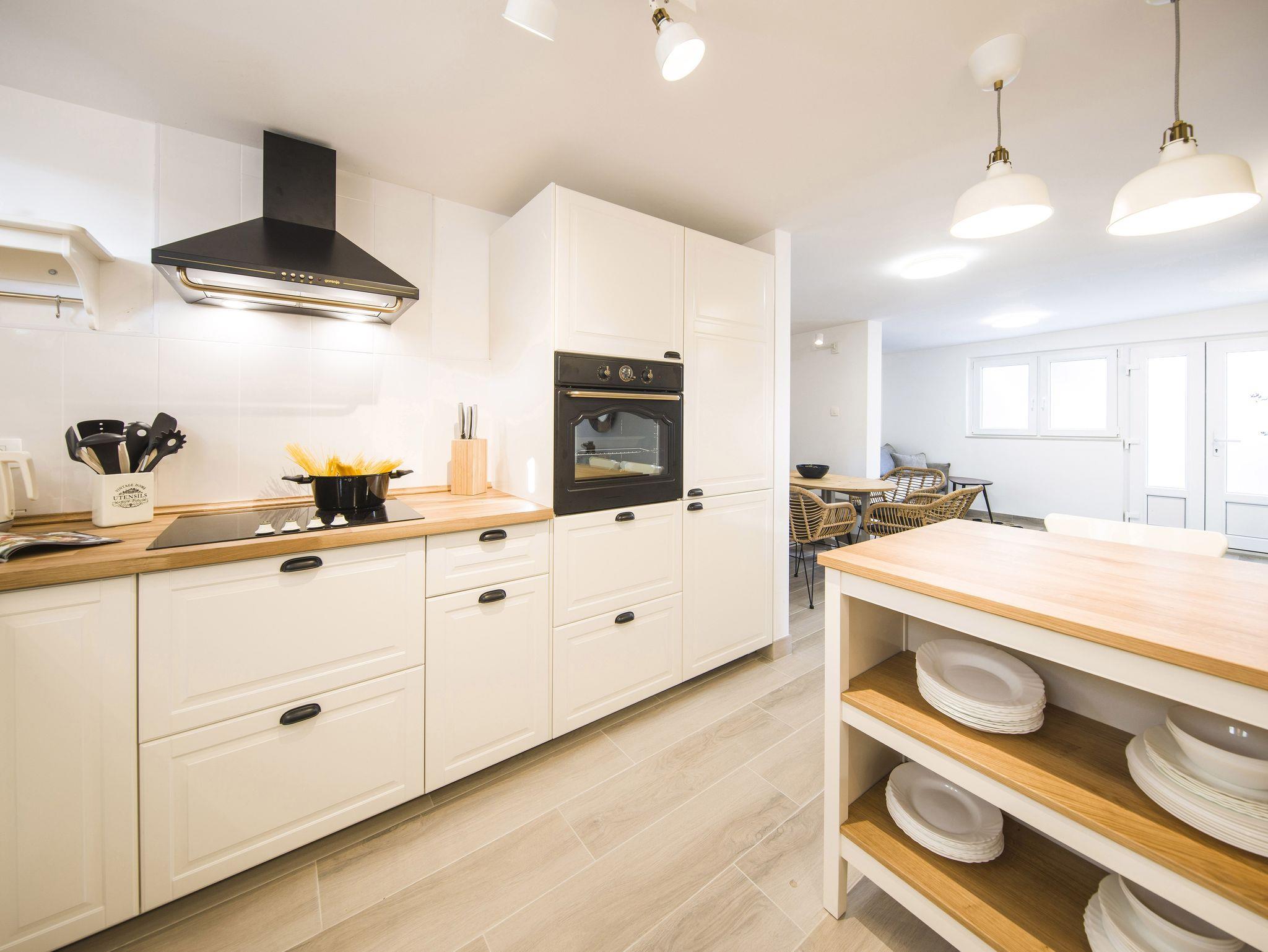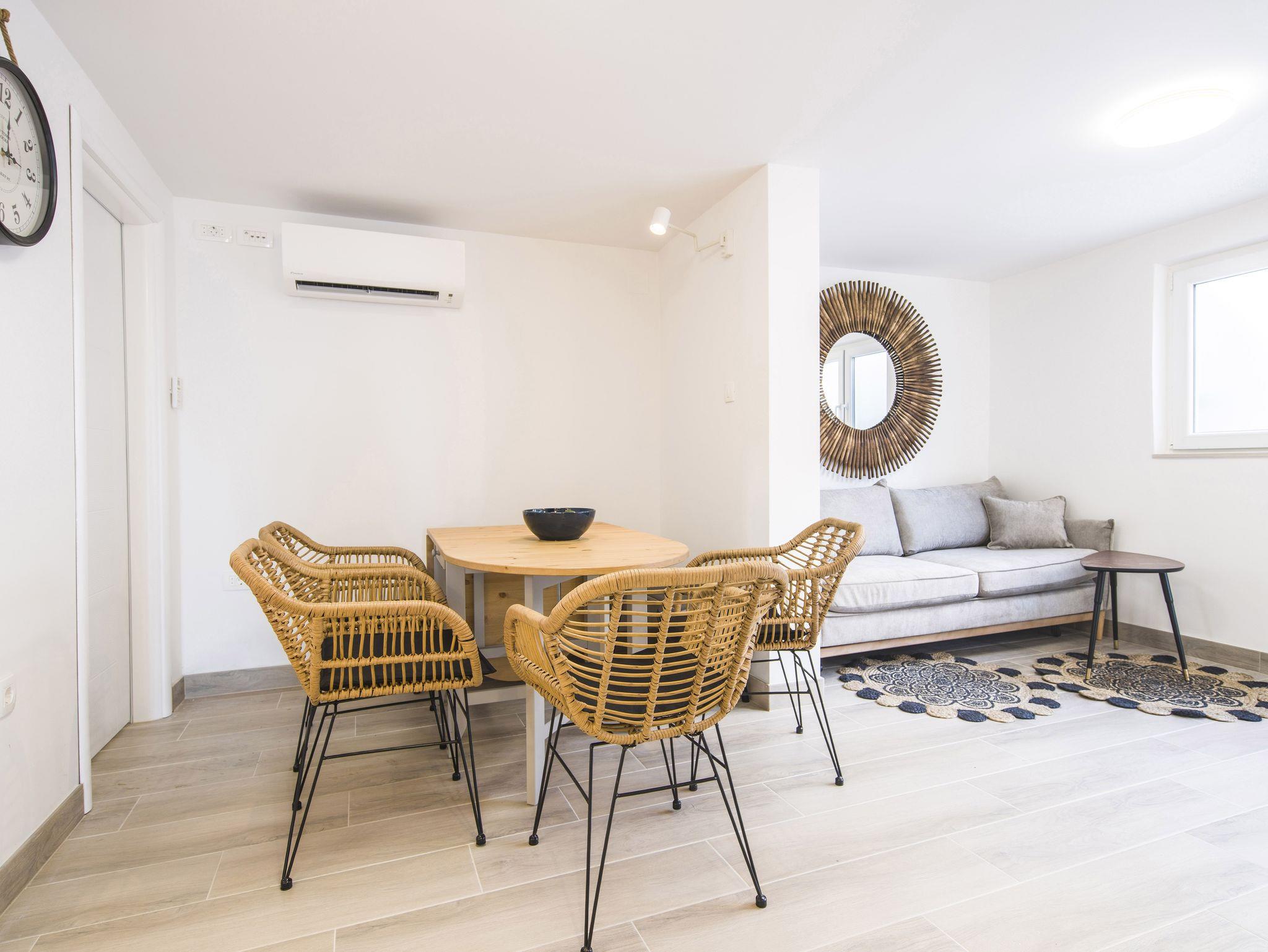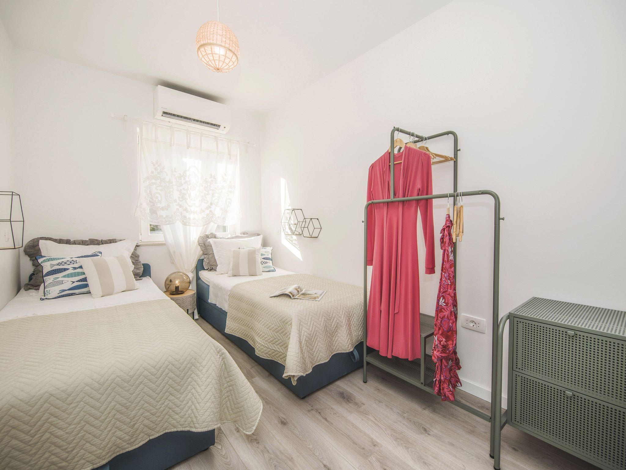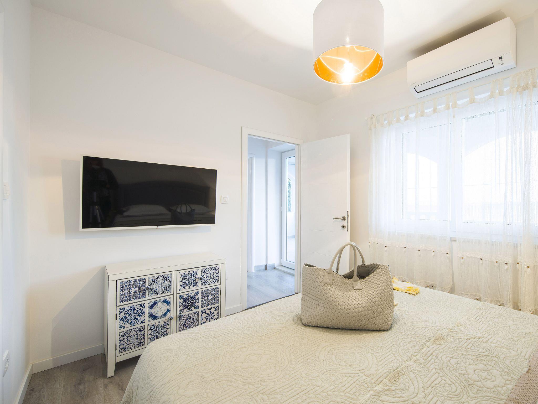 Ferienwohnung bietet Platz für 9 Gäste. Die Betten sind in Schlafzimmern, die es 4 gibt, innerhalb einer Gesamtfläche von 93m2, angeordnet. Die Gäste haben eine eigene Terrasse zur Verfügung, auf der sie in warmen Sommernächten genießen können. Das Apartment bietet Meerblick. Es ist erlaubt, Speisen auf dem Gemeinschafts-Grill vorzubereiten. IM PREIS INBEGRIFFEN: Kurtaxe, Endreinigung, Klimatisierung, Parkplatz, Garage, Internet, Kinderbett, Bügeleisen, Bügelbrett, Föhn. VERBINDLICHE ZUSÄTZLICHE KOSTEN: Aufzahlung für Kurzaufenthalte (prozentualer Zuschlag pro Nächtigungsanzahl: 30% - 1, 20% - 2, 10% - 3). Die Verfügbarkeit zusätzlicher Dienstleistungen in Ihrem reservierten Termin und die Preise derselben (falls nicht aufgeführt) müssen im Voraus überprüft werden. Zusätzliche Dienstleistungen die in der Zahlungsaufforderung nicht aufgeführt sind werden direkt beim Vermieter bezahlt, angenommen der Gast nutzt auch diese.