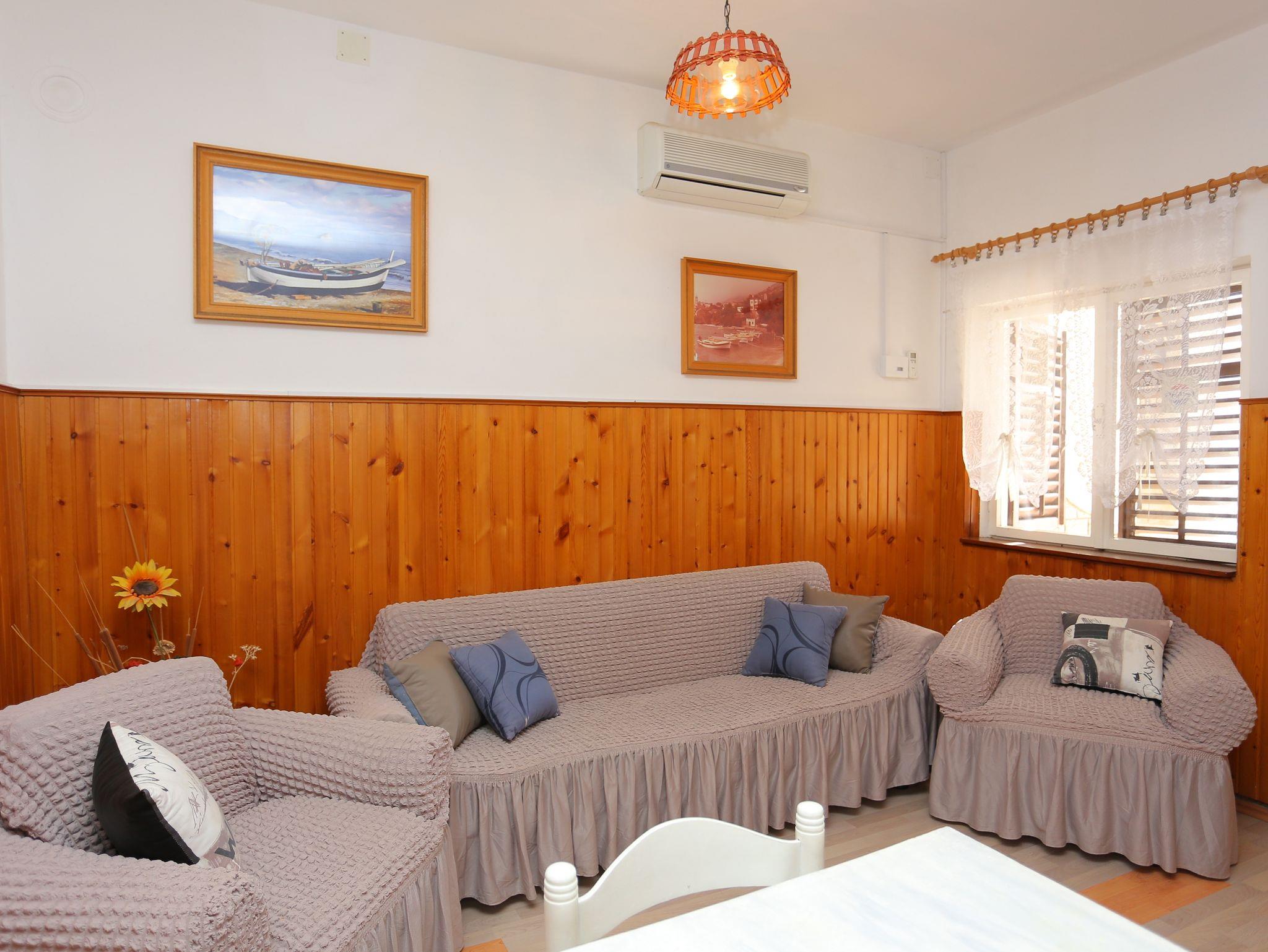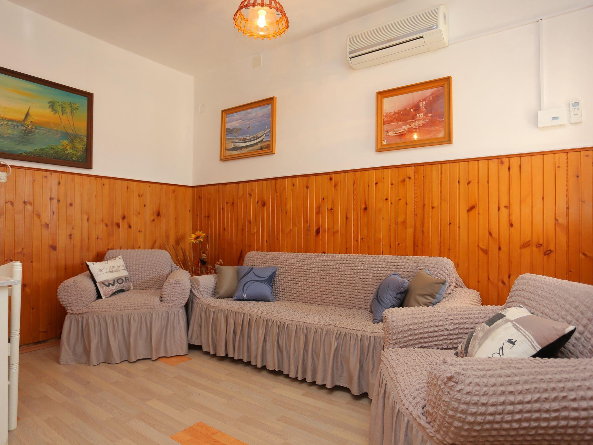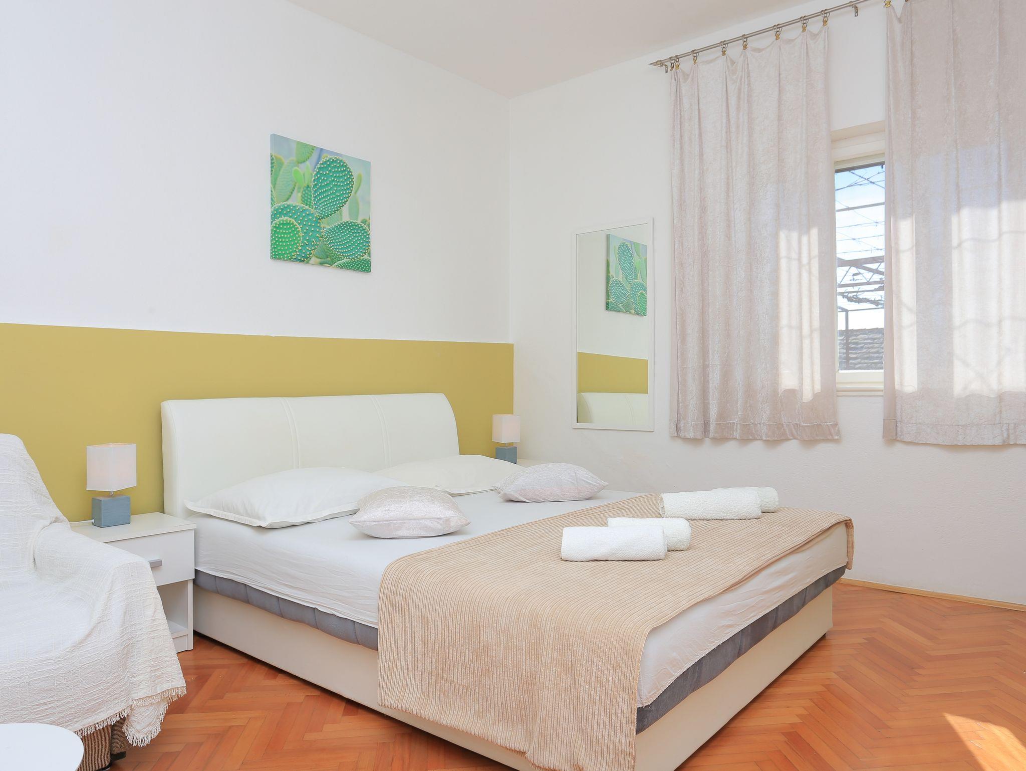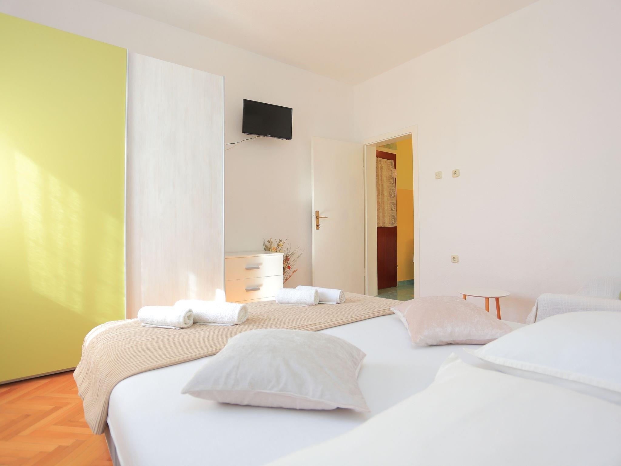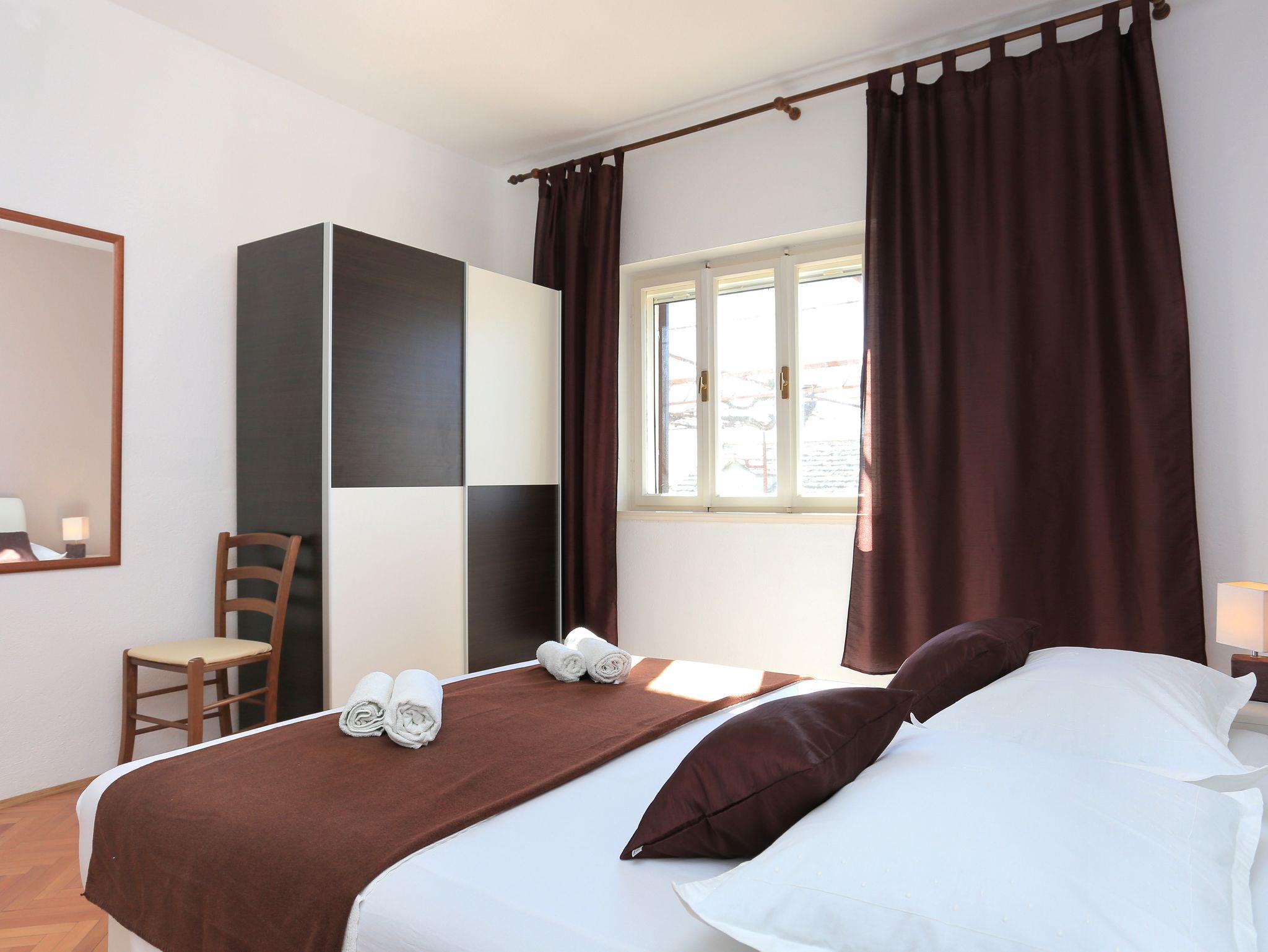 Ferienwohnung bietet Platz für 9 Gäste. Die Betten sind in Schlafzimmern, die es 3 gibt, und in Wohnzimmer, innerhalb einer Gesamtfläche von 78m2, angeordnet. Die Gäste haben eine eigene Terrasse zur Verfügung, auf der sie in warmen Sommernächten genießen können. Das Apartment bietet Meerblick. Es ist erlaubt, Speisen auf dem Gemeinschafts-Grill vorzubereiten. Räume der gebuchten Unterkunftseinheit werden nicht in eine Ganze verbunden. IM PREIS INBEGRIFFEN: Kurtaxe, Endreinigung, Klimatisierung, Parkplatz, Internet, Bügeleisen, Föhn. VERBINDLICHE ZUSÄTZLICHE KOSTEN: Aufzahlung für Kurzaufenthalte (prozentualer Zuschlag pro Nächtigungsanzahl: 30% - 1, 20% - 2, 10% - 3). UNVERBINDLICHE ZUSÄTZLICHE KOSTEN: Wäschewaschen (5,00 € Waschen). Die Verfügbarkeit zusätzlicher Dienstleistungen in Ihrem reservierten Termin und die Preise derselben (falls nicht aufgeführt) müssen im Voraus überprüft werden. Zusätzliche Dienstleistungen die in der Zahlungsaufforderung nicht aufgeführt sind werden direkt beim Vermieter bezahlt, angenommen der Gast nutzt auch diese.