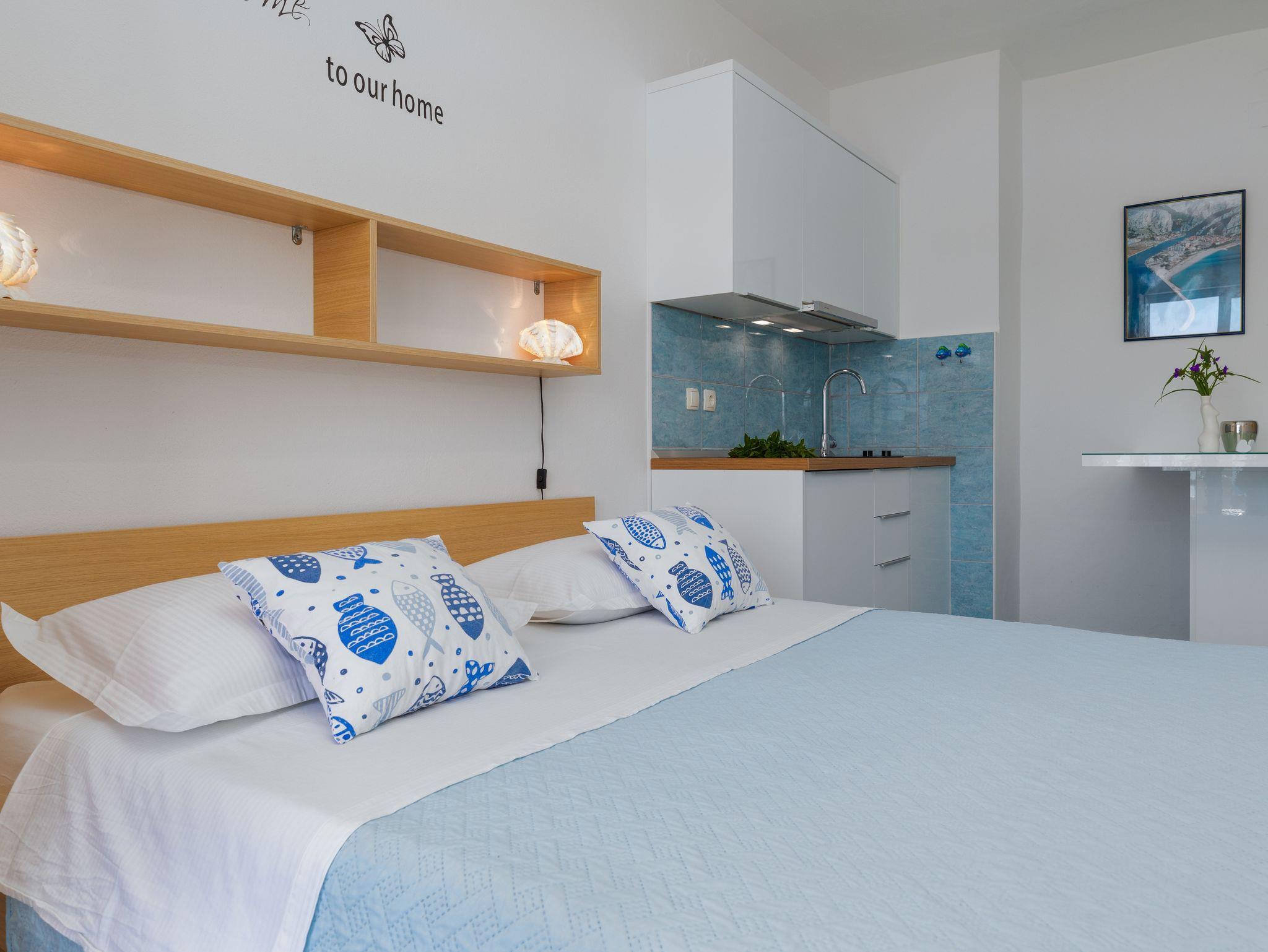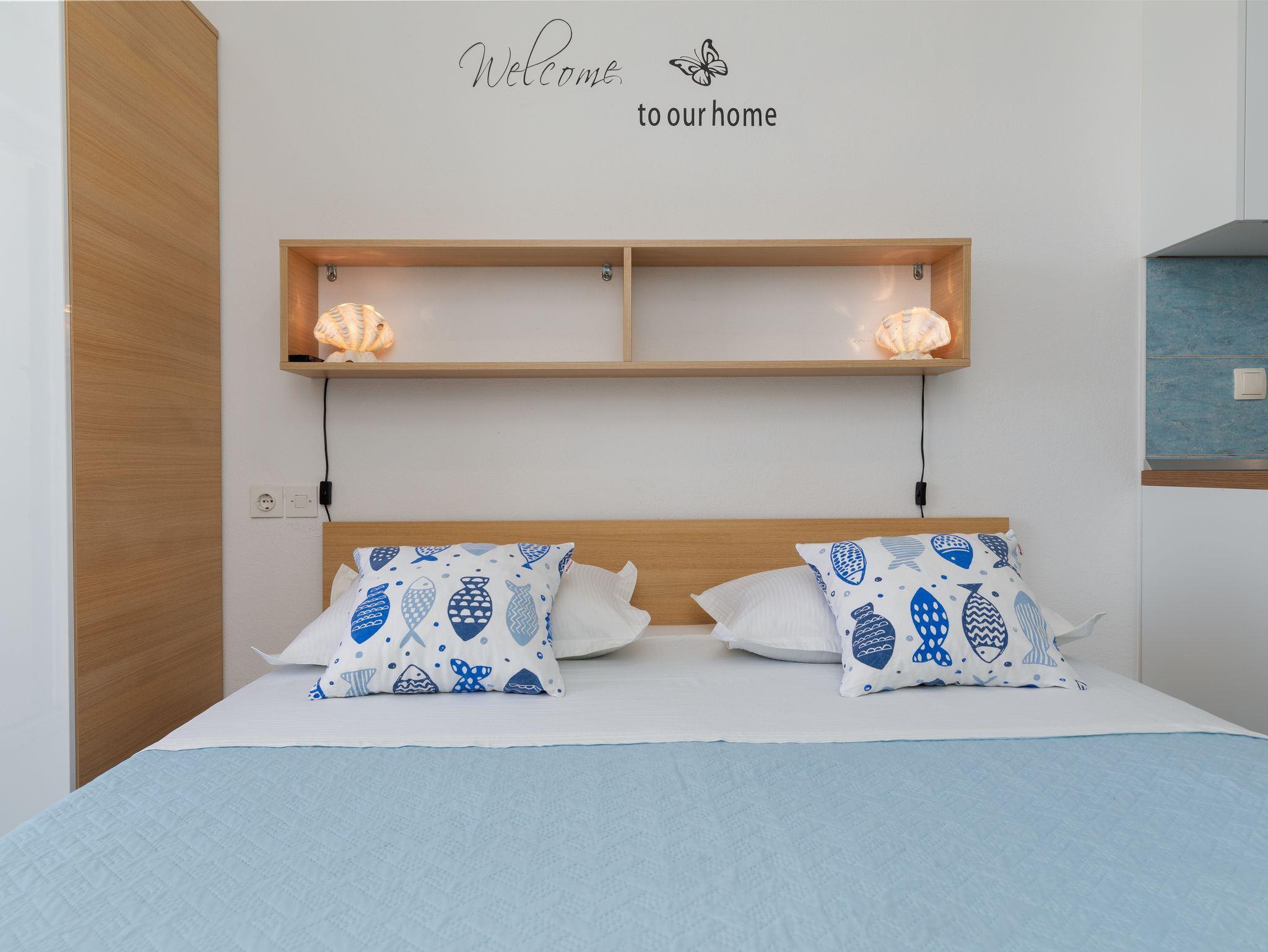 Studio bietet Platz für 2 Gäste. Die Betten sind in Schlafzimmern, die es 1 gibt, innerhalb einer Gesamtfläche von 18m2, angeordnet. Die Gäste haben einen eigenen Balkon zur Verfügung, auf der sie in warmen Sommernächten genießen können. Das Studio-Apartment bietet Meerblick. Es ist erlaubt, Speisen auf dem Gemeinschafts-Grill vorzubereiten. IM PREIS INBEGRIFFEN: Kurtaxe, Endreinigung, Parkplatz, Internet, Kinderbett, Bügeleisen, Bügelbrett, Föhn, Sonnenschirm. VERBINDLICHE ZUSÄTZLICHE KOSTEN: Aufzahlung für Kurzaufenthalte (prozentualer Zuschlag pro Nächtigungsanzahl: 30% - 1, 20% - 2, 10% - 3). UNVERBINDLICHE ZUSÄTZLICHE KOSTEN: Klimatisierung (0,50 € pro Stunde), Wäschewaschen (5,00 € Waschen). Die Verfügbarkeit zusätzlicher Dienstleistungen in Ihrem reservierten Termin und die Preise derselben (falls nicht aufgeführt) müssen im Voraus überprüft werden. Zusätzliche Dienstleistungen die in der Zahlungsaufforderung nicht aufgeführt sind werden direkt beim Vermieter bezahlt, angenommen der Gast nutzt auch diese. Ermäßigung auf den Grundpreis: Gratistag 28=25 (bei einem Aufenthalt von 28 oder mehr Tagen erhalten Sie 3 kostenlose Tage für den Aufenthalt bis 31.12.26).