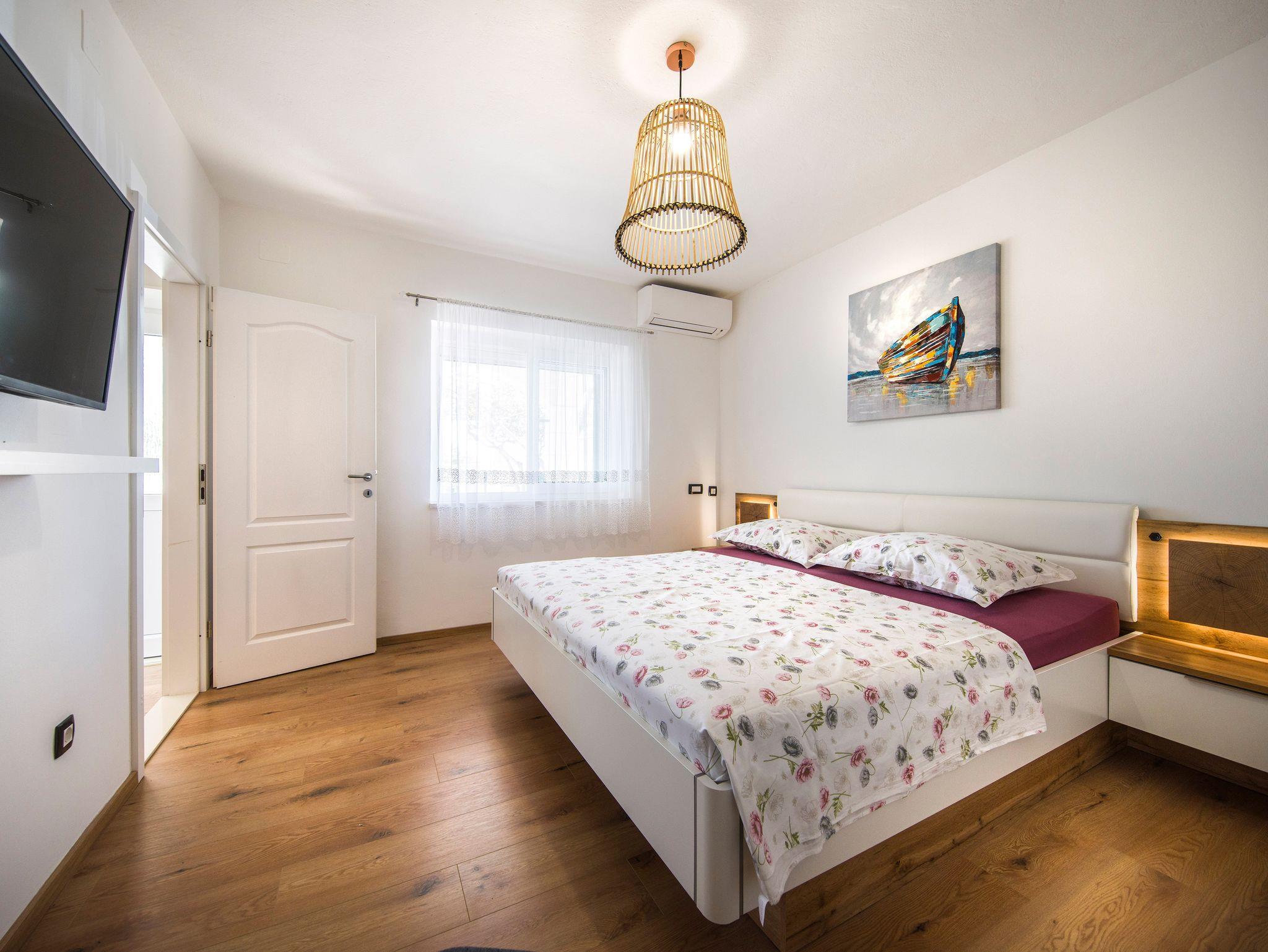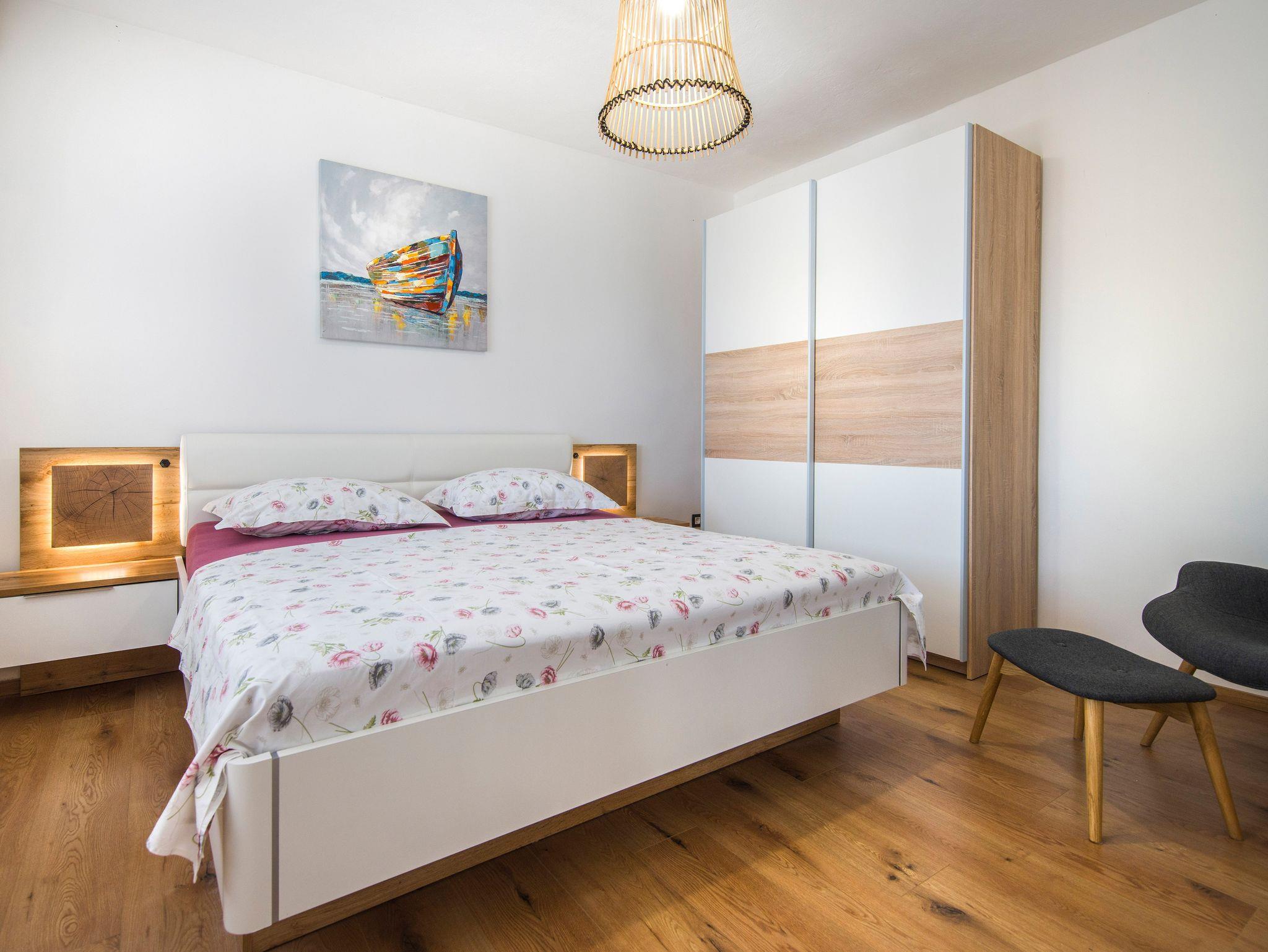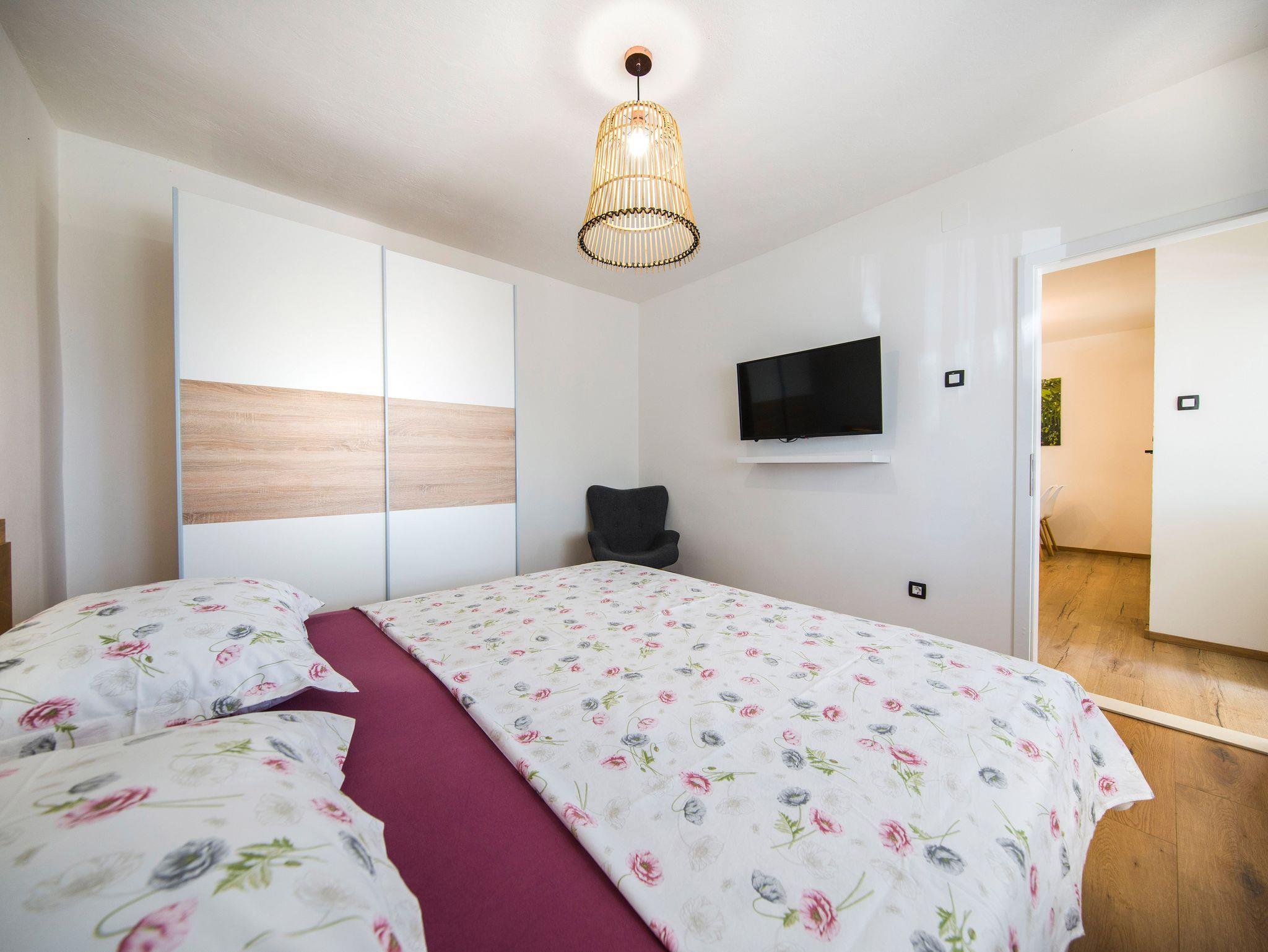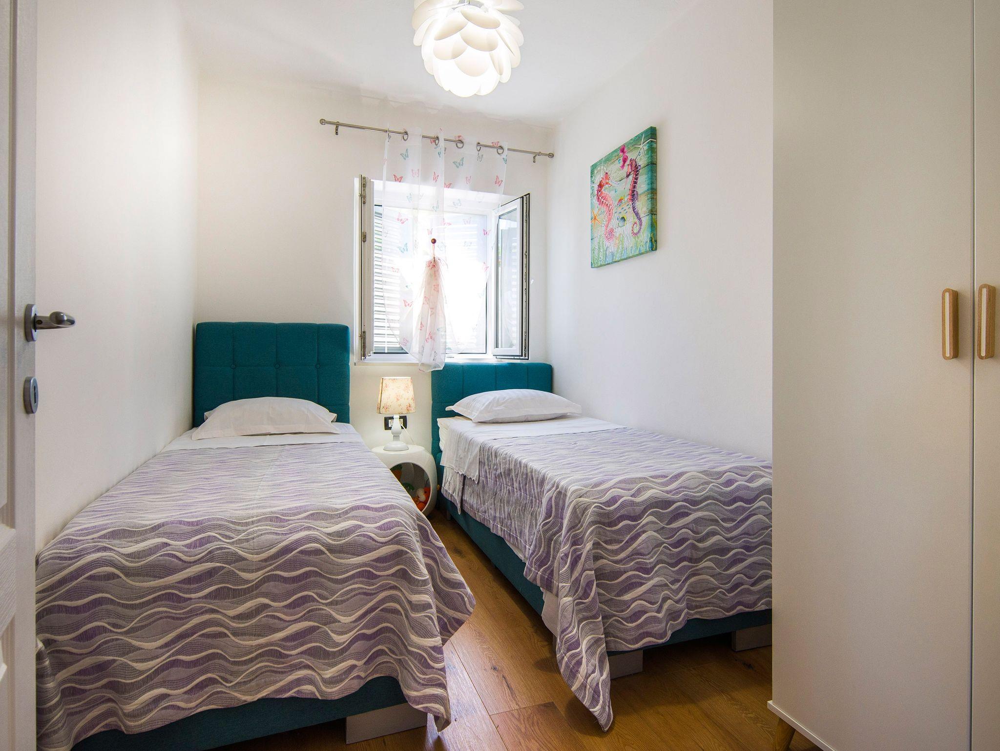 Ferienwohnung bietet Platz für 4 Gäste. Die Betten sind in Schlafzimmern, die es 2 gibt, innerhalb einer Gesamtfläche von 48m2, angeordnet. Die Gäste haben eine eigene Terrasse zur Verfügung, auf der sie in warmen Sommernächten genießen können. Das Apartment bietet Meerblick. Es ist erlaubt, Speisen auf dem Gemeinschafts-Grill vorzubereiten. IM PREIS INBEGRIFFEN: Kurtaxe, Endreinigung, Klimatisierung, Parkplatz, Garage, Internet, Kinderbett, Bügeleisen, Bügelbrett, Föhn. VERBINDLICHE ZUSÄTZLICHE KOSTEN: Aufzahlung für Kurzaufenthalte (prozentualer Zuschlag pro Nächtigungsanzahl: 30% - 1, 20% - 2, 10% - 3). Die Verfügbarkeit zusätzlicher Dienstleistungen in Ihrem reservierten Termin und die Preise derselben (falls nicht aufgeführt) müssen im Voraus überprüft werden. Zusätzliche Dienstleistungen die in der Zahlungsaufforderung nicht aufgeführt sind werden direkt beim Vermieter bezahlt, angenommen der Gast nutzt auch diese.