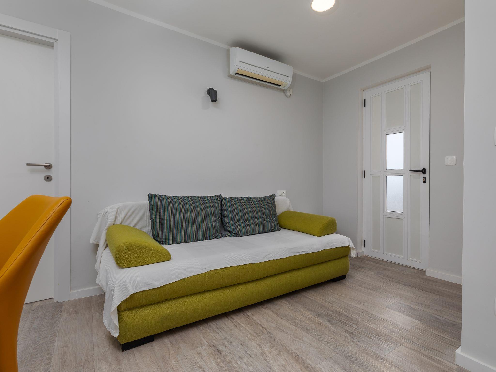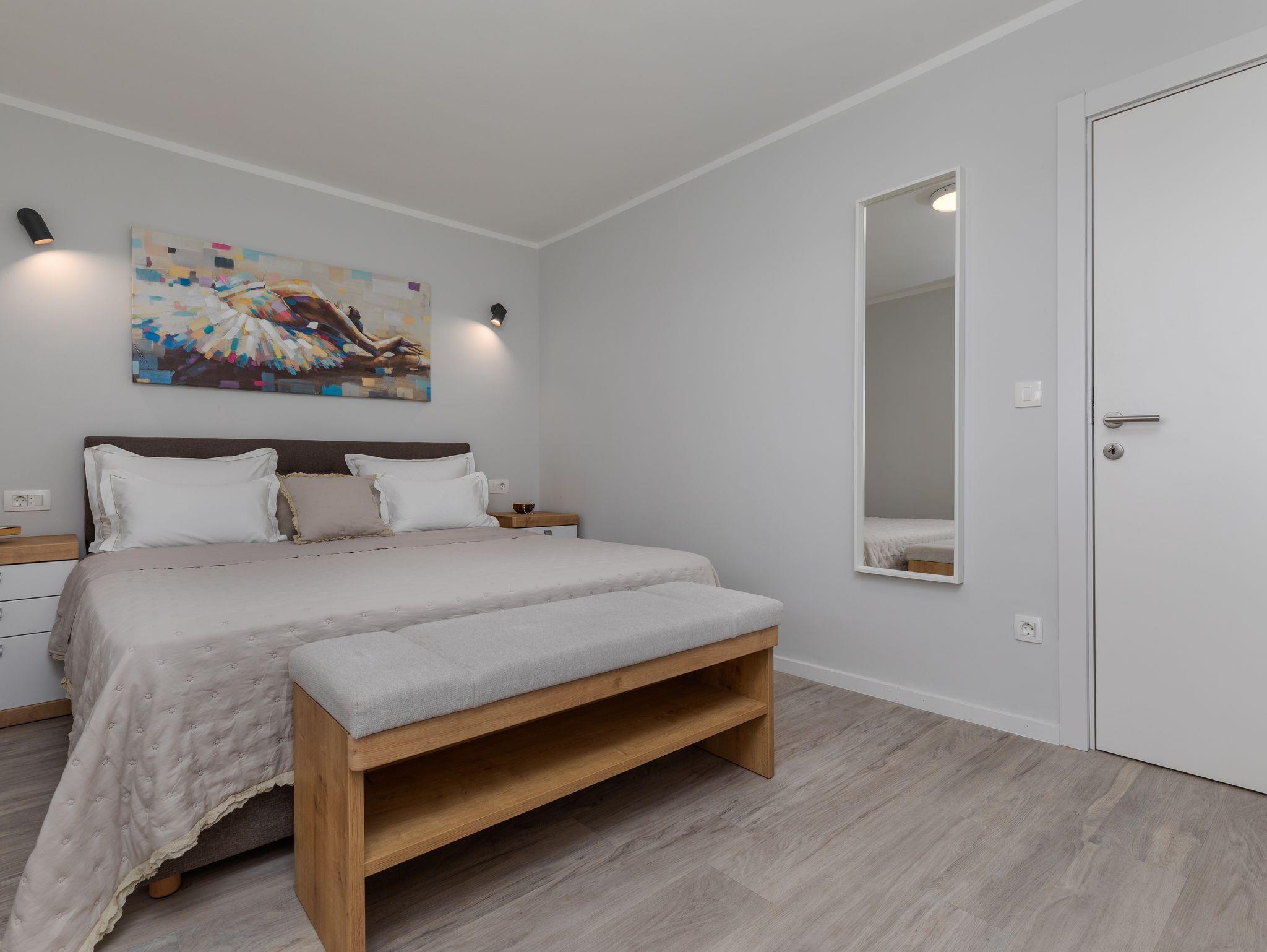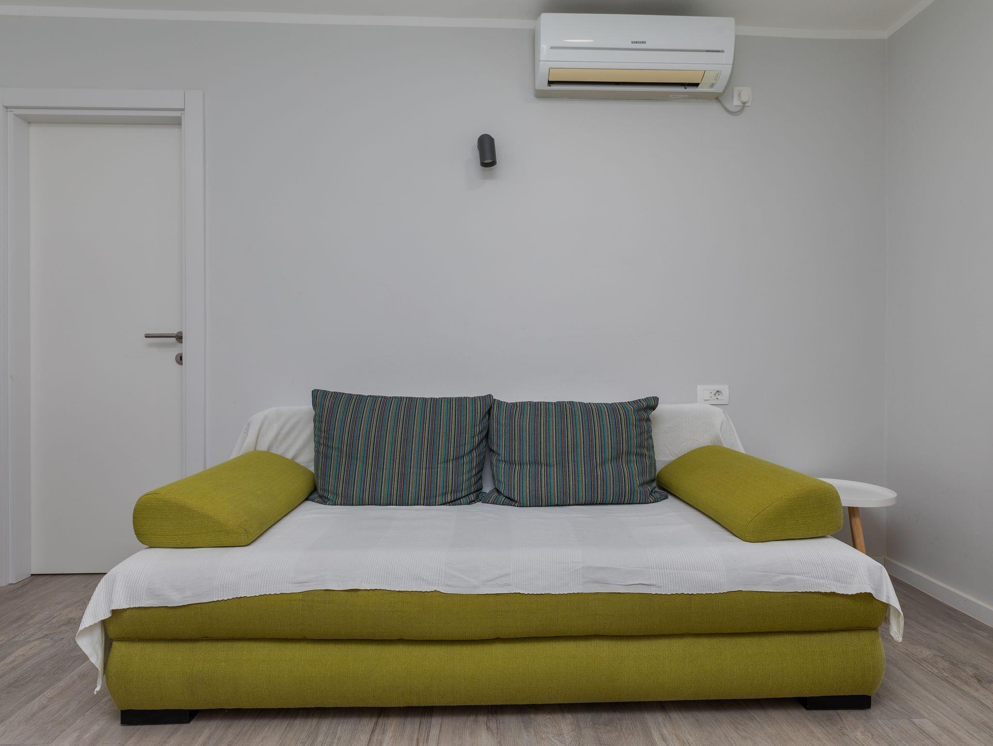 Ferienwohnung bietet Platz für 5 Gäste. Die Betten sind in Schlafzimmern, die es 2 gibt, und in Wohnzimmer, innerhalb einer Gesamtfläche von 38m2, angeordnet. Die Gäste haben eine eigene Terrasse zur Verfügung, auf der sie in warmen Sommernächten genießen können. Das Apartment bietet Meerblick. Es ist erlaubt, Speisen auf dem Gemeinschafts-Grill vorzubereiten. Während ihres Aufenthalts können Gäste das gemeinsam zur Nutzung stehende Schwimmbad benutzen. IM PREIS INBEGRIFFEN: Kurtaxe, Endreinigung, Klimatisierung, Pool, Parkplatz, Internet, Kinderbett, Bügeleisen, Bügelbrett, Föhn. VERBINDLICHE ZUSÄTZLICHE KOSTEN: Aufzahlung für Kurzaufenthalte (prozentualer Zuschlag pro Nächtigungsanzahl: 30% - 1, 20% - 2, 10% - 3). Die Verfügbarkeit zusätzlicher Dienstleistungen in Ihrem reservierten Termin und die Preise derselben (falls nicht aufgeführt) müssen im Voraus überprüft werden. Zusätzliche Dienstleistungen die in der Zahlungsaufforderung nicht aufgeführt sind werden direkt beim Vermieter bezahlt, angenommen der Gast nutzt auch diese.