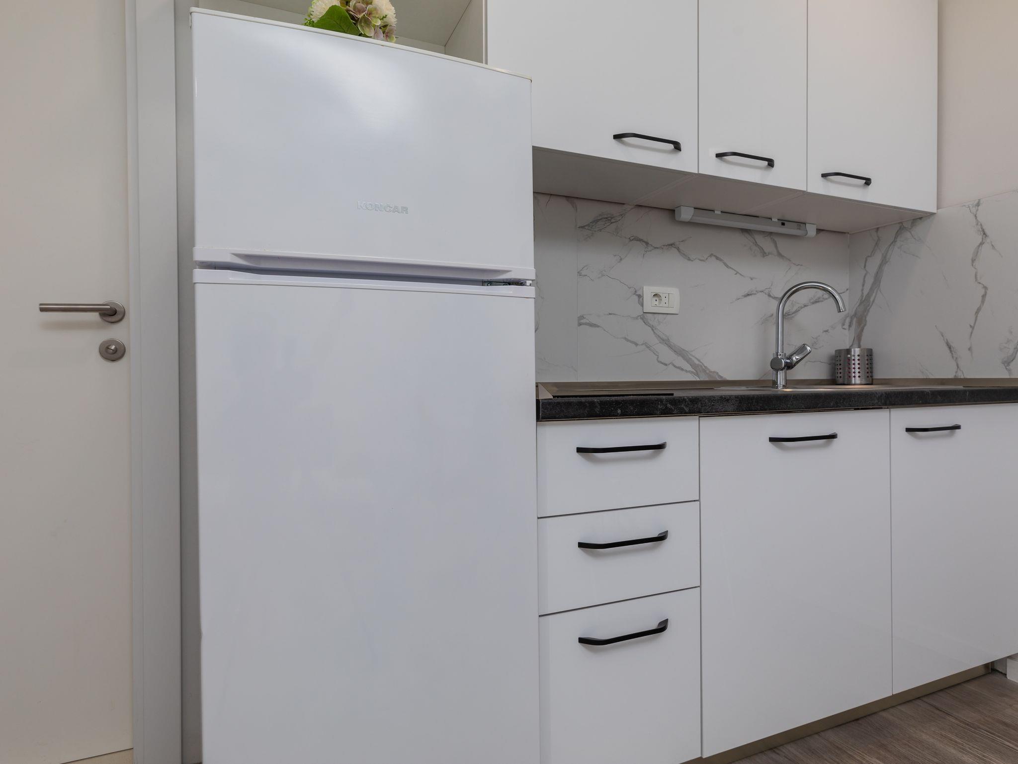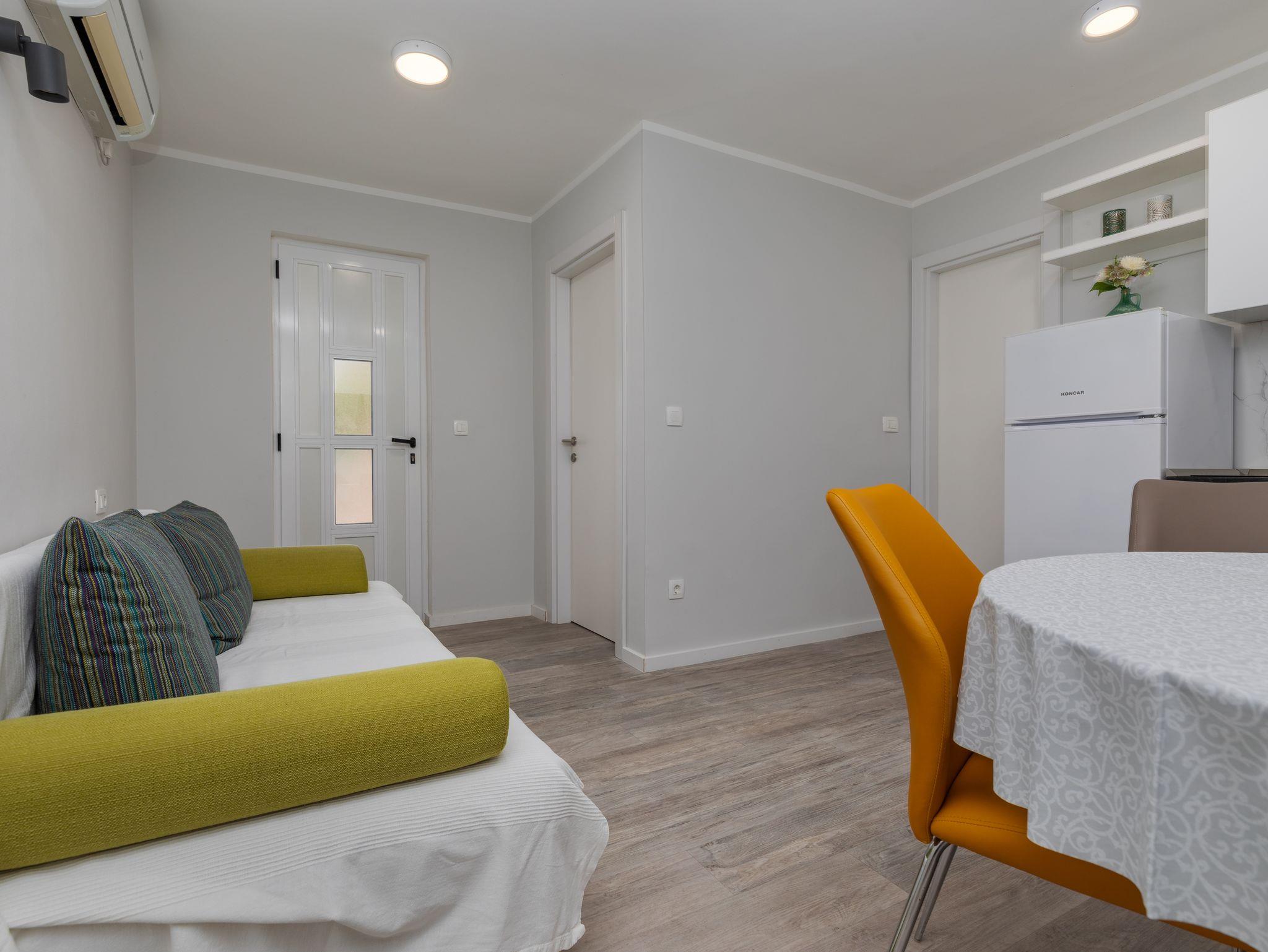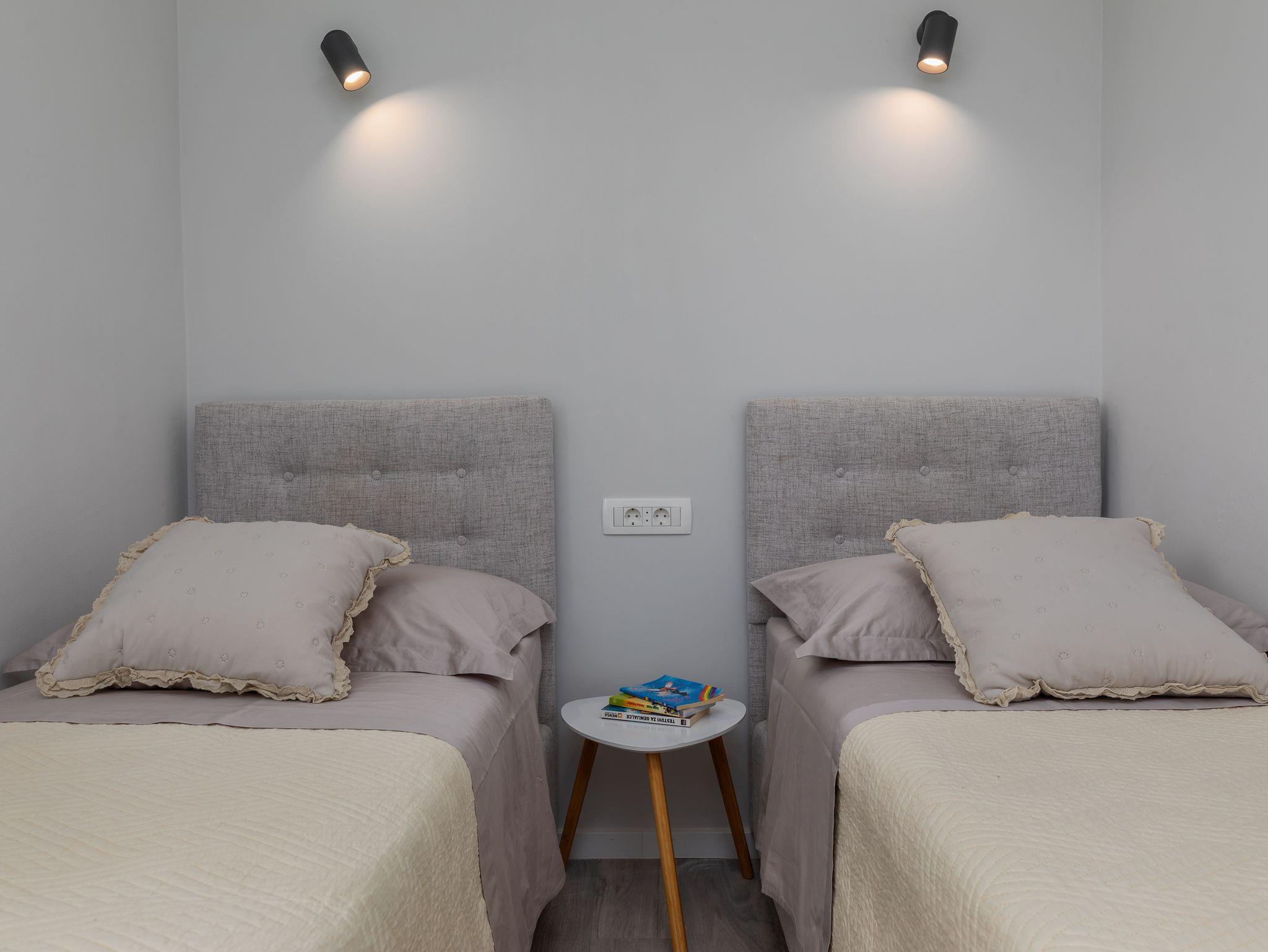 Ferienwohnung bietet Platz für 5 Gäste. Die Betten sind in Schlafzimmern, die es 2 gibt, und in Wohnzimmer, innerhalb einer Gesamtfläche von 38m2, angeordnet. Die Gäste haben eine eigene Terrasse zur Verfügung, auf der sie in warmen Sommernächten genießen können. Das Apartment bietet Meerblick. Es ist erlaubt, Speisen auf dem Gemeinschafts-Grill vorzubereiten. Während ihres Aufenthalts können Gäste das gemeinsam zur Nutzung stehende Schwimmbad benutzen. IM PREIS INBEGRIFFEN: Kurtaxe, Endreinigung, Klimatisierung, Pool, Parkplatz, Internet, Kinderbett, Bügeleisen, Bügelbrett, Föhn. VERBINDLICHE ZUSÄTZLICHE KOSTEN: Aufzahlung für Kurzaufenthalte (prozentualer Zuschlag pro Nächtigungsanzahl: 30% - 1, 20% - 2, 10% - 3). Die Verfügbarkeit zusätzlicher Dienstleistungen in Ihrem reservierten Termin und die Preise derselben (falls nicht aufgeführt) müssen im Voraus überprüft werden. Zusätzliche Dienstleistungen die in der Zahlungsaufforderung nicht aufgeführt sind werden direkt beim Vermieter bezahlt, angenommen der Gast nutzt auch diese.