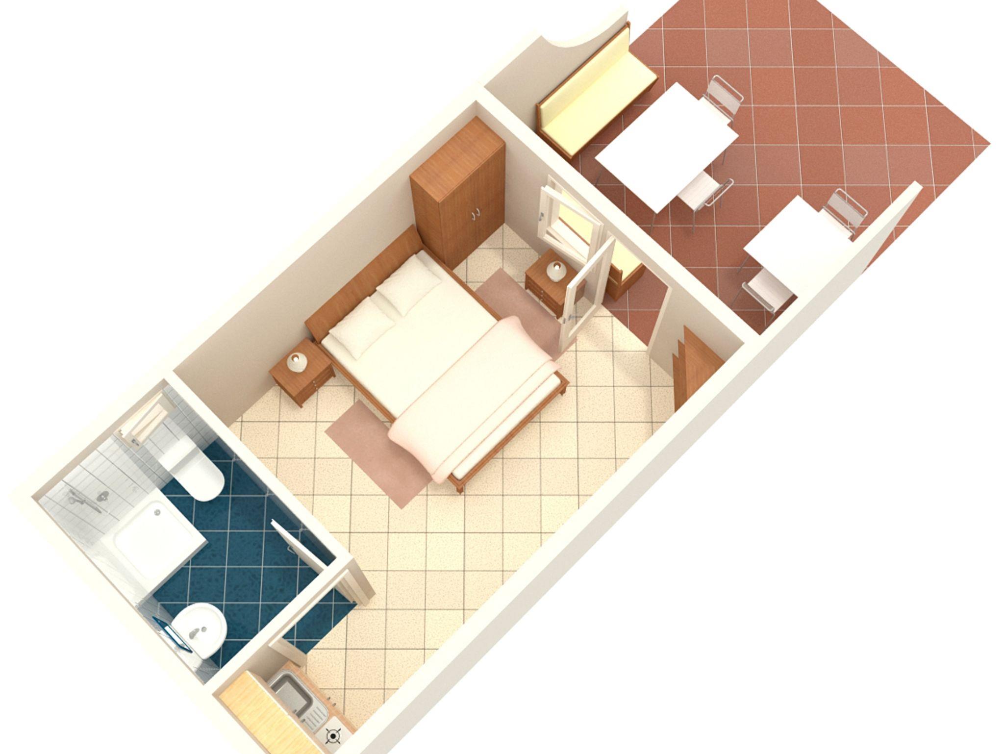 Studio bietet Platz für 2 Gäste. Die Betten sind in Schlafzimmern, die es 1 gibt, innerhalb einer Gesamtfläche von 20m2, angeordnet. Die Gäste haben eine eigene Terrasse zur Verfügung, auf der sie in warmen Sommernächten genießen können. Das Studio-Apartment bietet Meerblick. Es ist erlaubt, Speisen auf dem Gemeinschafts-Grill vorzubereiten. IM PREIS INBEGRIFFEN: Kurtaxe, Endreinigung, Parkplatz, Internet, Liegestühle. VERBINDLICHE ZUSÄTZLICHE KOSTEN: Aufzahlung für Kurzaufenthalte (prozentualer Zuschlag pro Nächtigungsanzahl: 30% - 1, 20% - 2, 10% - 3). UNVERBINDLICHE ZUSÄTZLICHE KOSTEN: Klimatisierung (5,00 € pro Nacht), 1 Bett für Kinder (5,00 € Person/Tag). Die Verfügbarkeit zusätzlicher Dienstleistungen in Ihrem reservierten Termin und die Preise derselben (falls nicht aufgeführt) müssen im Voraus überprüft werden. Zusätzliche Dienstleistungen die in der Zahlungsaufforderung nicht aufgeführt sind werden direkt beim Vermieter bezahlt, angenommen der Gast nutzt auch diese.