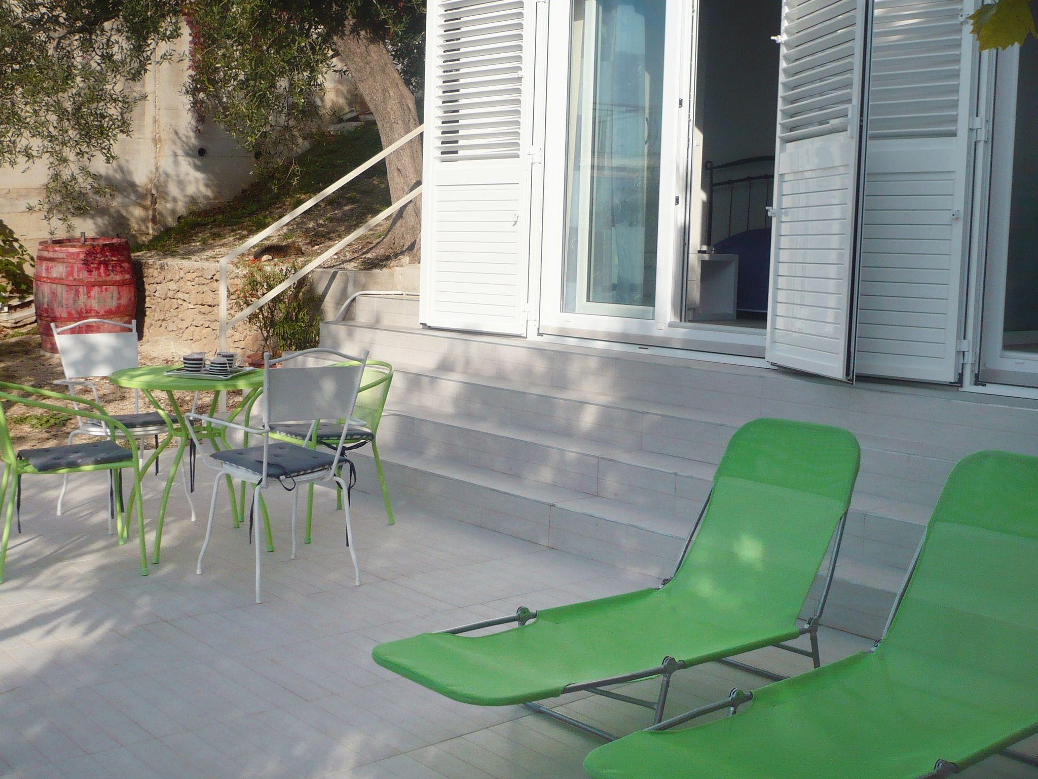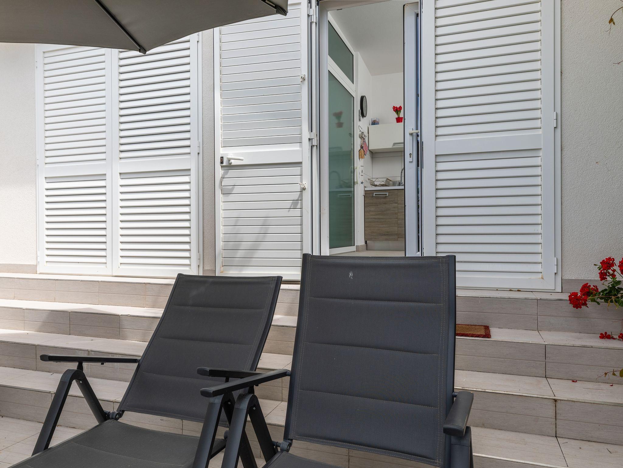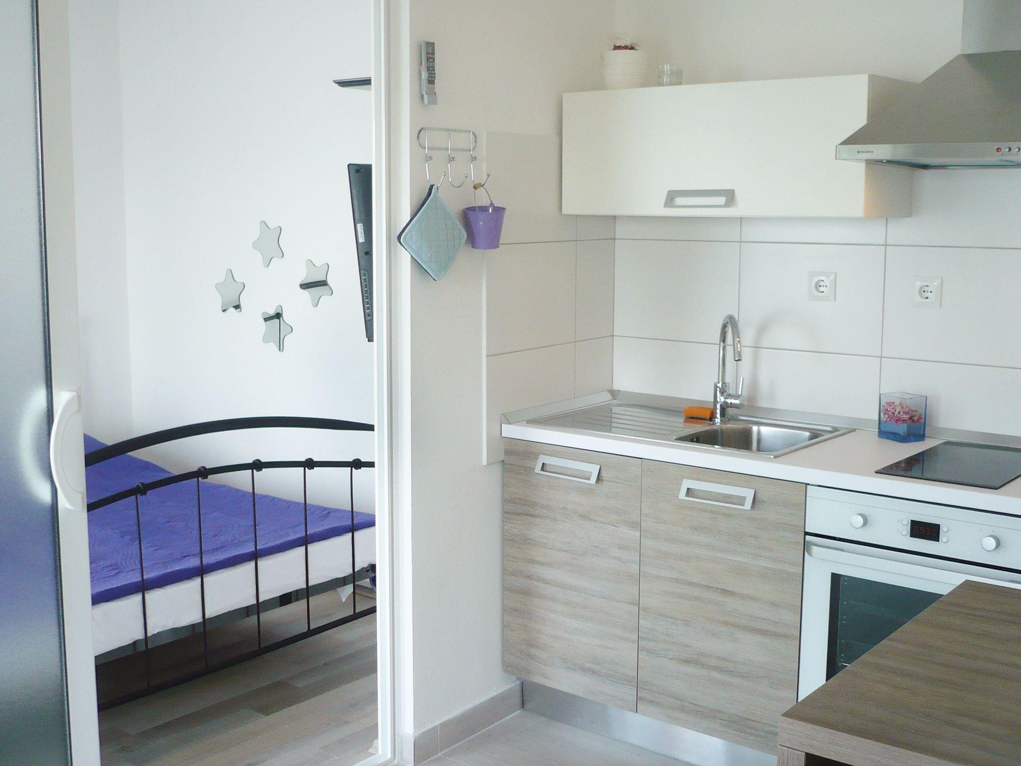 Studio bietet Platz für 2 Gäste. Die Betten sind in Schlafzimmern, die es 1 gibt, innerhalb einer Gesamtfläche von 25m2, angeordnet. Die Gäste haben eine eigene Terrasse zur Verfügung, auf der sie in warmen Sommernächten genießen können. Das Studio-Apartment bietet Meerblick. Es ist erlaubt, Speisen auf dem Gemeinschafts-Grill vorzubereiten. IM PREIS INBEGRIFFEN: Kurtaxe, Endreinigung, Klimatisierung, Parkplatz, Internet, Kinderbett, Bügeleisen, Bügelbrett, Föhn, tragbarer Grill. Die Verfügbarkeit zusätzlicher Dienstleistungen in Ihrem reservierten Termin und die Preise derselben (falls nicht aufgeführt) müssen im Voraus überprüft werden. Zusätzliche Dienstleistungen die in der Zahlungsaufforderung nicht aufgeführt sind werden direkt beim Vermieter bezahlt, angenommen der Gast nutzt auch diese.