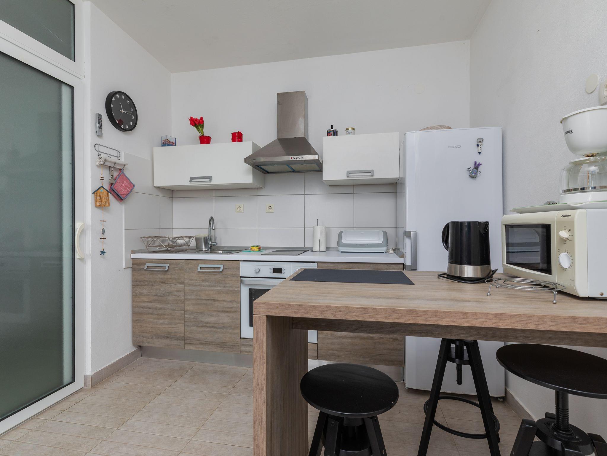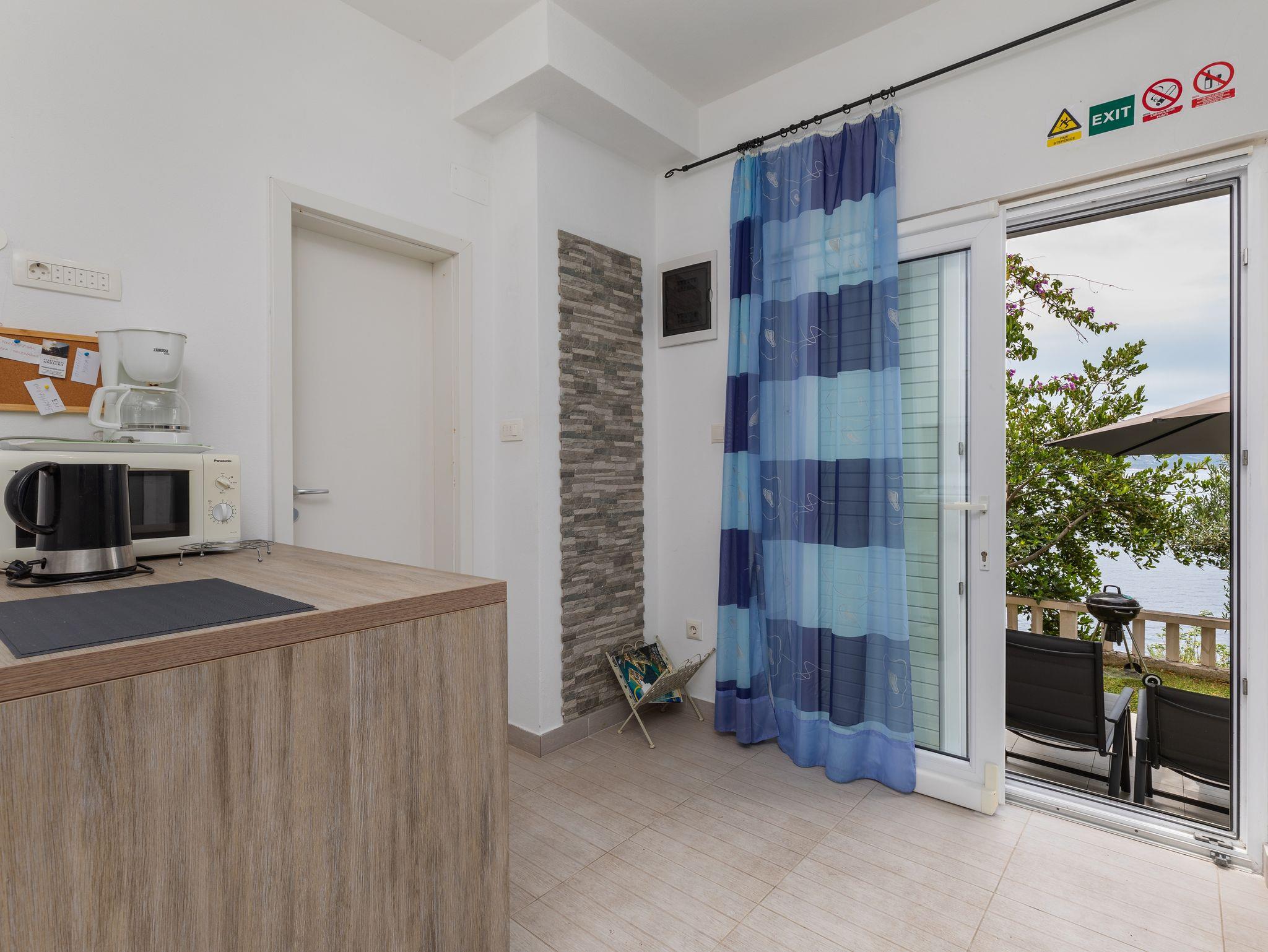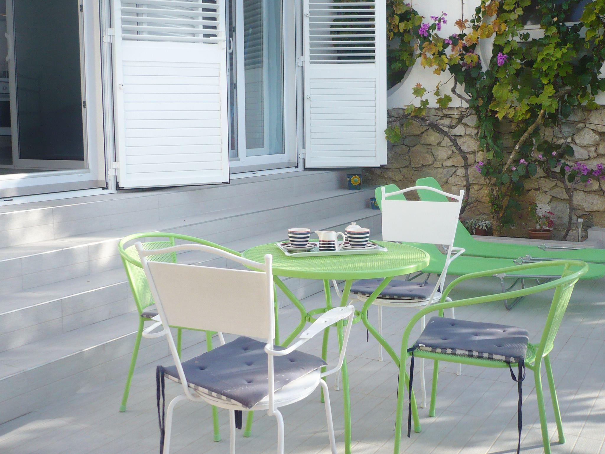 Studio bietet Platz für 2 Gäste. Die Betten sind in Schlafzimmern, die es 1 gibt, innerhalb einer Gesamtfläche von 25m2, angeordnet. Die Gäste haben eine eigene Terrasse zur Verfügung, auf der sie in warmen Sommernächten genießen können. Das Studio-Apartment bietet Meerblick. Es ist erlaubt, Speisen auf dem Gemeinschafts-Grill vorzubereiten. IM PREIS INBEGRIFFEN: Kurtaxe, Endreinigung, Klimatisierung, Parkplatz, Internet, Kinderbett, Bügeleisen, Bügelbrett, Föhn, tragbarer Grill. Die Verfügbarkeit zusätzlicher Dienstleistungen in Ihrem reservierten Termin und die Preise derselben (falls nicht aufgeführt) müssen im Voraus überprüft werden. Zusätzliche Dienstleistungen die in der Zahlungsaufforderung nicht aufgeführt sind werden direkt beim Vermieter bezahlt, angenommen der Gast nutzt auch diese.