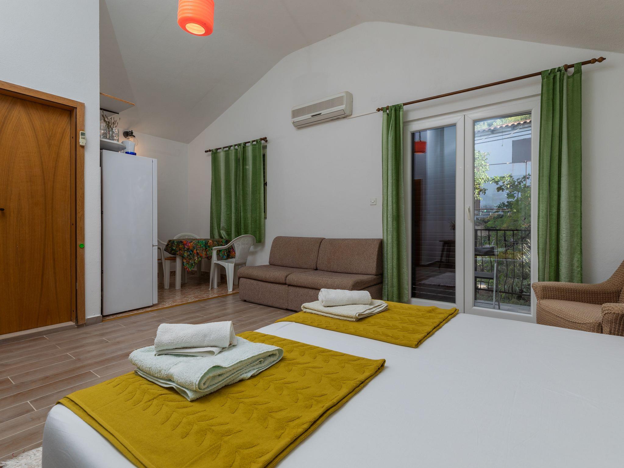 Studio bietet Platz für 3 Gäste. Die Betten sind in Schlafzimmern, die es 1 gibt, innerhalb einer Gesamtfläche von 21m2, angeordnet. Die Gäste haben einen eigenen Balkon zur Verfügung, auf der sie in warmen Sommernächten genießen können. Es ist erlaubt, Speisen auf dem Gemeinschafts-Grill vorzubereiten. IM PREIS INBEGRIFFEN: Kurtaxe, Endreinigung, Klimatisierung, Parkplatz, Internet, Bügeleisen, Bügelbrett, Föhn. VERBINDLICHE ZUSÄTZLICHE KOSTEN: Aufzahlung für Kurzaufenthalte (prozentualer Zuschlag pro Nächtigungsanzahl: 30% - 1, 20% - 2, 10% - 3). UNVERBINDLICHE ZUSÄTZLICHE KOSTEN: Wäschewaschen (10,00 € Waschen). Die Verfügbarkeit zusätzlicher Dienstleistungen in Ihrem reservierten Termin und die Preise derselben (falls nicht aufgeführt) müssen im Voraus überprüft werden. Zusätzliche Dienstleistungen die in der Zahlungsaufforderung nicht aufgeführt sind werden direkt beim Vermieter bezahlt, angenommen der Gast nutzt auch diese. Ermäßigung auf den Grundpreis: Gratistag 14=13 (bei einem Aufenthalt von 14 Tagen oder mehr erhalten Sie einen Gratistag für den Aufenthalt bis 31.12.26).