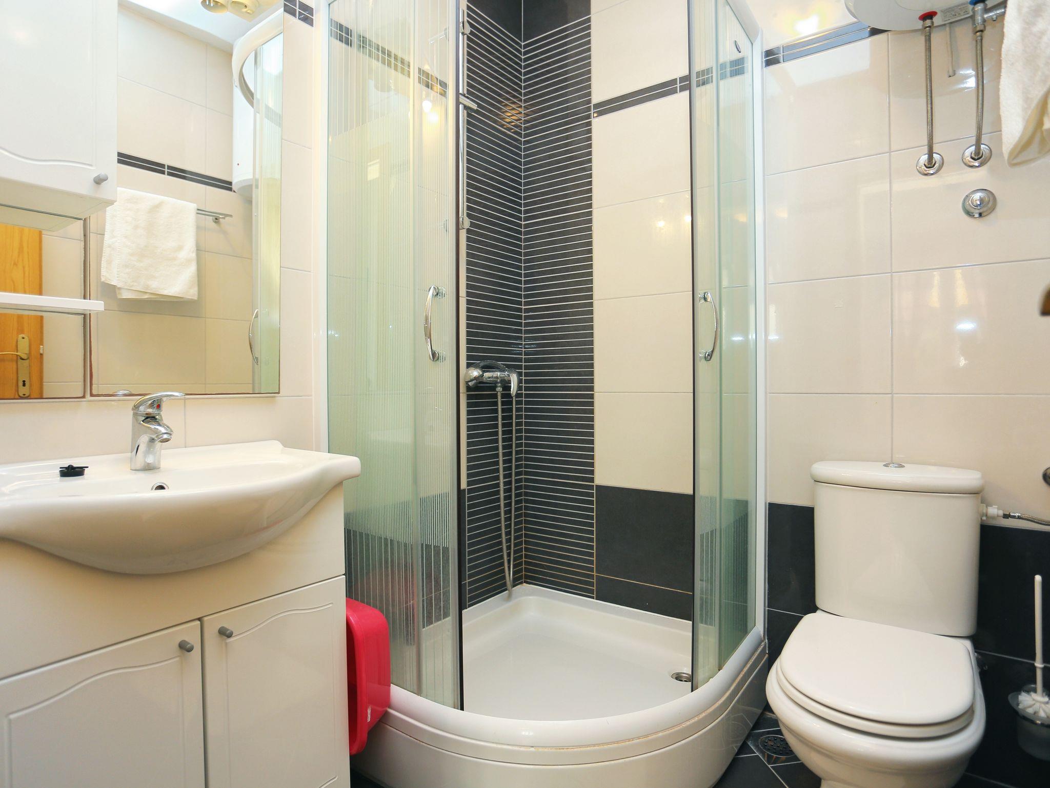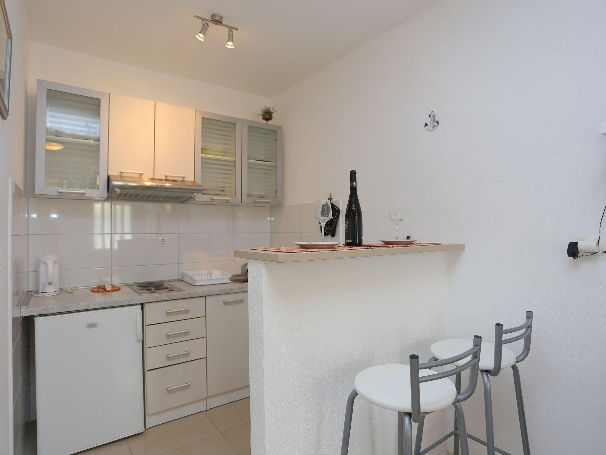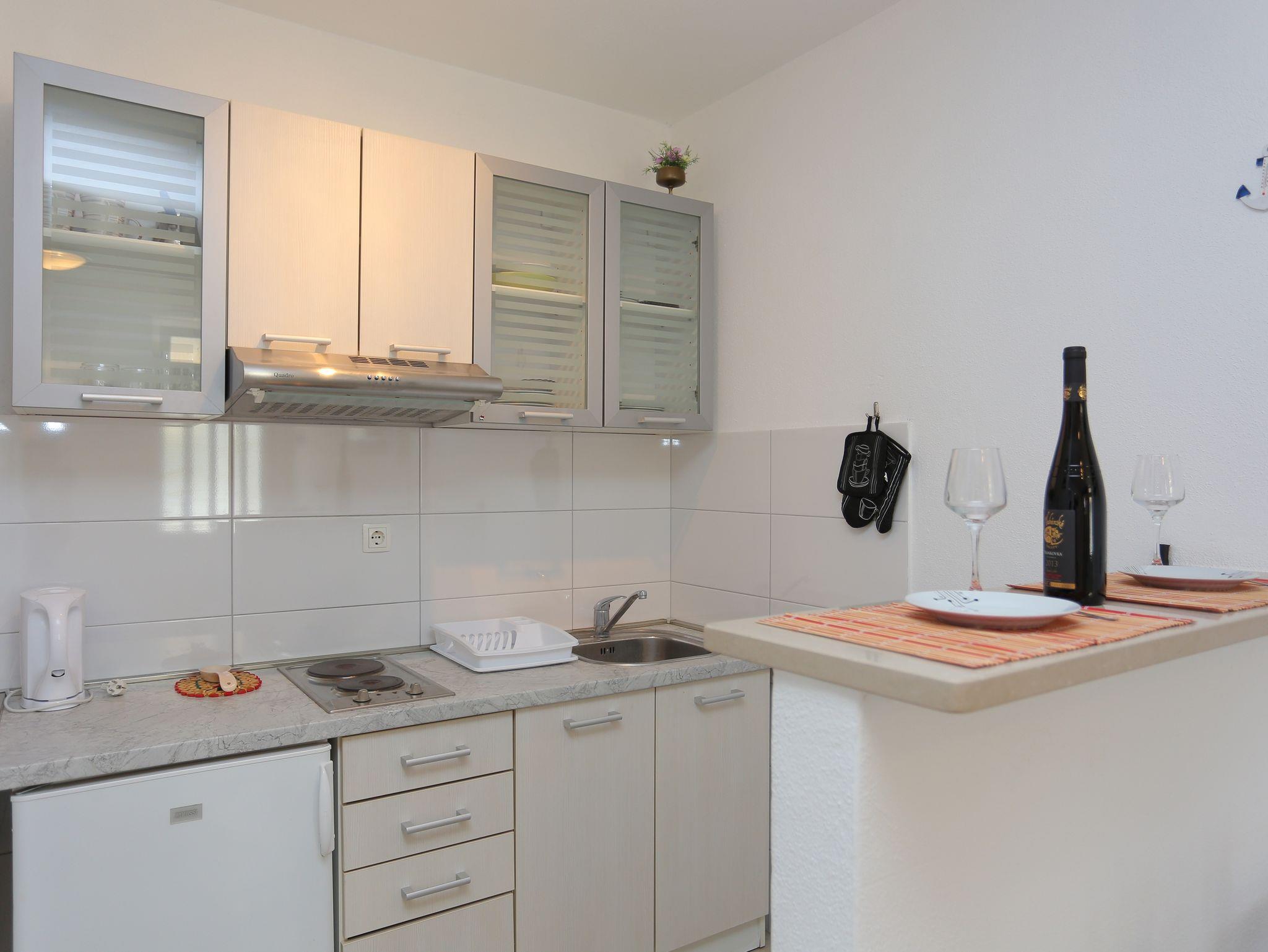 Studio bietet Platz für 2 Gäste. Die Betten sind in Schlafzimmern, die es 1 gibt, innerhalb einer Gesamtfläche von 21m2, angeordnet. Die Gäste haben eine eigene Terrasse zur Verfügung, auf der sie in warmen Sommernächten genießen können. Das Studio-Apartment bietet Meerblick. Für vollen Genuss und Entspannung gibt es einen privaten Grill für Gäste dieser Unterkunft. IM PREIS INBEGRIFFEN: Kurtaxe, Endreinigung, Klimatisierung, Parkplatz, Internet, tragbarer Grill. VERBINDLICHE ZUSÄTZLICHE KOSTEN: Aufzahlung für Kurzaufenthalte (prozentualer Zuschlag pro Nächtigungsanzahl: 30% - 1, 20% - 2, 10% - 3). UNVERBINDLICHE ZUSÄTZLICHE KOSTEN: 1 Bett für Kinder (5,00 € Person/Tag). Die Verfügbarkeit zusätzlicher Dienstleistungen in Ihrem reservierten Termin und die Preise derselben (falls nicht aufgeführt) müssen im Voraus überprüft werden. Zusätzliche Dienstleistungen die in der Zahlungsaufforderung nicht aufgeführt sind werden direkt beim Vermieter bezahlt, angenommen der Gast nutzt auch diese. Ermäßigung auf den Grundpreis: Gratistag 14=13 (bei einem Aufenthalt von 14 Tagen oder mehr erhalten Sie einen Gratistag für den Aufenthalt bis 31.12.26).